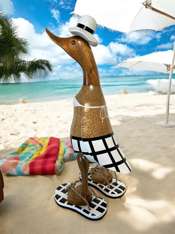 Bekleidet mit einem schwarz-weiß karierten Bikini, dazu passende Badelatschen und ein Sonnenhut, versprüht die Holzente Sommerlaune. Die sorgfältige Handbemalung und die handgeschnitzten Details verleihen ihr eine ganz besondere Optik.