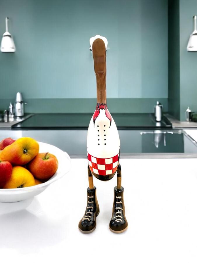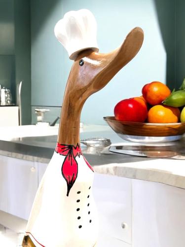 Die Holzente „Koch“ ist nicht nur ein humorvolles Dekorationselement, sondern auch ein handgefertigtes Unikat, das in jeder Küche für gute Laune sorgt.