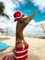 Die Ente trägt einen klassischen roten Badeanzug mit weißen Streifen, kombiniert mit passenden Badelatschen und einem leichten Sonnenhut. Das Design erinnert an den Charme vergangener Badezeiten und sorgt mit ihrer witzigen Optik für einen echten Hingucker.