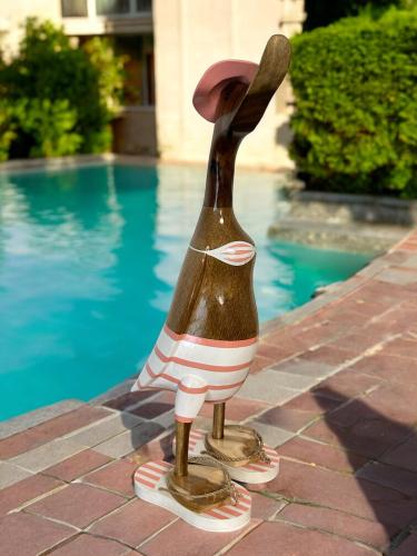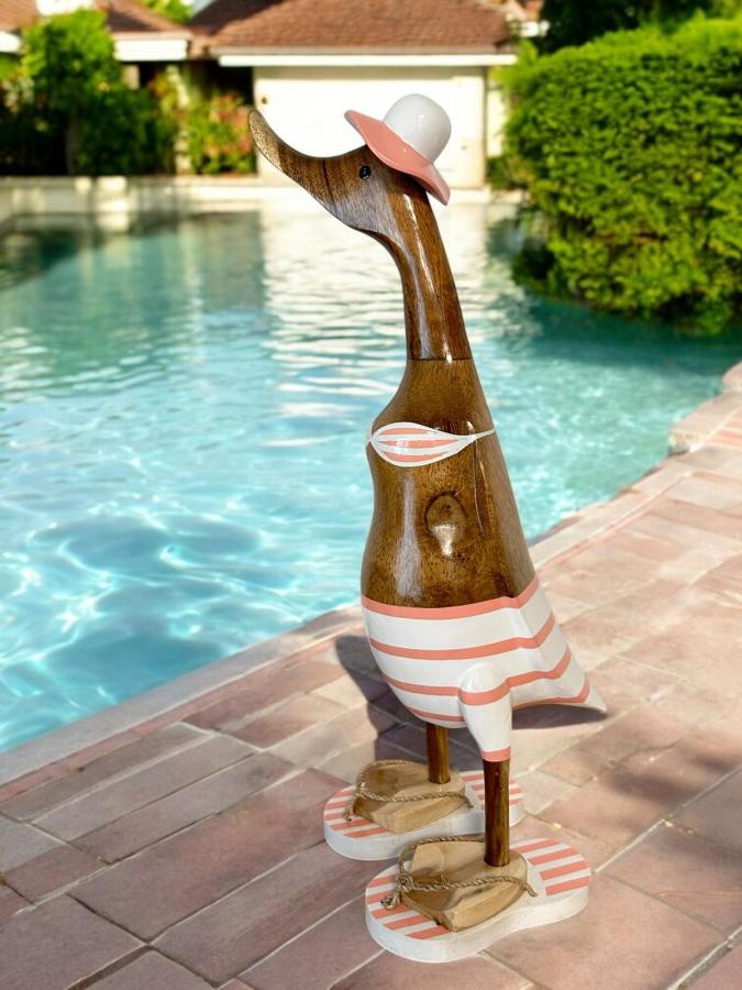 Diese Ente aus Holz im rosa-weißen Bikini bringt eine fröhliche Sommerstimmung in Ihr Zuhause. Von Hand aus einer Bambuswurzel geschnitzt, überzeugt sie mit einzigartigen Details und liebevoller Bemalung. Mit einer Höhe von ca. 44 cm ist diese charmante Dekoente ideal für verschiedene Einsatzbereiche.