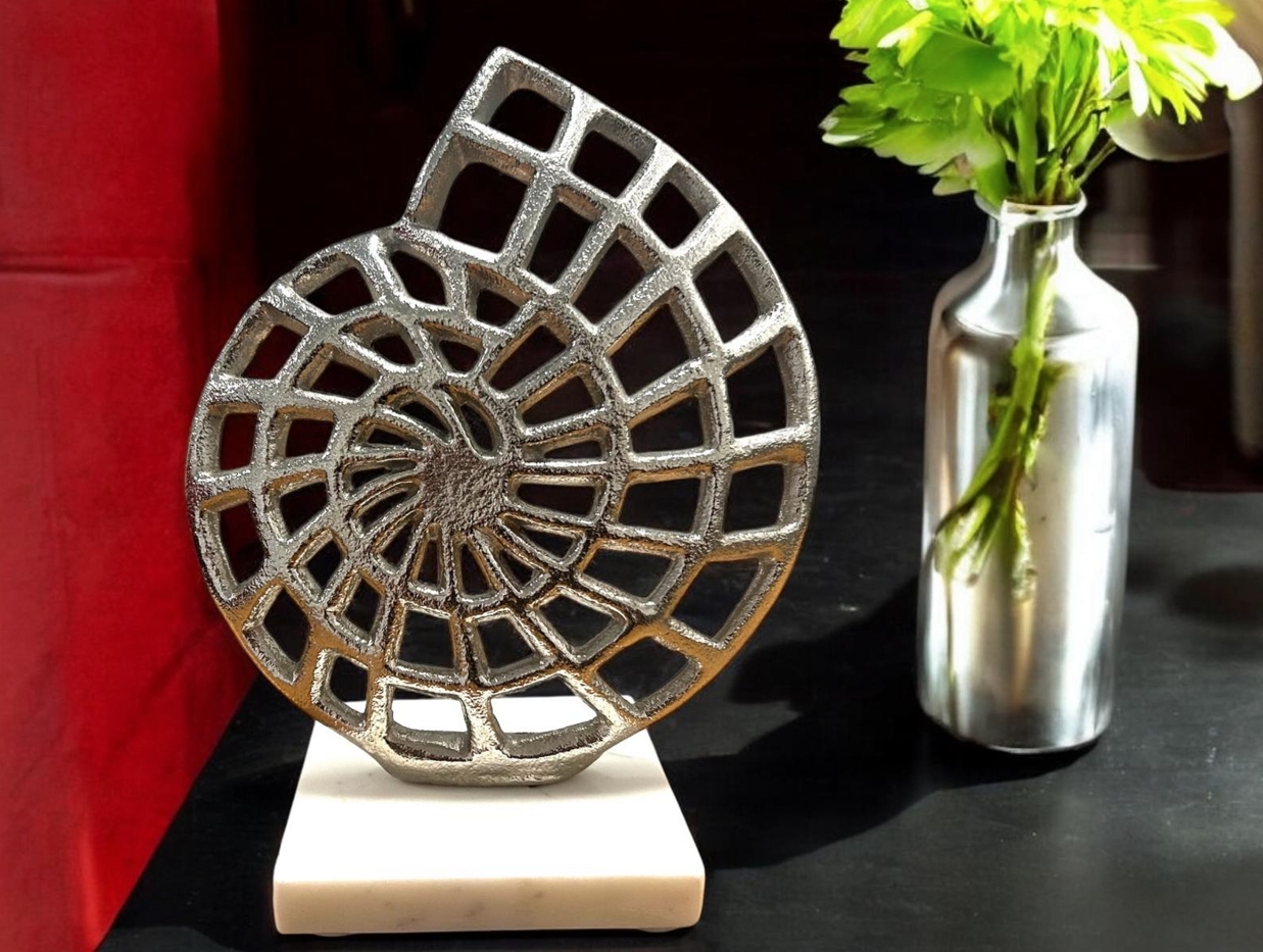 Dekoration Muschel ist ein elegantes Accessoire, das modernes Design mit maritimen Elementen verbindet. Die Muschel besteht aus hochwertigem Aluminium mit einer leicht polierten Oberfläche und beeindruckt durch ihre außergewöhnliche Gitterstruktur. Sie steht auf einem Sockel aus weißem Marmor, der die Kombination aus Eleganz und Natürlichkeit perfekt abrundet.