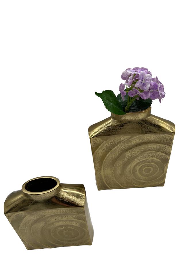 Abmessungen: ca. Vase 1: B17 x T6 x H20 cm, B22 x T6,5 x H 27 cm Eigenschaften: Vasen aus Nickel in Goldoptik Lieferzeit: Die Auslieferung erfolgt ab unserem Lager in der Regel innerhalb 4-5 Tage nach Eingang des Auftrages.