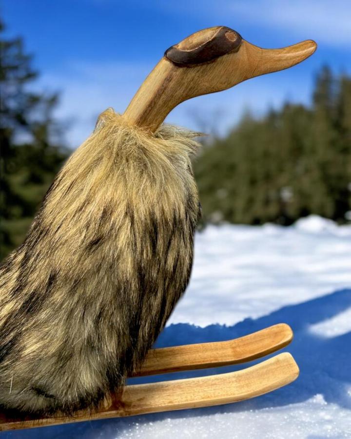 Skifahrende Ente mit Fell, Skibrille und Holzskiern |