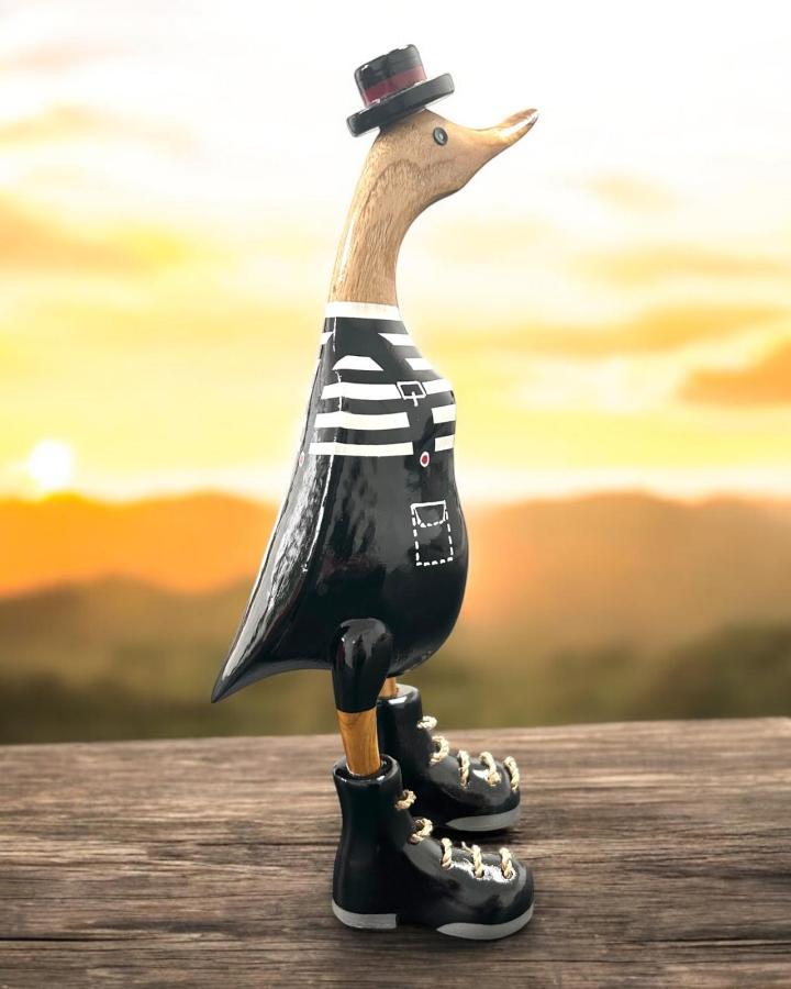Die geschnitzte Holzente „Pantomime“ ist eine handgefertigte Dekorationsfigur aus Holz mit einer Höhe von ca. 35 cm. Das Design der Ente orientiert sich am klassischen Pantomime-Stil: Sie trägt einen schwarz-weiß gestreiften Pullover, eine schwarze Latzhose, schwarze Stiefel und einen schwarzen Hut.