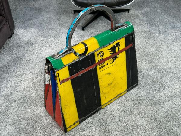 Entdecken Sie eines der ungewöhnlichsten Dekorationsstücke – eine Handtasche aus Alteisen, kunstvoll gefertigt aus recycelten Ölfässern. Dieses spektakuläre Objekt fällt mit seiner außergewöhnlichen Größe und seiner farbenfrohen Erscheinung sofort ins Auge. Die Handtasche misst 70 cm in der Breite, 75 cm in der Höhe und hat eine Tiefe von 26 cm. Durch die kreative Verwendung von alten Materialien wurde diese Handtasche zu einem einzigartigen Kunstwerk, das nicht nur als Accessoire, sondern auch als beeindruckendes Dekoelement im Wohnbereich dient.