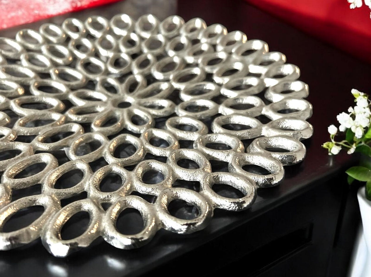 Die Obstschale "Elia" ist ein wahres Schmuckstück für Ihr Zuhause. Gefertigt aus hochwertigem, vernickeltem Aluminium in edlem Silber, besticht sie durch ihr raffiniertes Muster aus aneinandergelegten Ringen. Mit einem Durchmesser von 31 cm und einer Höhe von 5 cm ist diese Schale die perfekte Wahl, um Obst, Dekorationen oder andere Accessoires stilvoll zu präsentieren.