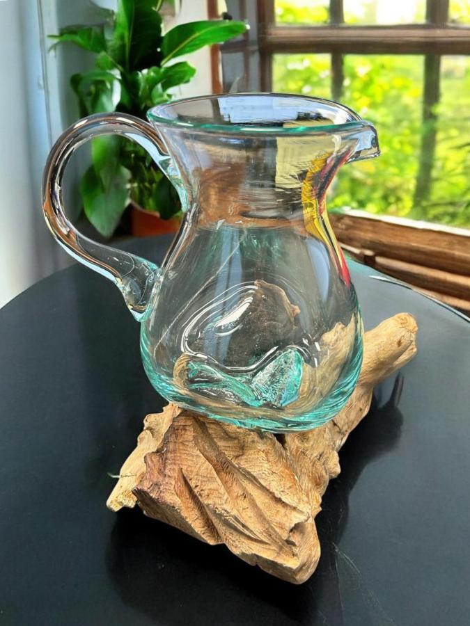 Vase aus Glas mit Holzfuß "LIDA" – Handarbeit in Krugform