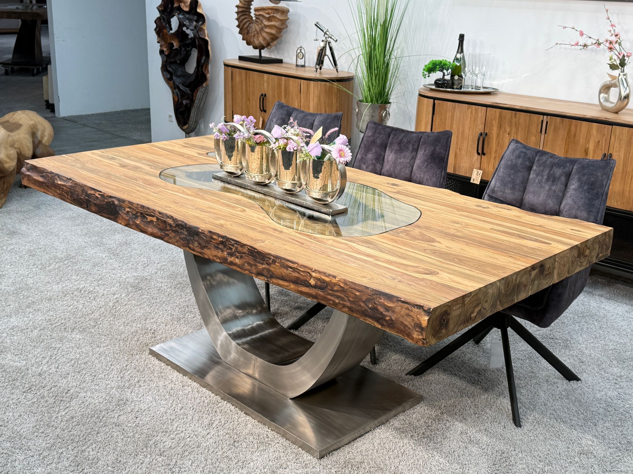 Modell: Esstisch "Deep Island" mit einem Tischgestell aus Edelstahl "Halbmond"