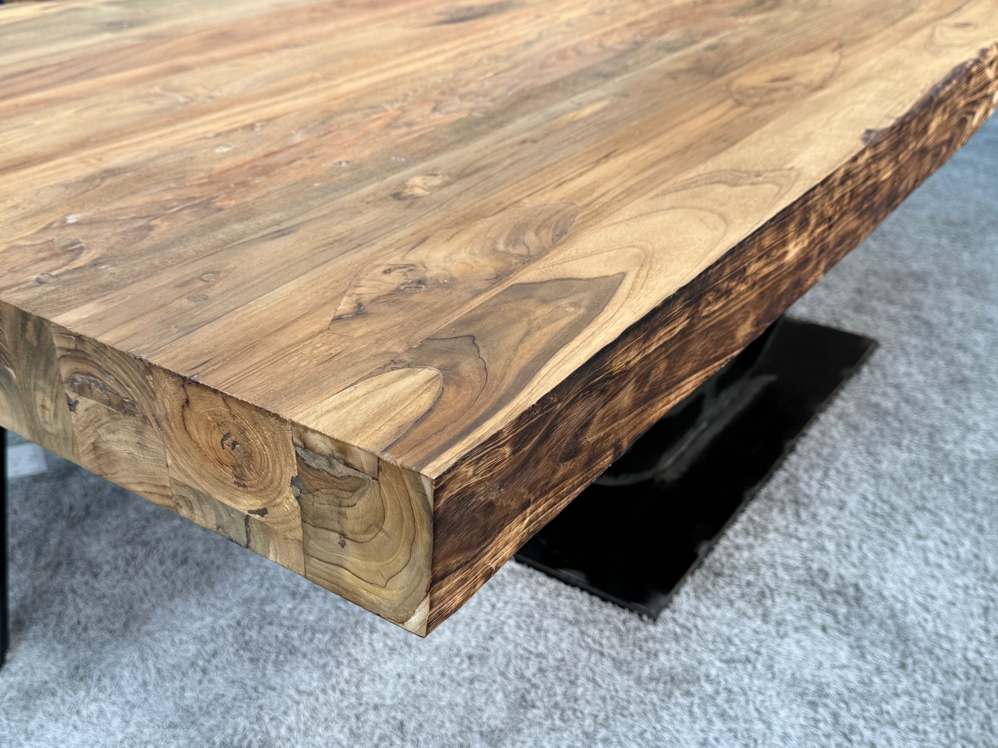 Das robuste Tischgestell wurde in Halbmondform aus Rohstahl gefertigt. Diese Kombination aus massivem Holz und Metall unterstreicht den modernen, industriellen Stil und sorgt für hohe Standfestigkeit. Der Tisch ist für 8 bis 10 Personen ausgelegt und eignet sich ideal für den Einsatz in großen Esszimmern, offenen Wohnbereichen oder Besprechungsräumen.