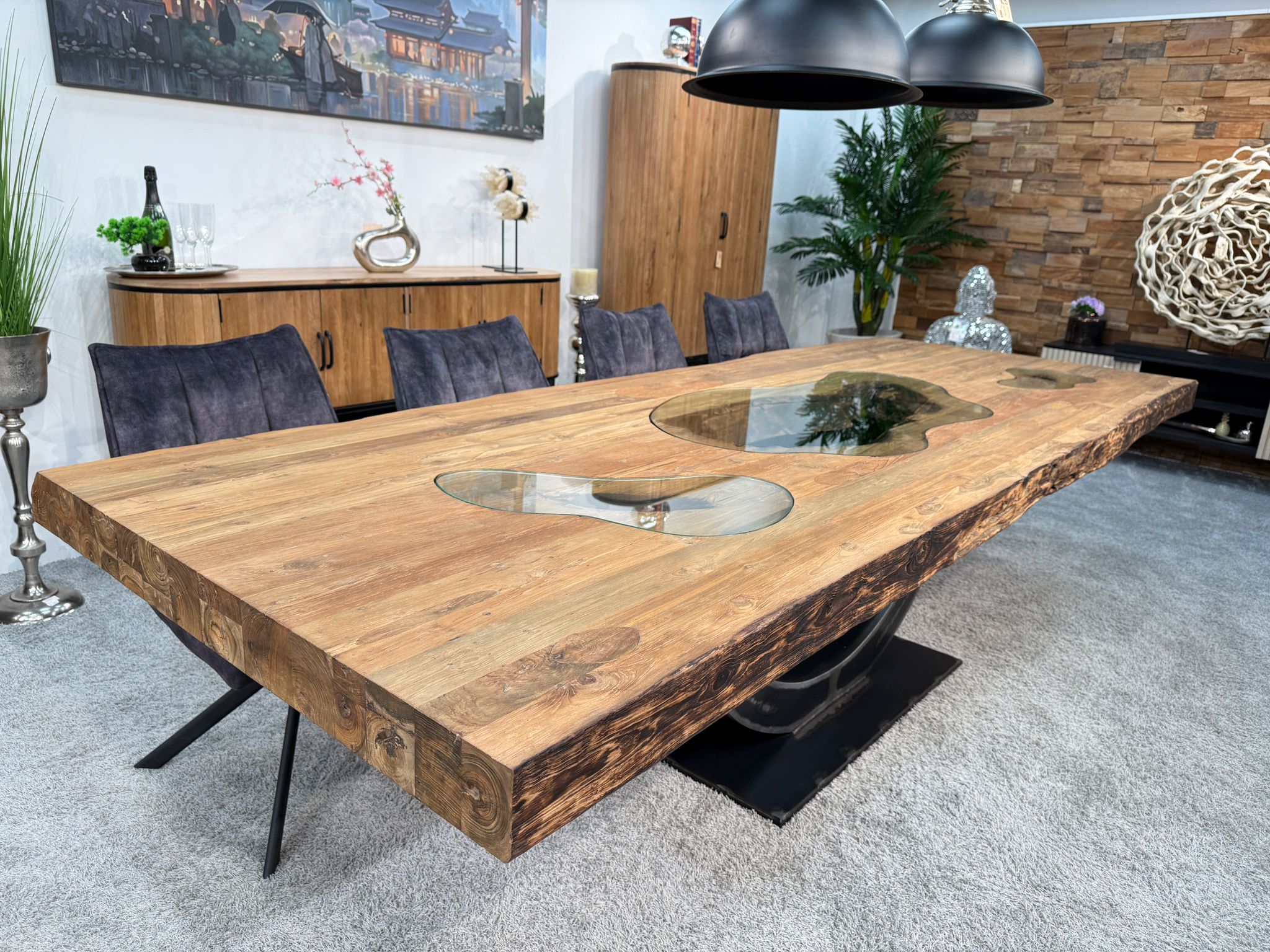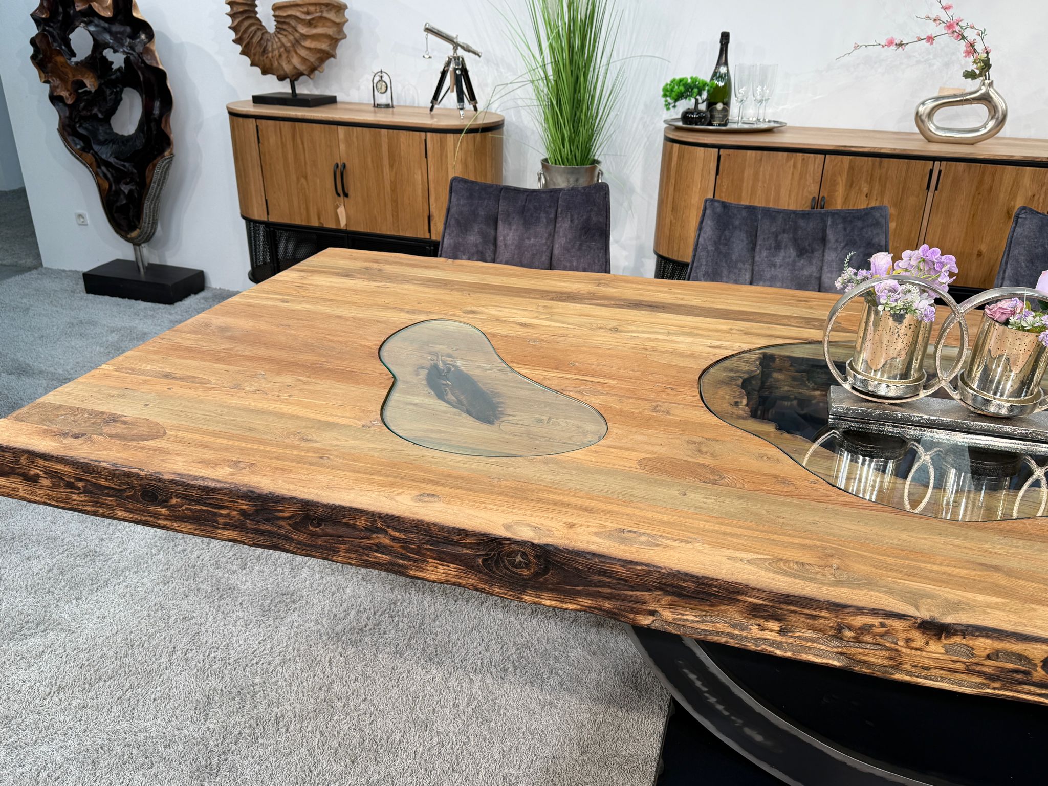 Beispiel: Esstisch aus der Serie "Deep Island" im Format 350 x 120 cm mit Glaseinlagen
