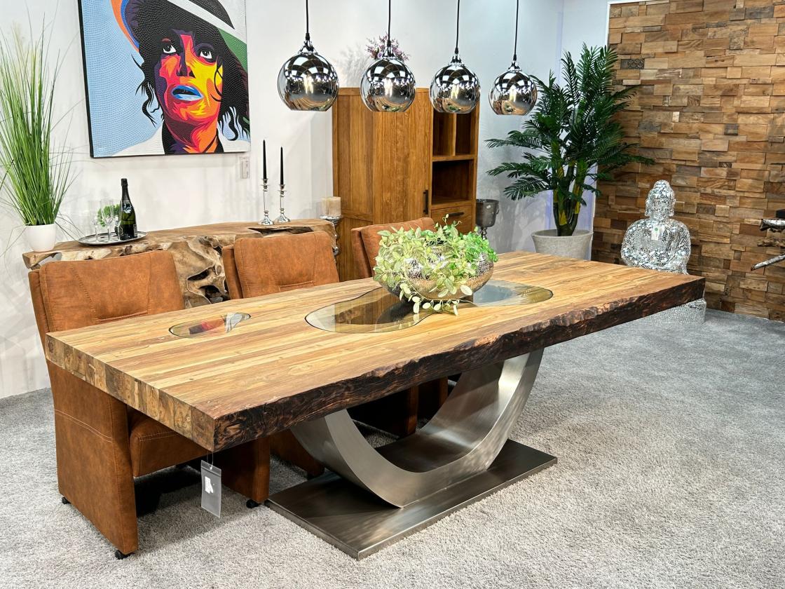 Esszimmertisch ca. 250 x 100 x 77 cm "Deep Island" aus recyceltem Altholz mit einem Tischgestell aus Edelstahl in Halbmondform