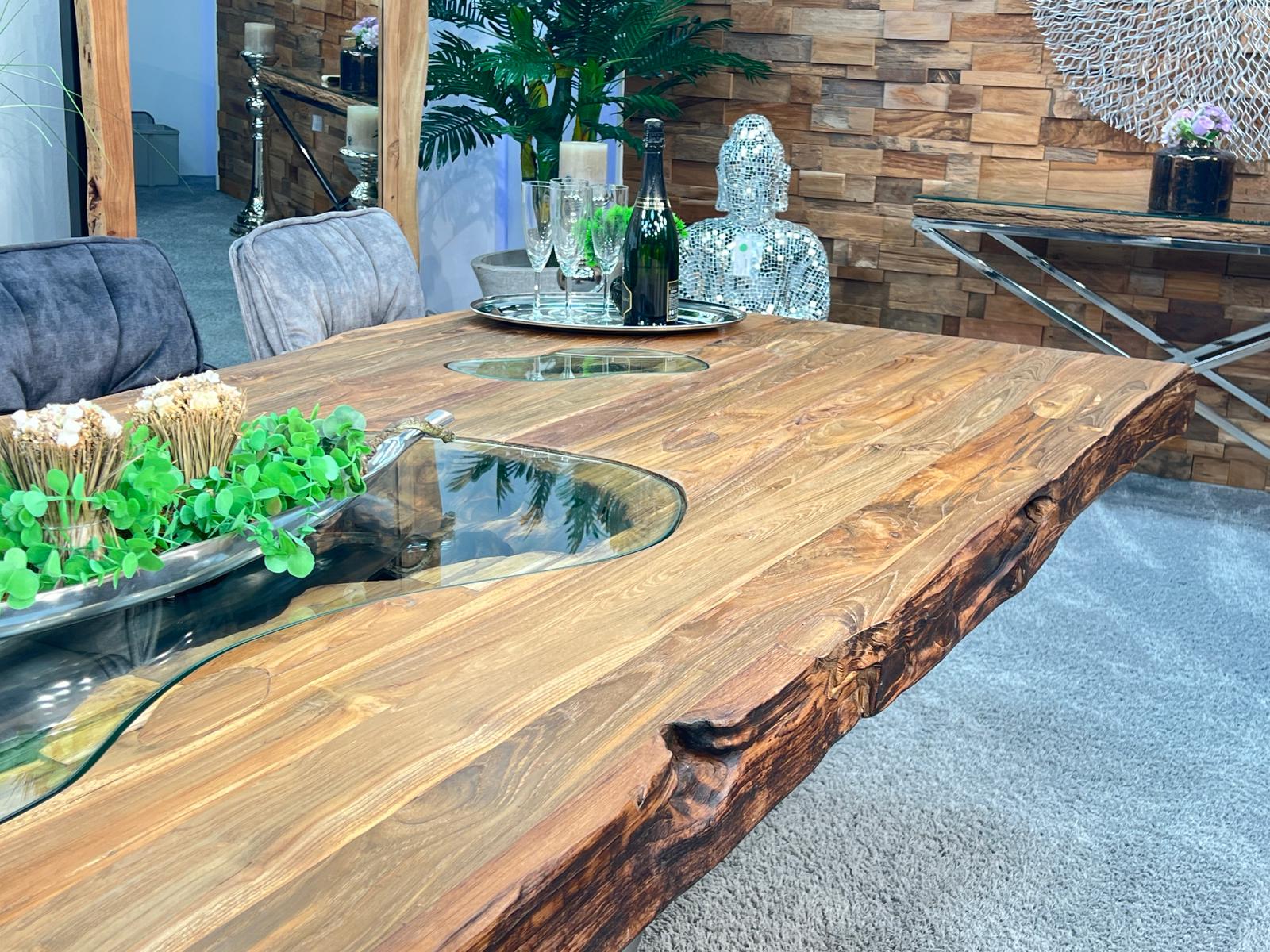 Drei eingearbeitete Glaseinlagen ermöglichen einen Blick in die gewachsene Struktur des Holzes und betonen die Natürlichkeit des Materials. Diese Verbindung aus traditionellem Holz und modernen Glaselementen macht den Tisch zu einem besonderen Designstück.