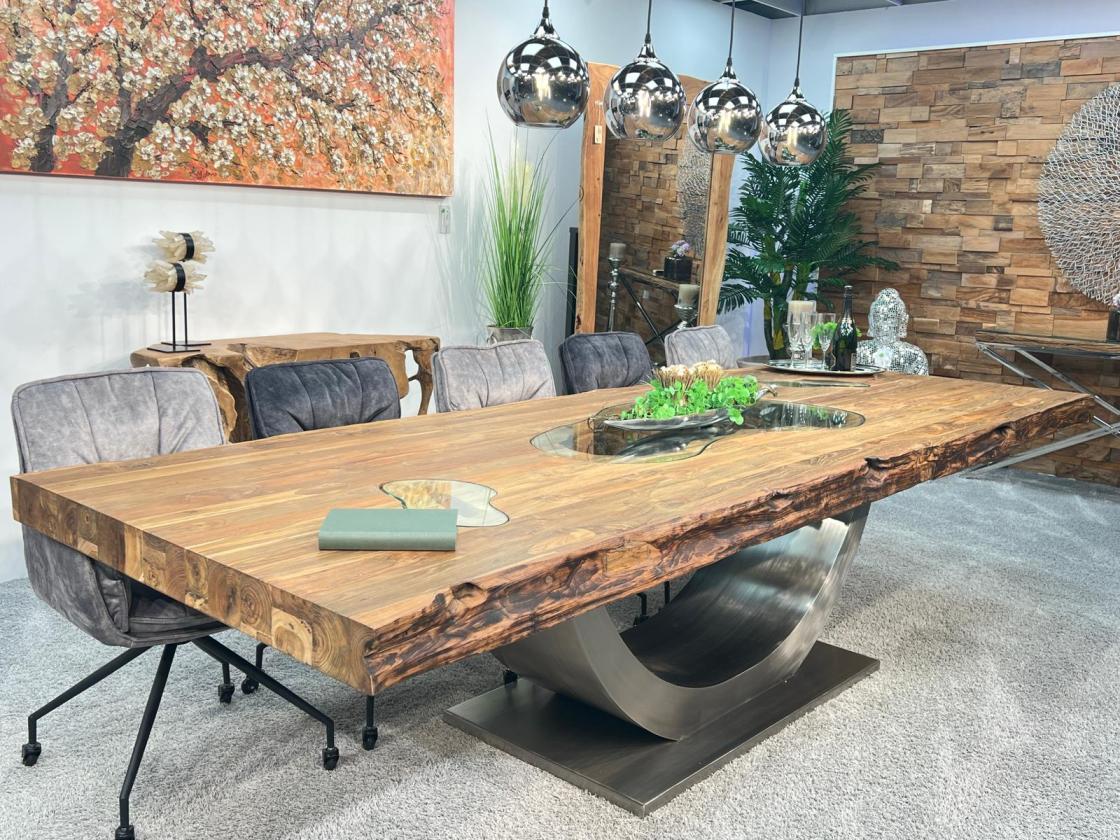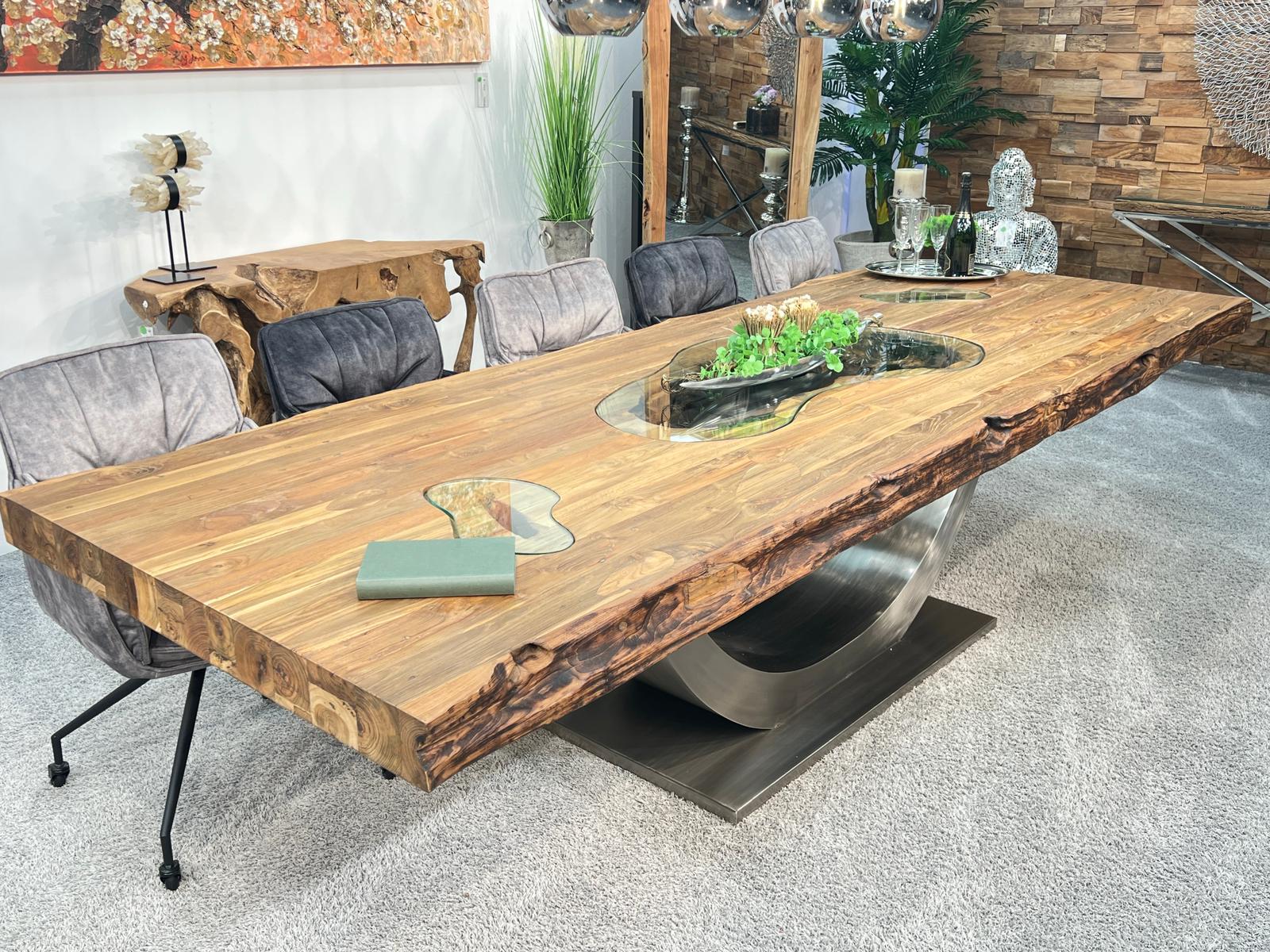Beispiel: Esstisch aus der Serie "Deep Island" im Format 350 x 120 cm mit Glaseinlagen