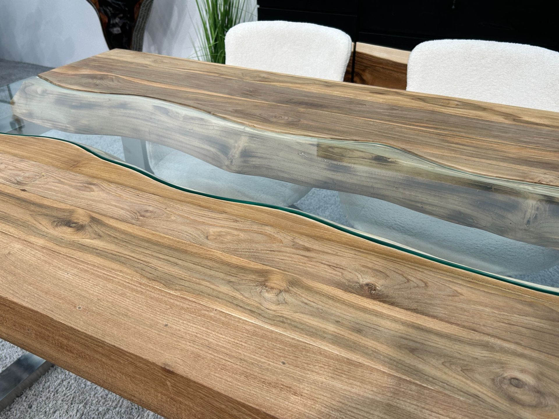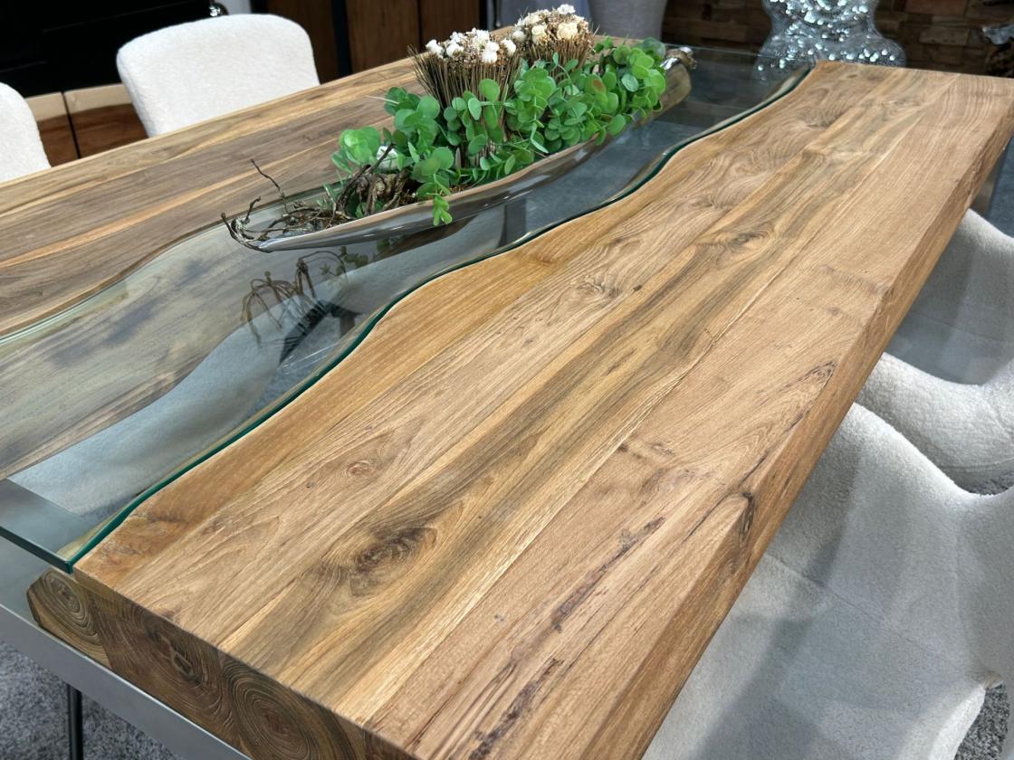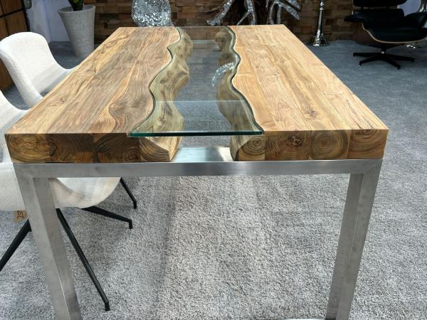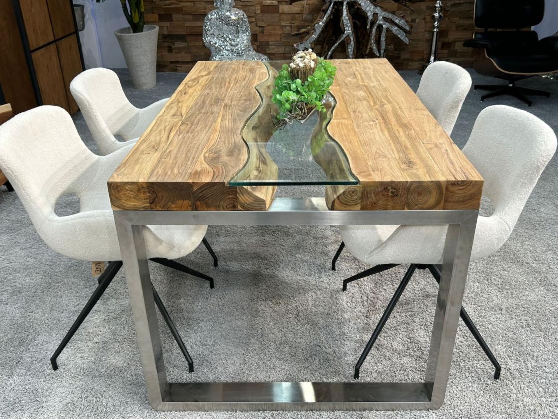 Moderner Esstisch der Serie "Elements" aus massivem Teakholz (Altholz) mit Glas und Edelstahlgestell