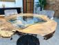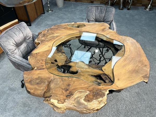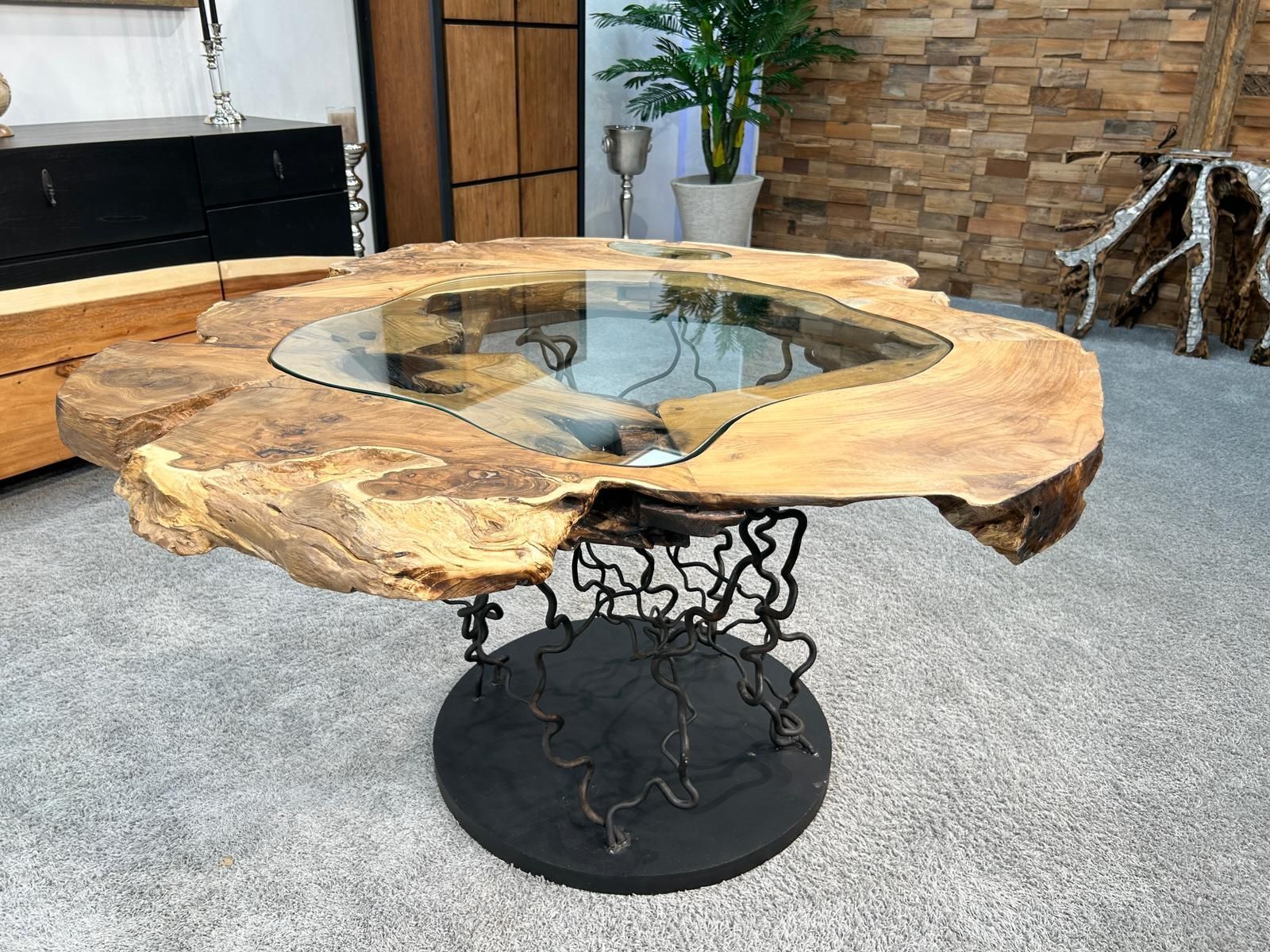 Runder Esstisch der Serie „Eternia Root“ aus Teakholz mit einem Tischgestell aus Edelstahl und Glas