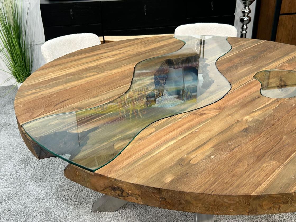 Runder Esstisch "Eternia" aus recyceltem Holz, ca. 160 x 78 cm, mit Edelstahlgestell und eingefrästem Glas