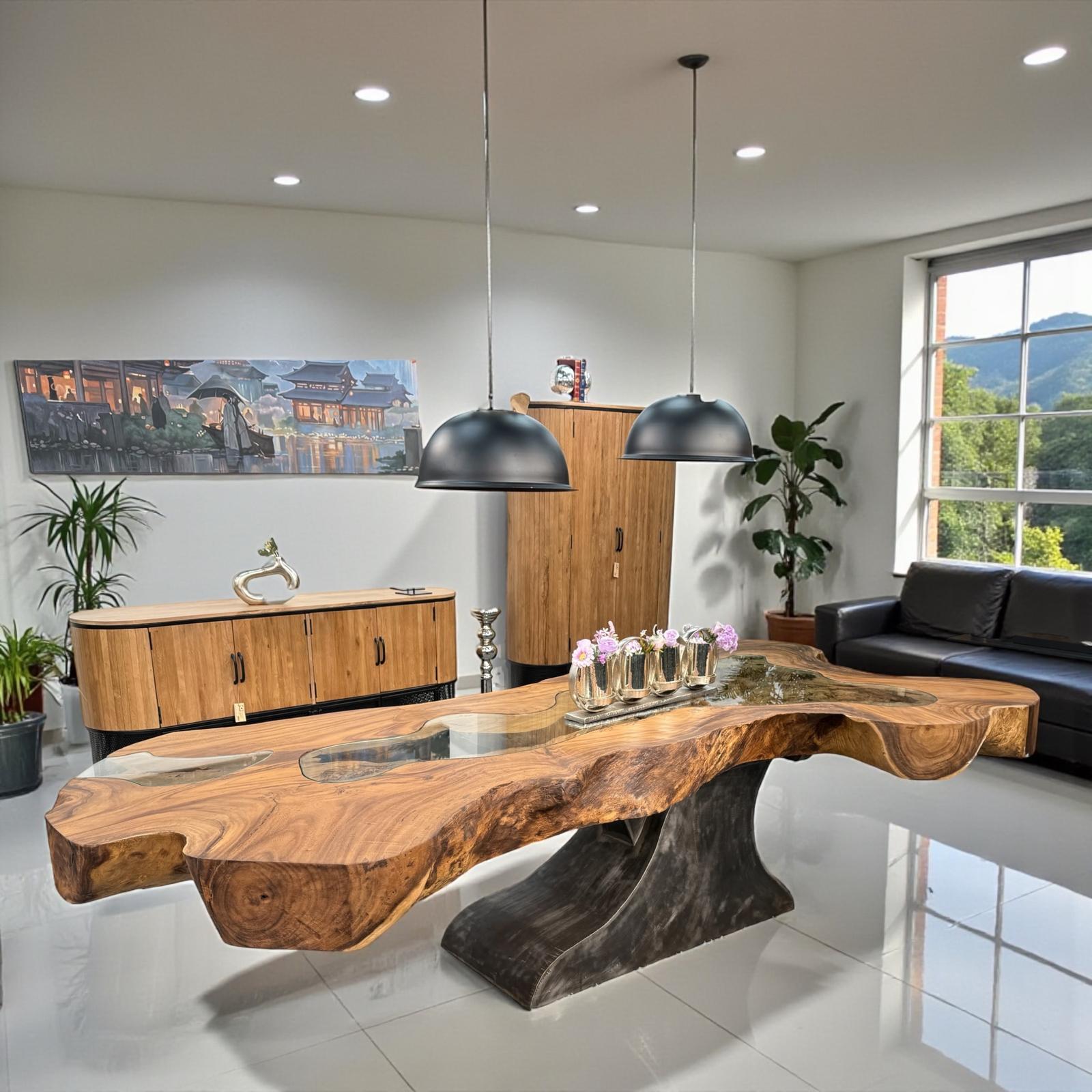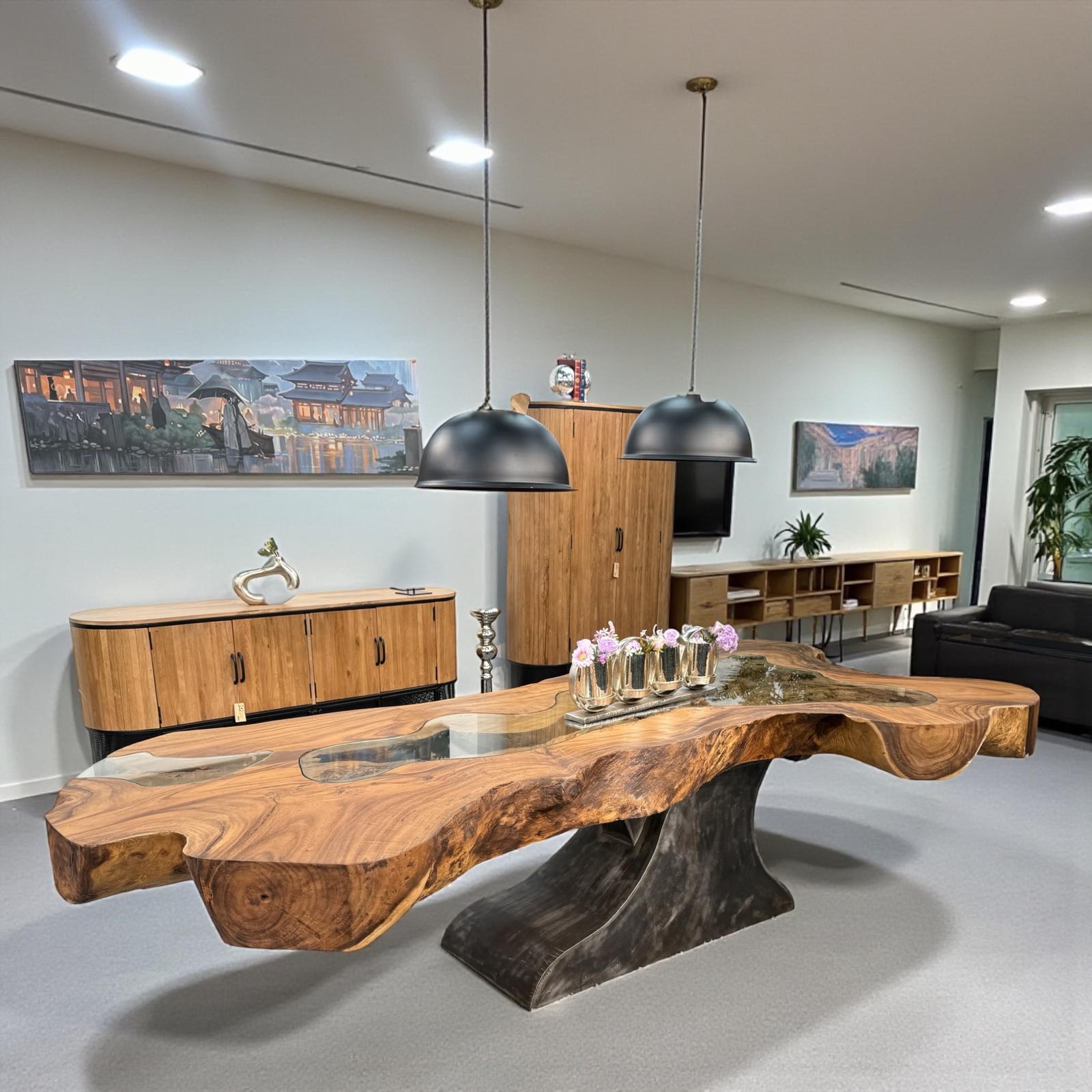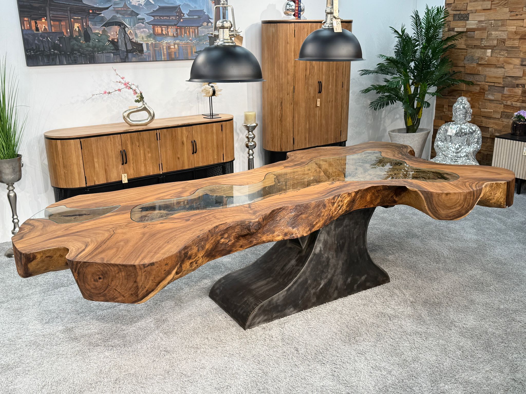 Dieser beeindruckende Konferenztisch/Esstisch mit sagenhaften 17,5 cm Plattenstärke wurde aus einer einzelnen Scheibe eines Baumstammes des „Suar“ gefertigt. Suar ist in Farbe und Struktur der Akazie sehr ähnlich. Markant ist das helle Splintholz, welches dem Gesamtbild einen ganz besonderen Charakter verleiht. Das zum Lieferumfang gehörende Tischgestell wurde aus Rohstahl in Form eines Baumstamms gefertigt.
