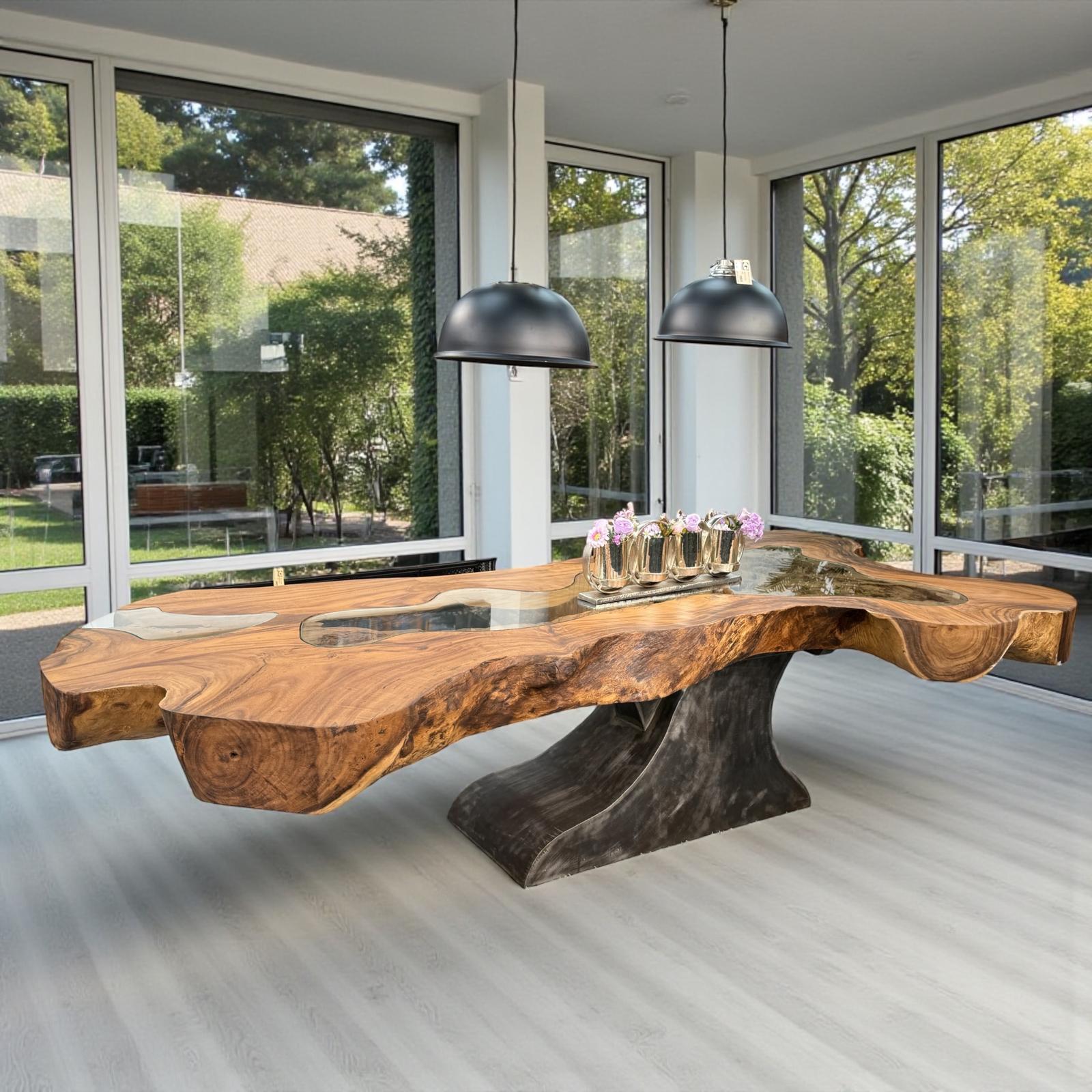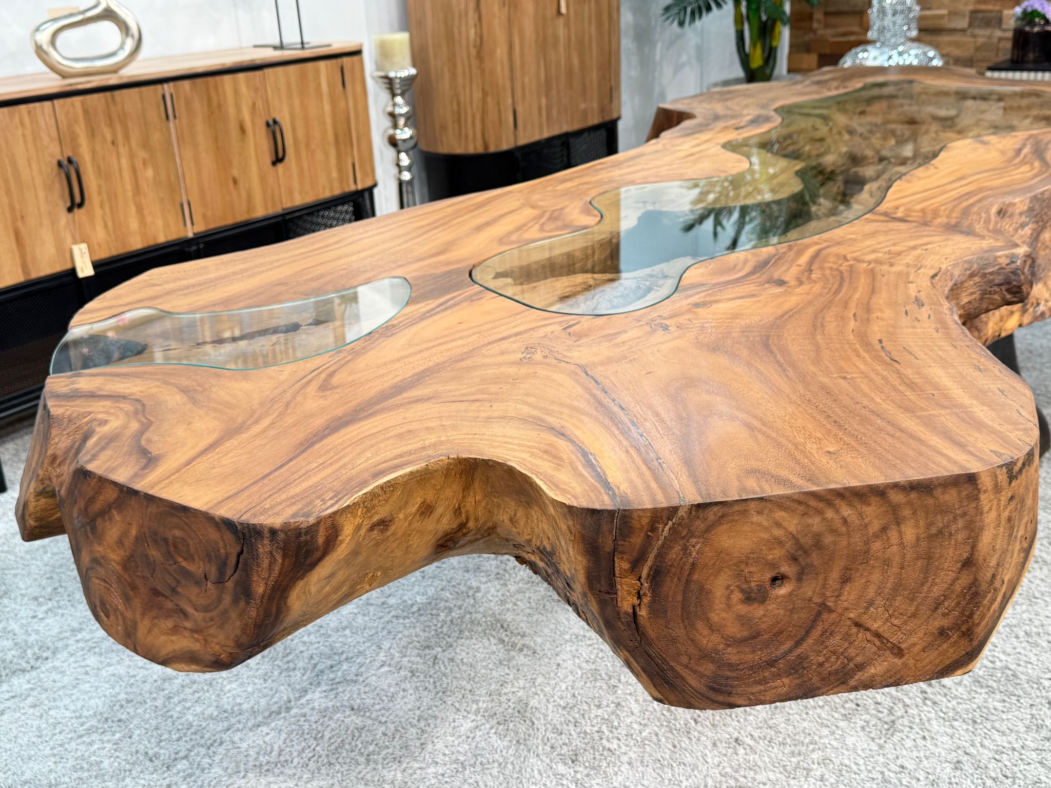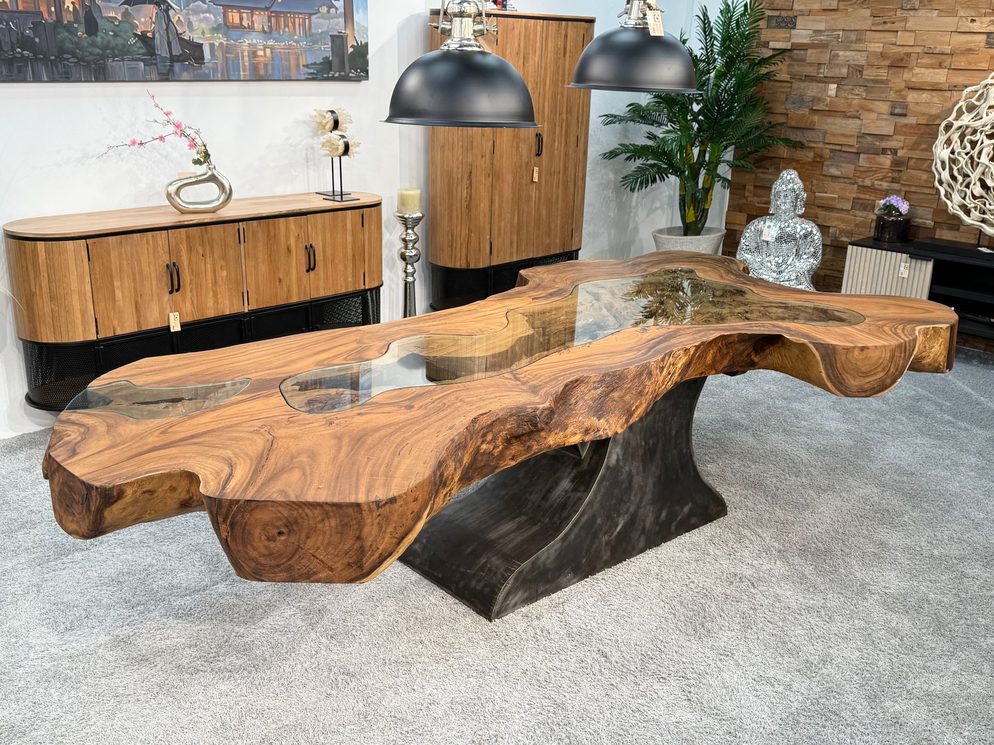 Massiver Baumstammtisch / Designtisch "Expression Suar" aus einer massiven Baumscheibe mit Glaseinlage und großem "Tree Leg"