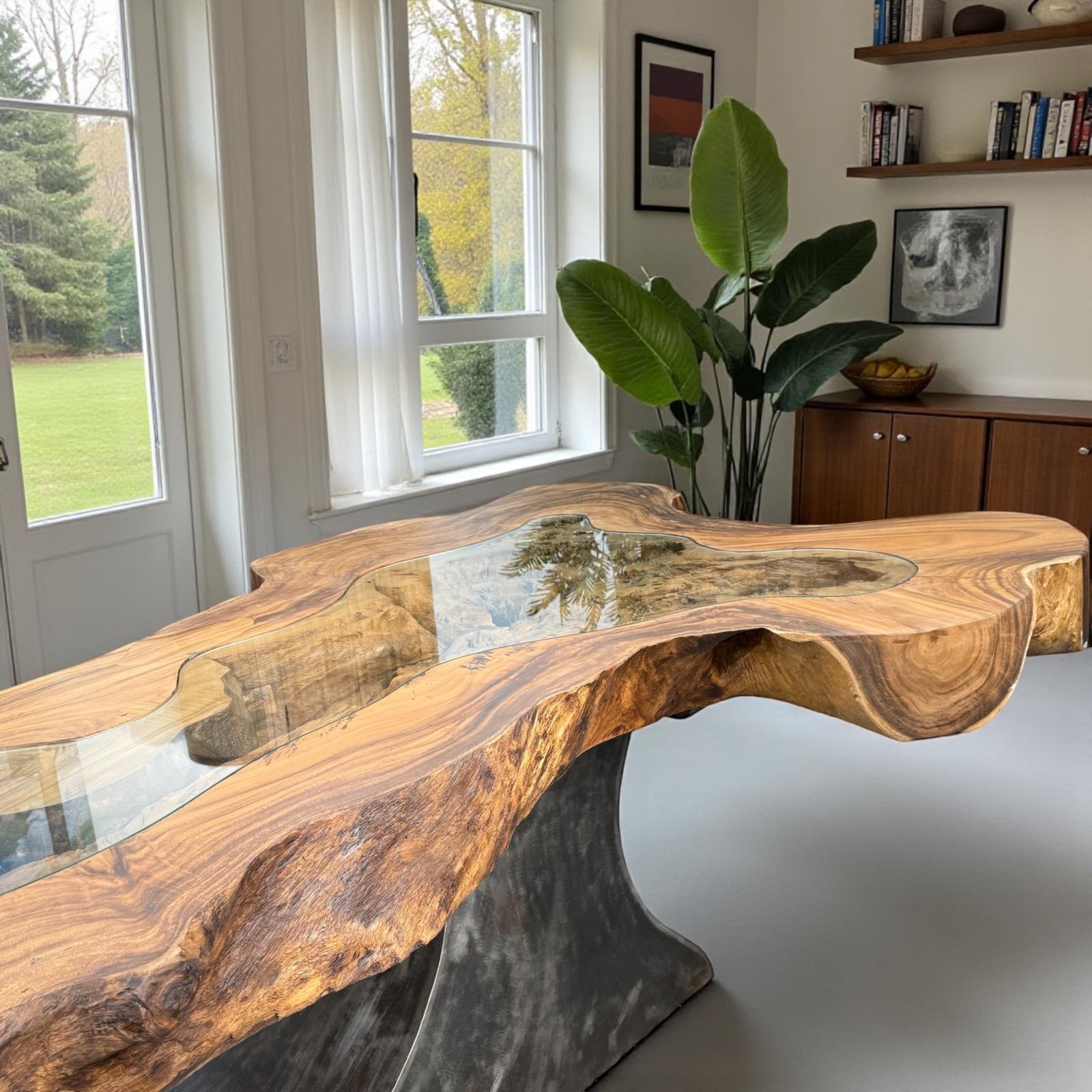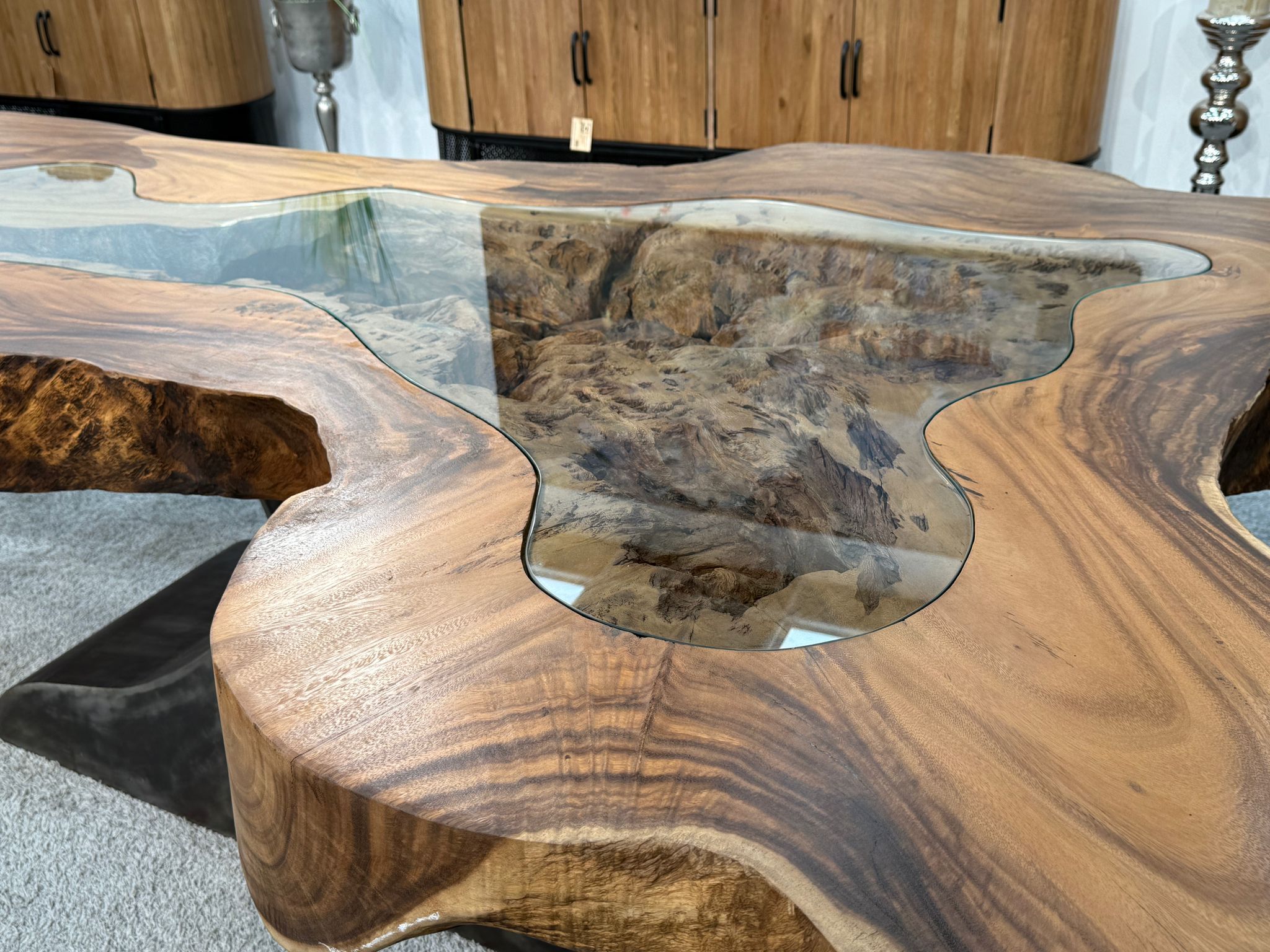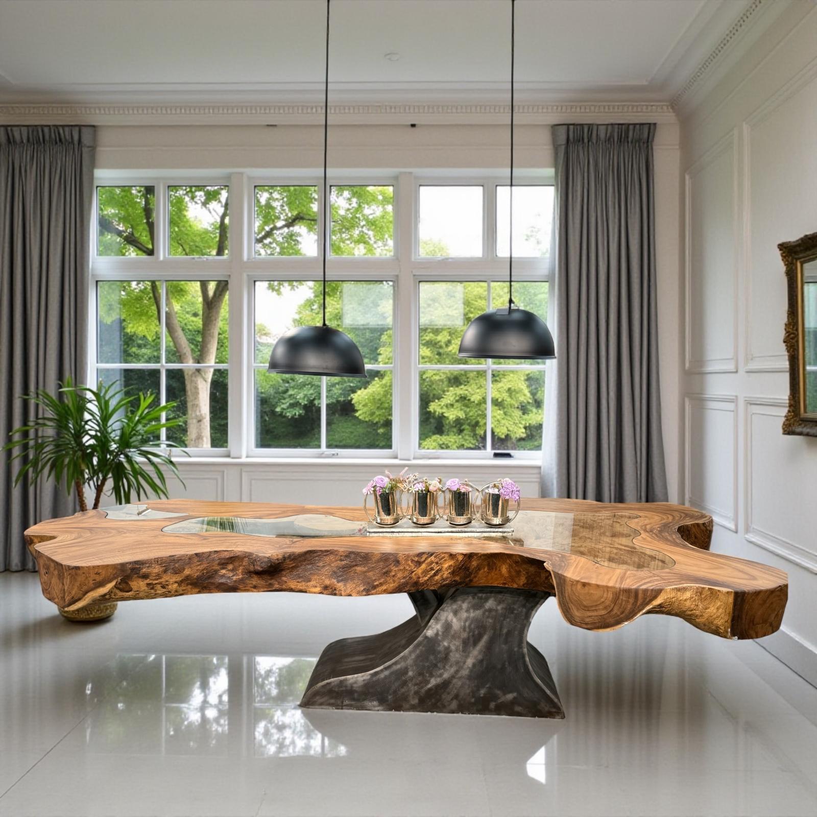 Massiver Baumstammtisch / Designtisch "Expression Suar" aus einer massiven Baumscheibe mit Glaseinlage und großem "Tree Leg"
