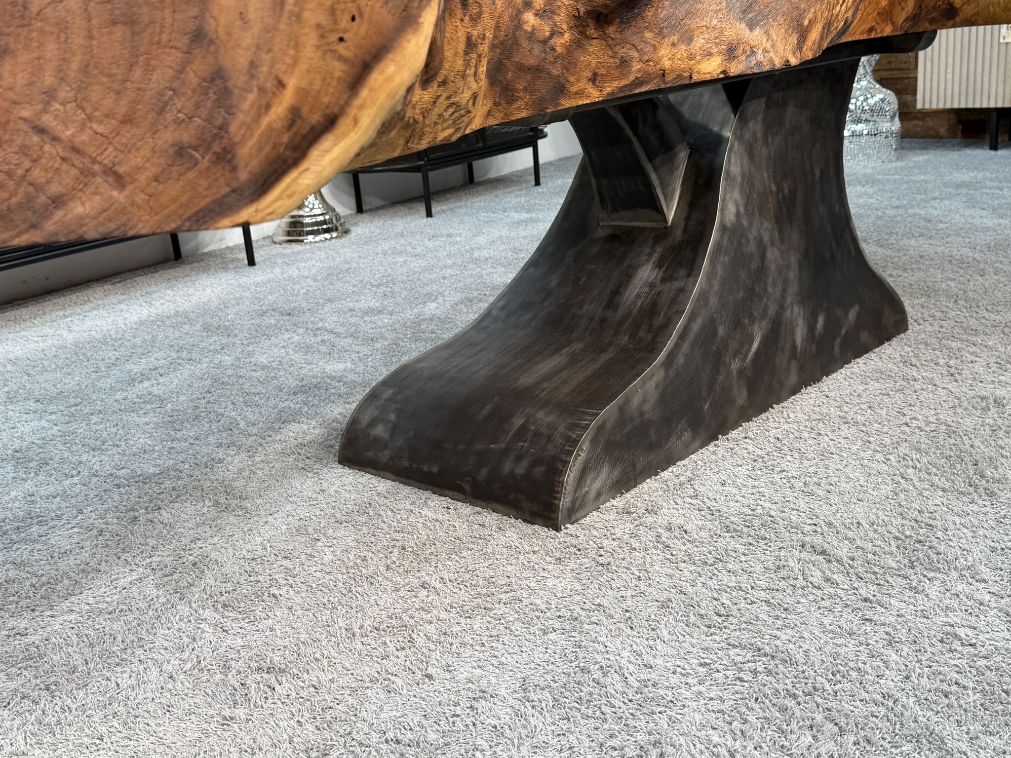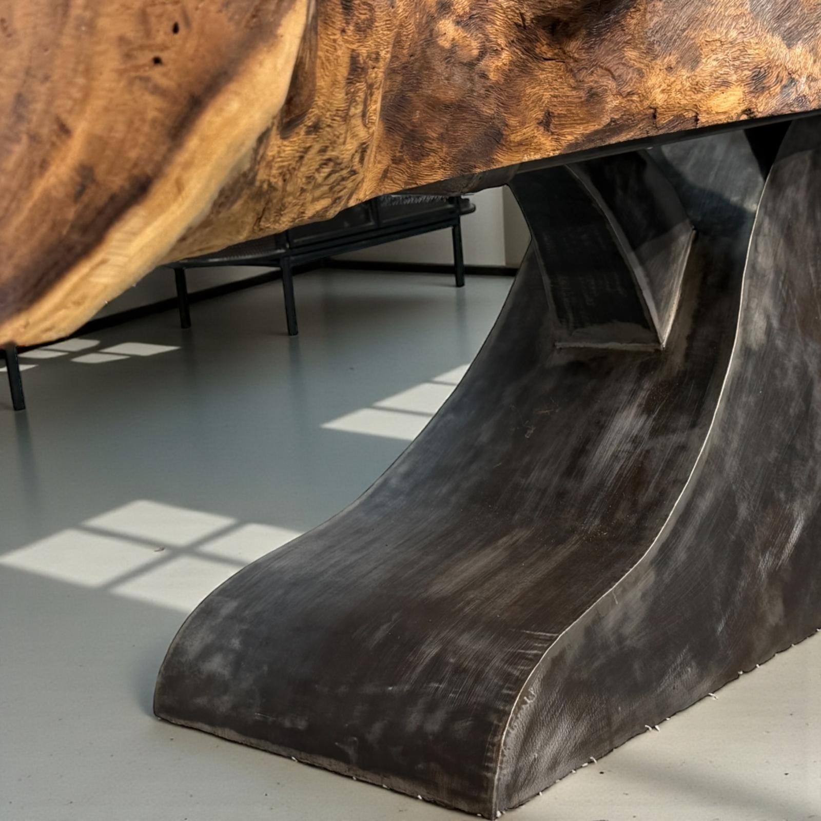 Material: Baumscheibe aus einem massiven Baumstamm / Baumstumpf des "Suar" ähnl. Akazie, großes Tischgestell "Tree Leg" aus Rohstahl in Baumstammform