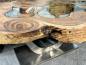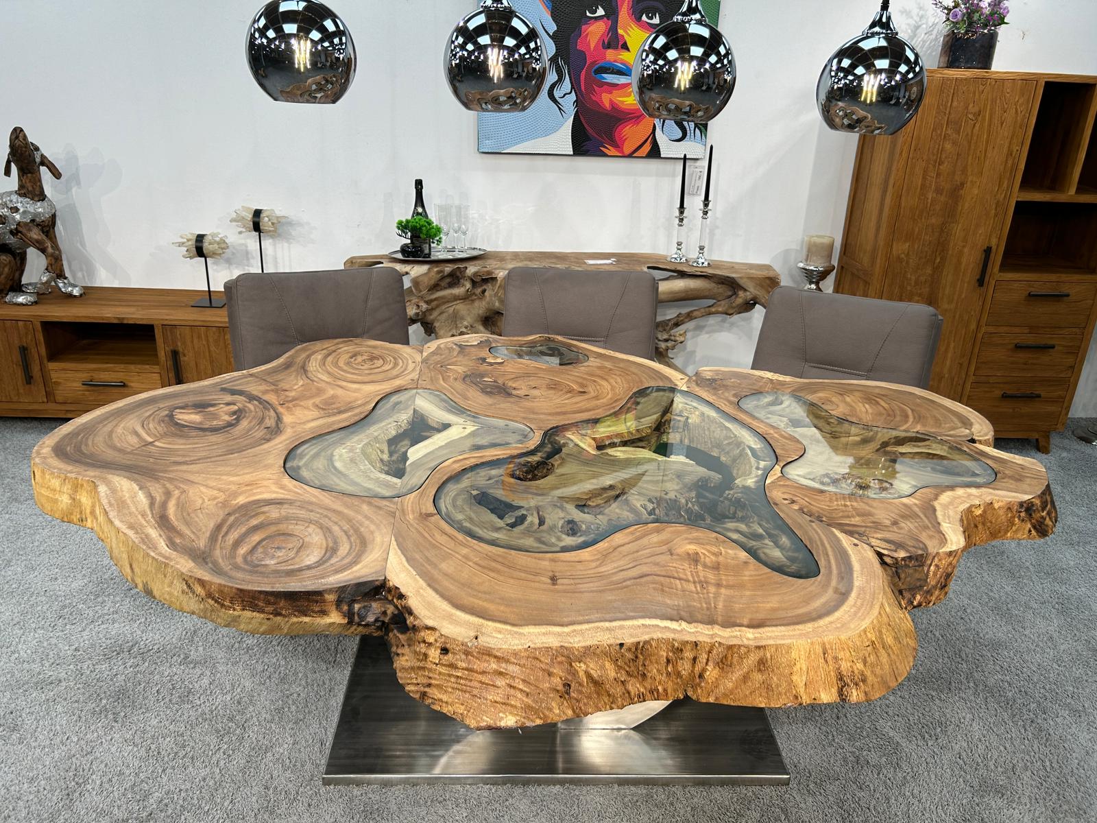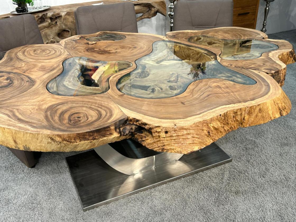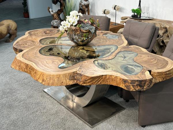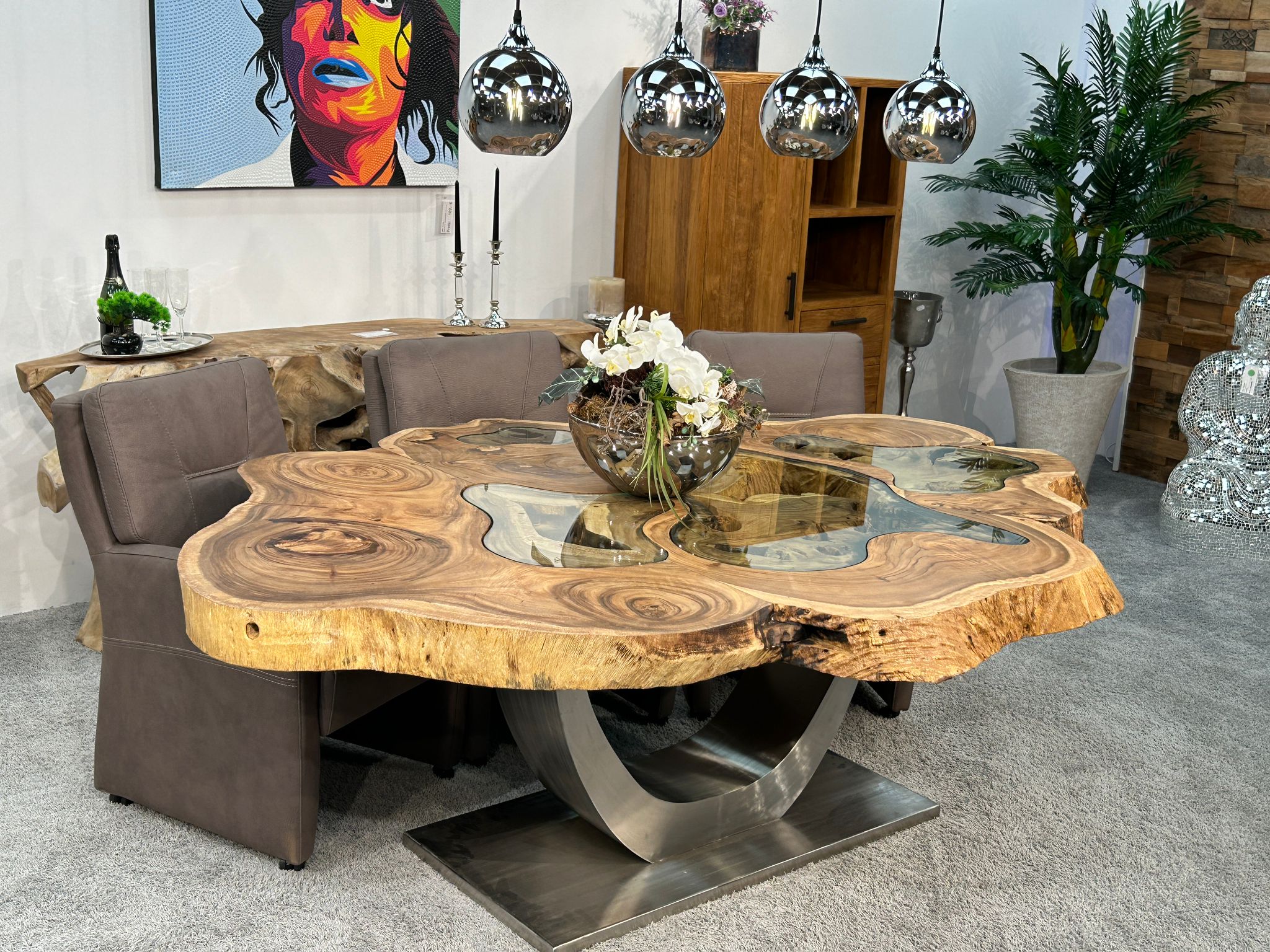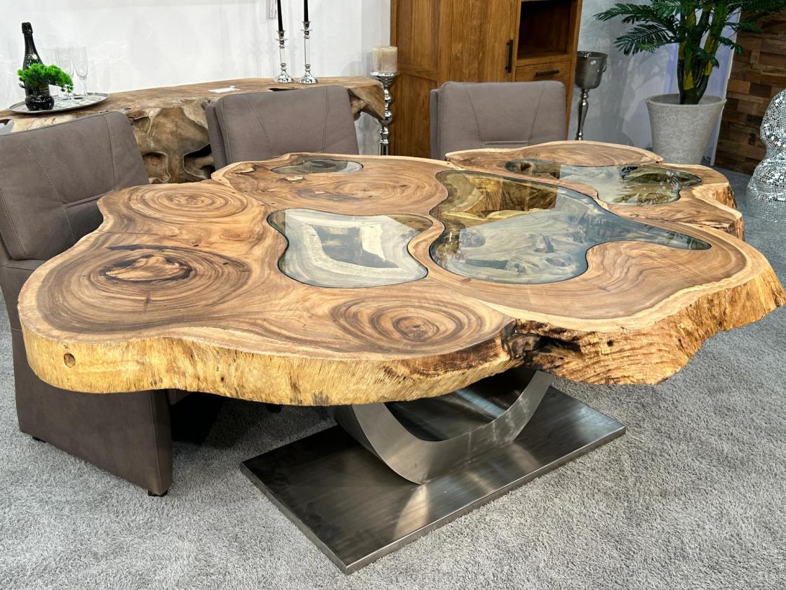 Material: Massive Baumscheibe (Suar), Tischgestell aus Edelstahl und Glaseinlagen