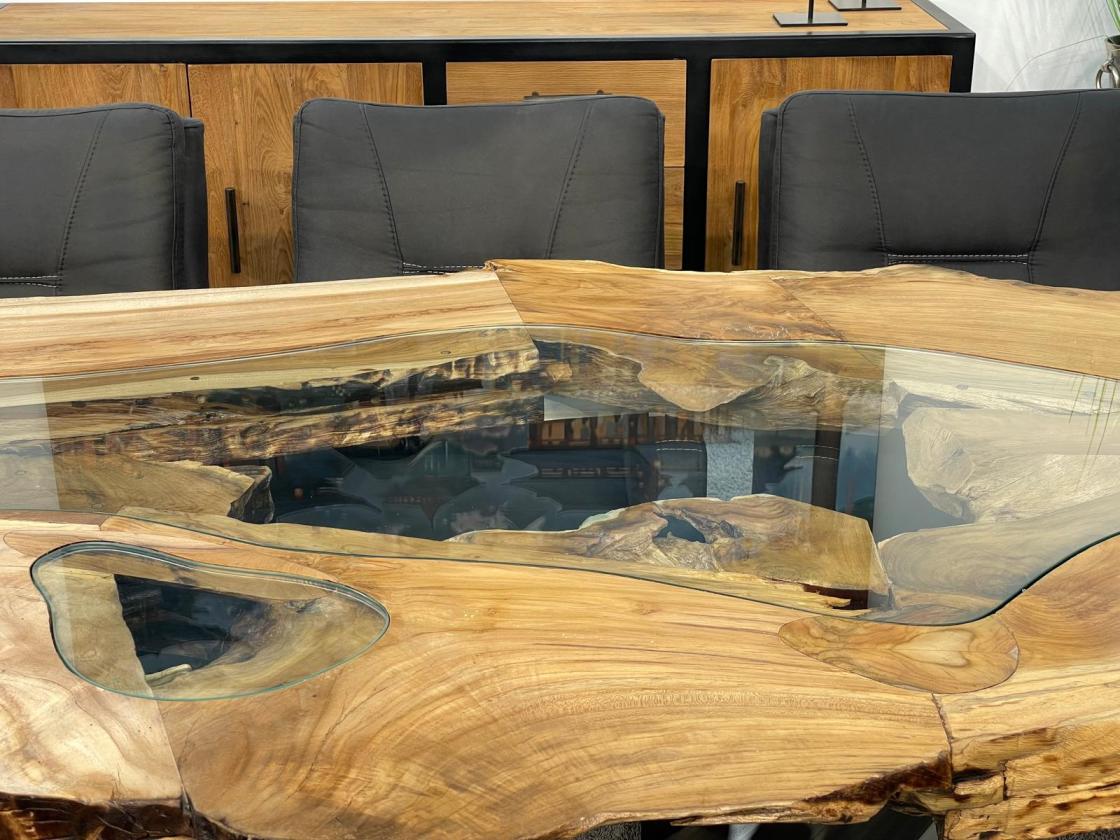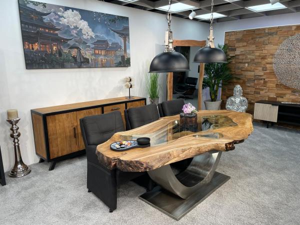 Der Luxustisch "Expression" vereint natürliche Ursprünglichkeit mit moderner Gestaltung. Mit einer Länge von ca. 240 cm, einer Breite von 122 cm sowie einer Höhe von 79,5 cm bietet dieser hochwertige Esstisch Platz für 8 bis 10 Personen – und ist dabei nicht nur funktional, sondern ein echtes Statement im Raum.