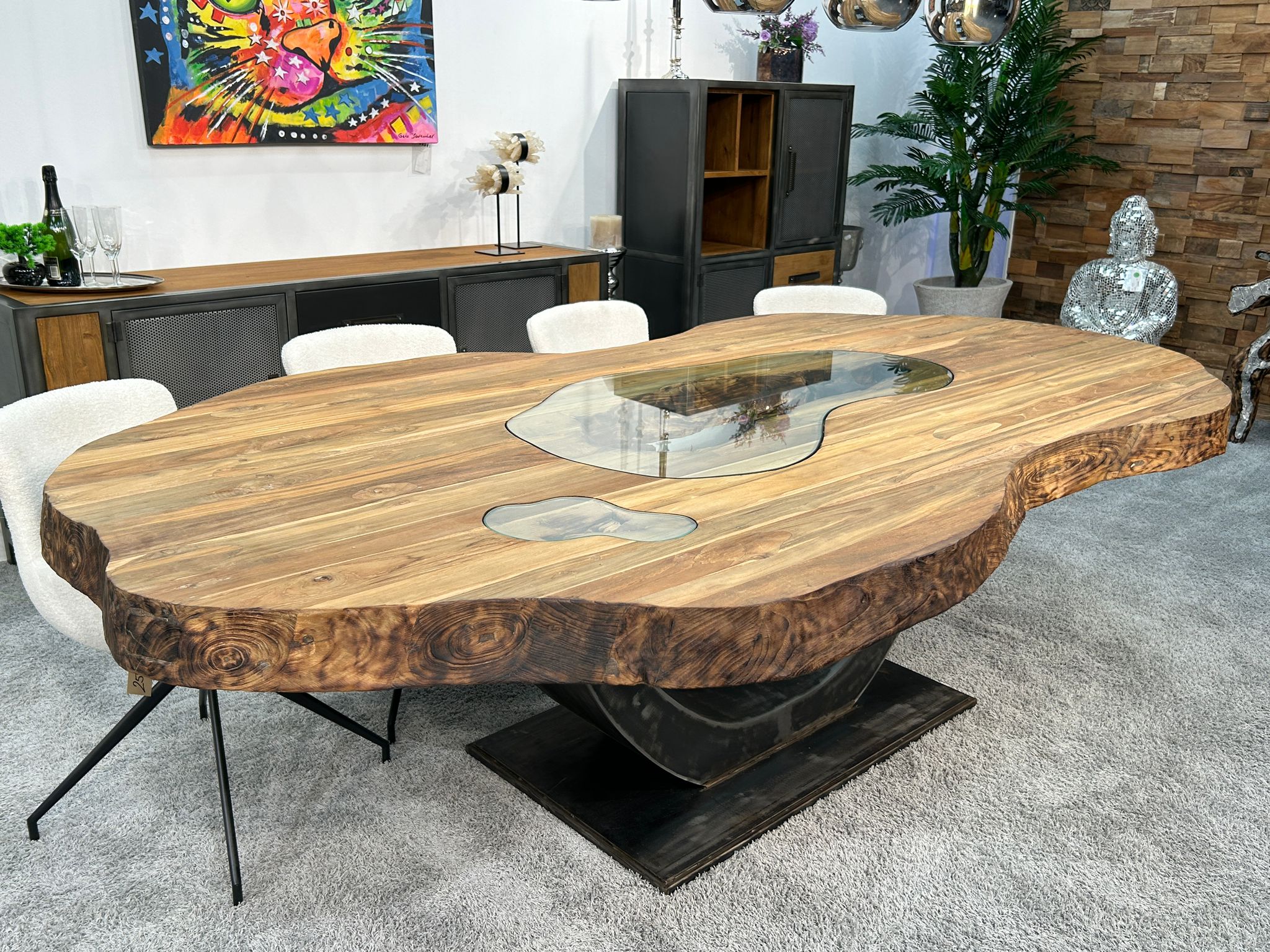 Die Tischplatte besteht aus hochwertigem, recyceltem Teakholz und beeindruckt mit einer massiven Stärke von 10 cm. Als einzigartiges Detail sind Glaseinleger in reiner Handarbeit in die Platte eingearbeitet. Das außergewöhnliche Halbmond-Tischgestell aus Rohstahl rundet das Design ab und unterstreicht das Thema Industriedesign.