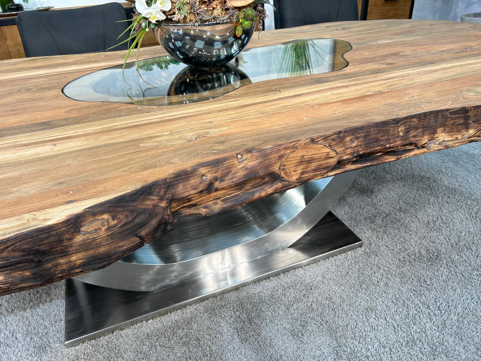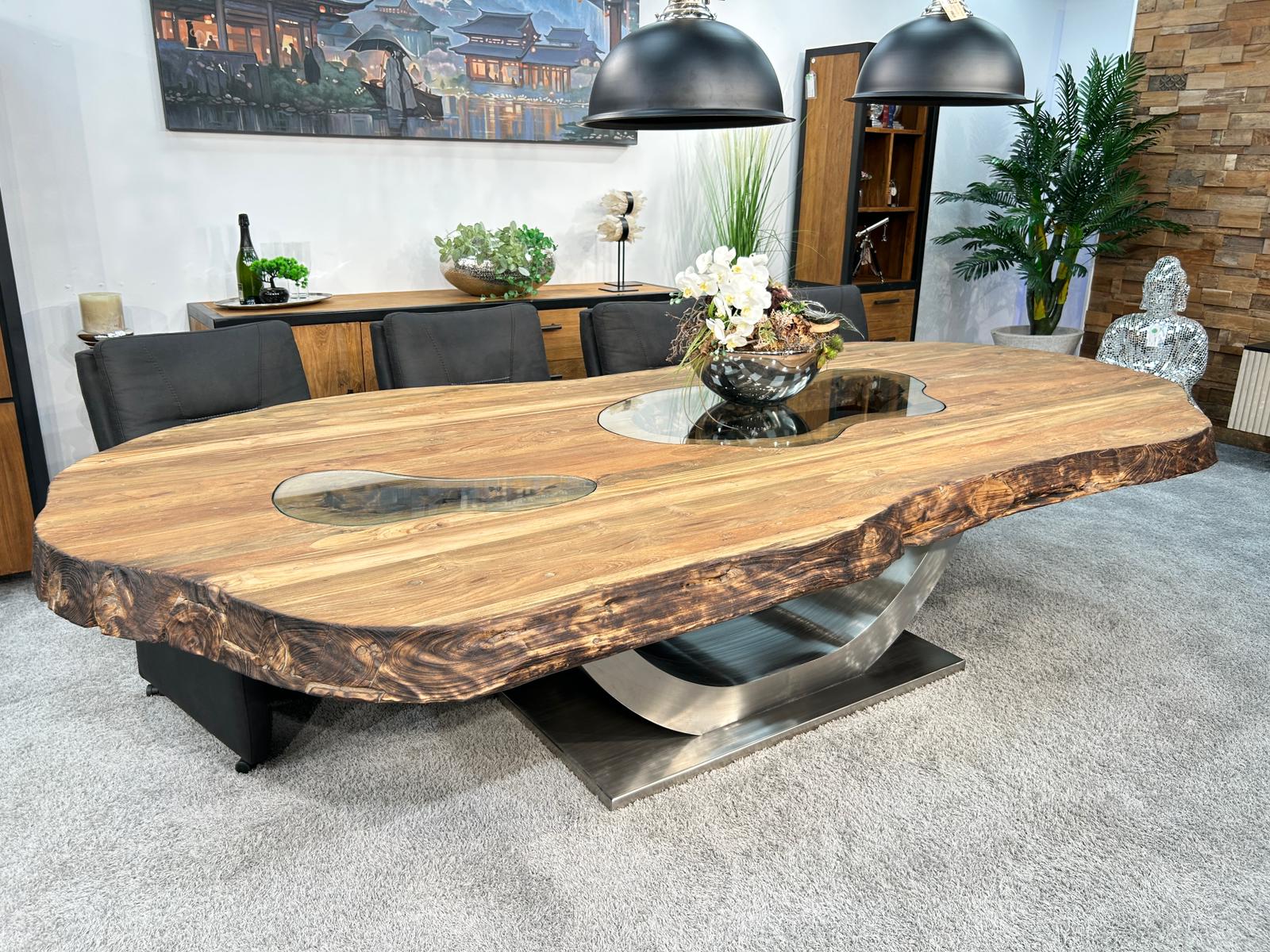 Extravaganter Esstisch aus recyceltem Altholz "Fusion" ca. 305 x 128-150 x 78 cm und einem Tischfuß aus Edelstahl