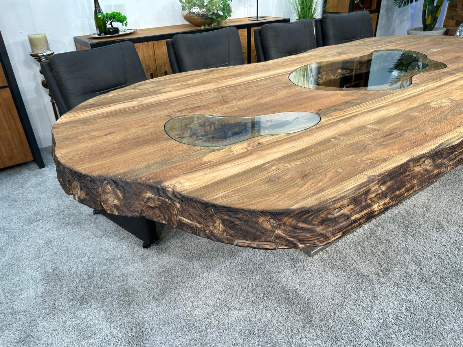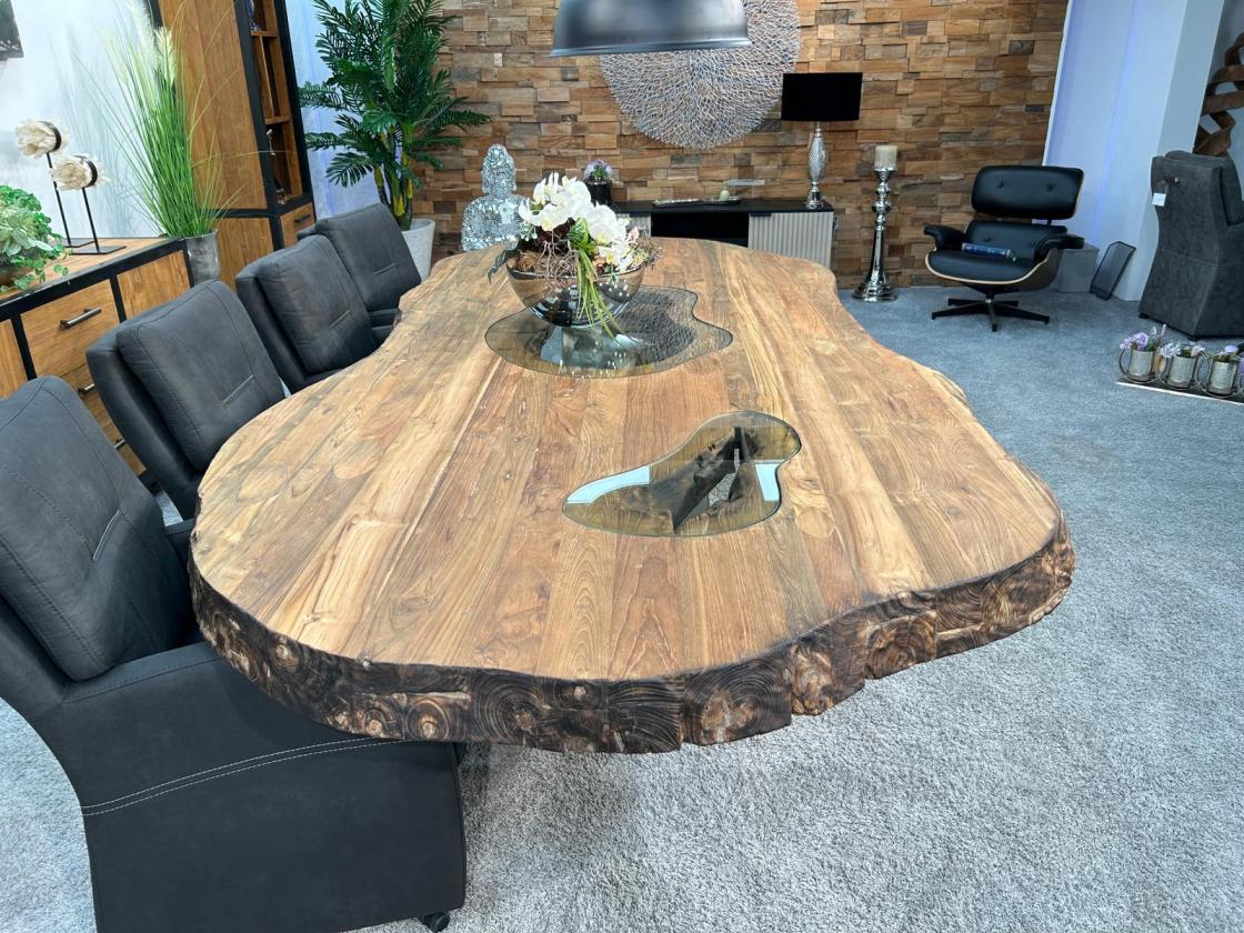 Schon die Form macht diesen Esstisch zu etwas wirklich Außergewöhnlichem. Die Tischplatte, die in organischer Form designt wurde und auf jede scharfe Kante und Tischecke verzichtet, erregt sofort die Aufmerksamkeit des Betrachters. Mit ihrer außergewöhnlichen Stärke von 10 cm ist die Tischplatte zum Esstisch "Fusion" ein echtes Schwergewicht. Hier ist alles massiv, kein fake,.durch und durch reines massives Holz. Auf der Tischplatte selbst befinden sich einzelne Einleger aus Glas, die einen Blick durch den Esstisch erlauben.