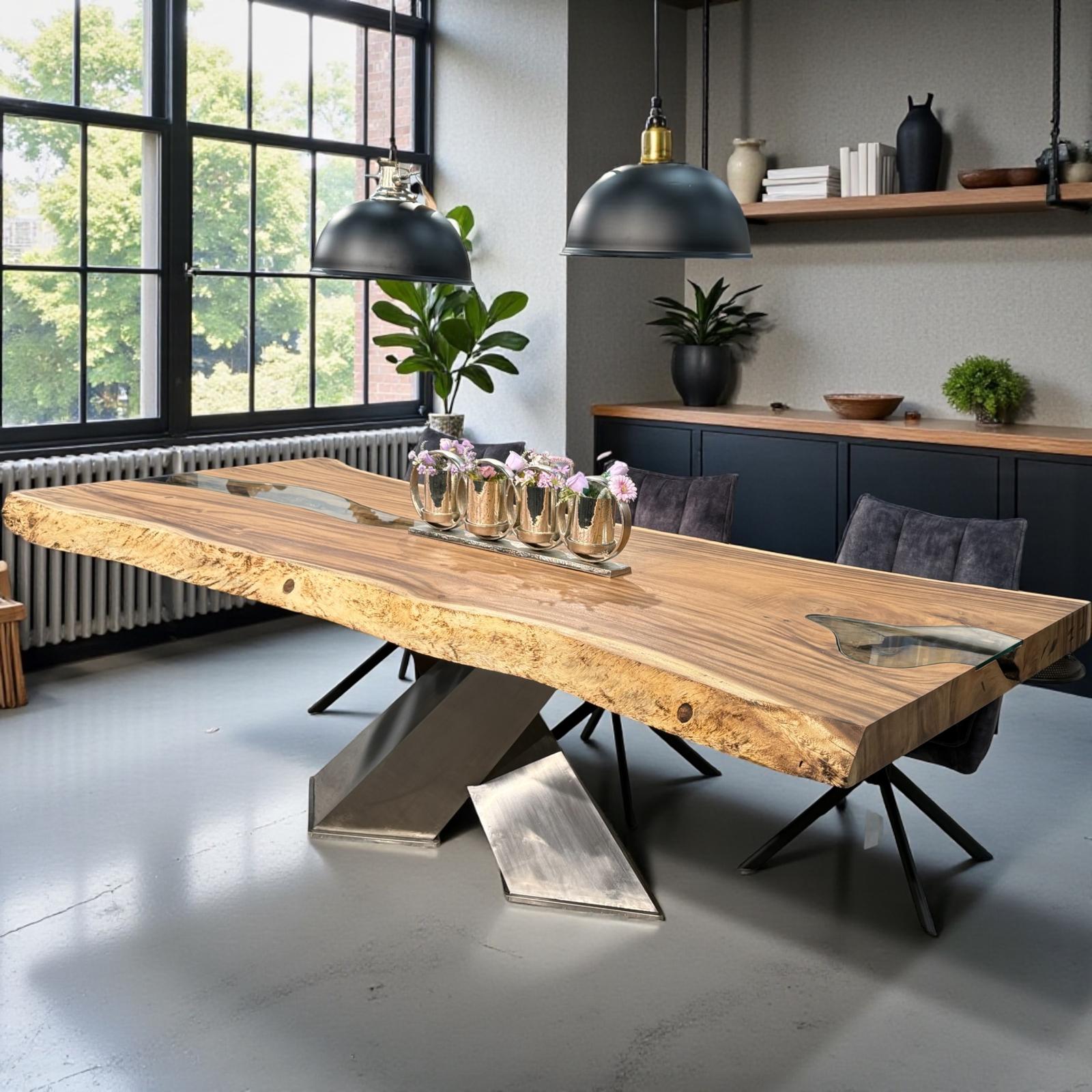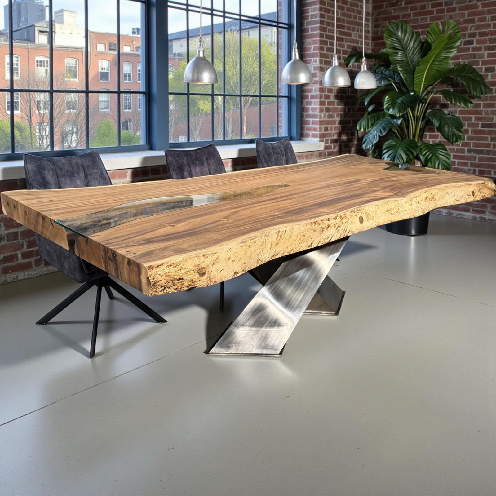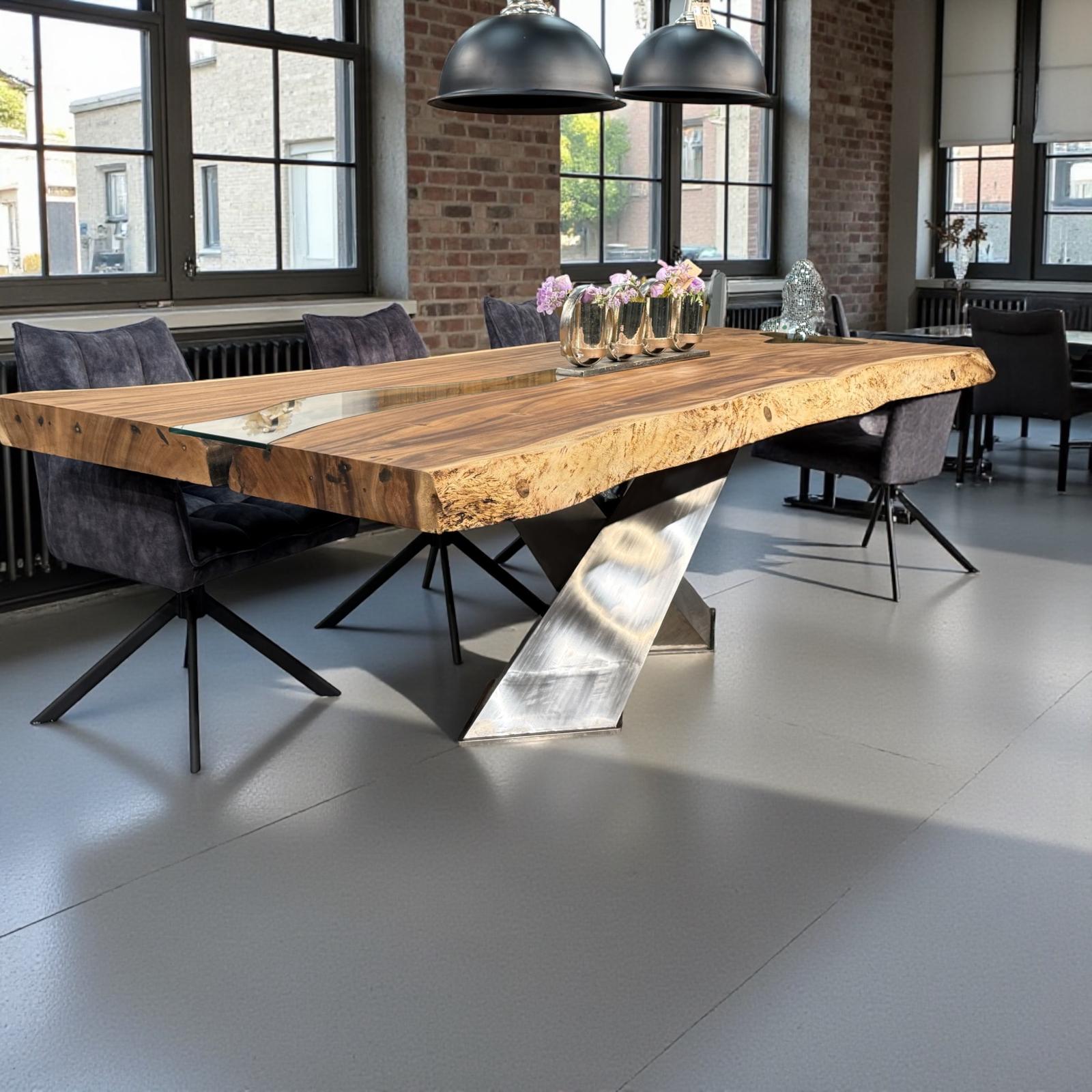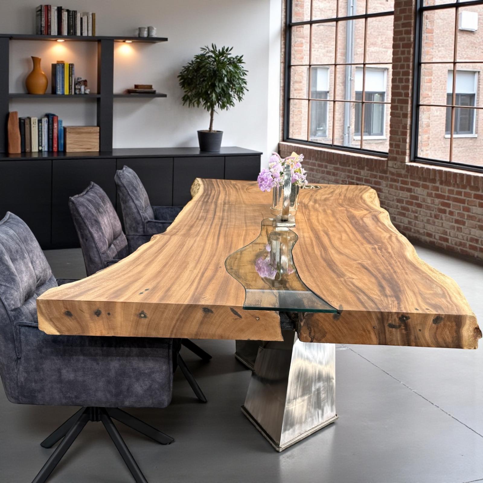 Dieser außergewöhnliche Esstisch / Besprechungstisch / Präsentationstisch aus massivem Suar-Baumstamm ist ein echtes Statement-Piece und verbindet natürliche Eleganz mit modernem Design.Zwei harmonisch integrierte Glaseinlagen öffnen den Blick auf die faszinierenden Strukturen des Holzes und verleihen dem Tisch eine besondere Leichtigkeit. Das imposante, dreidimensional gearbeitete Kreuzgestell aus gebürstetem Edelstahl unterstreicht die moderne Formsprache und sorgt gleichzeitig für höchste Stabilität. Die massive, plastische Gestaltung des Gestells macht es zu einem wahren Blickfang, der den außergewöhnlichen Charakter dieses Möbelstücks vollendet.