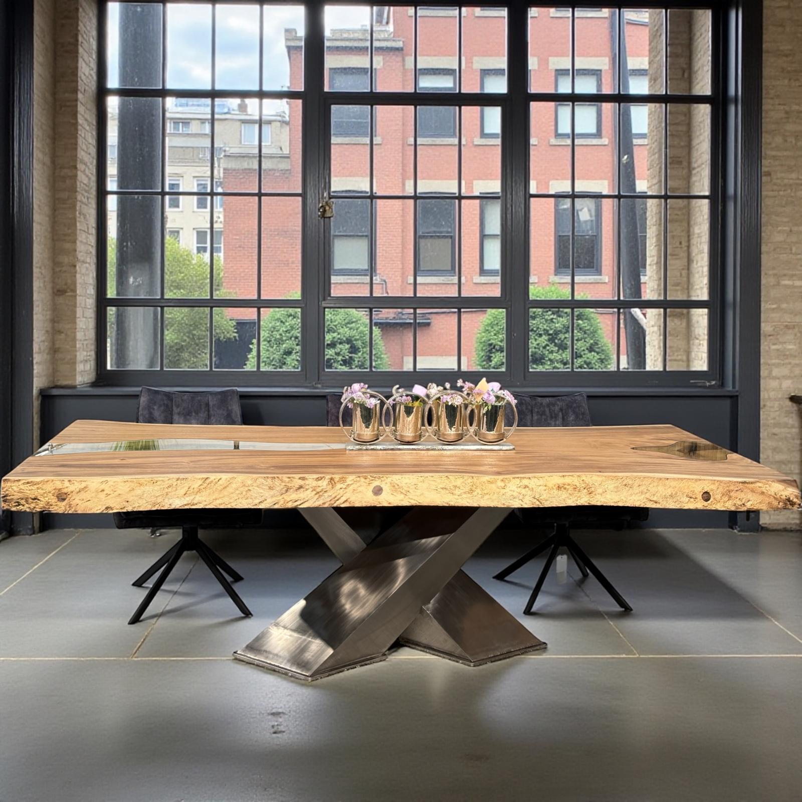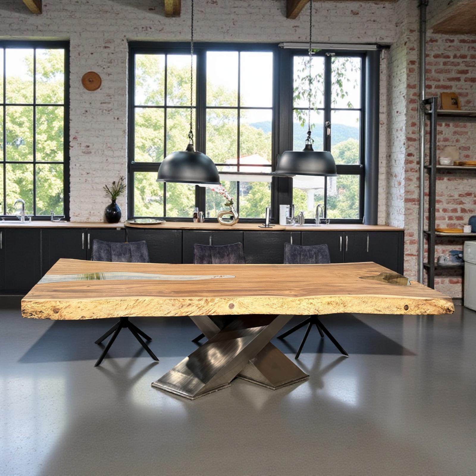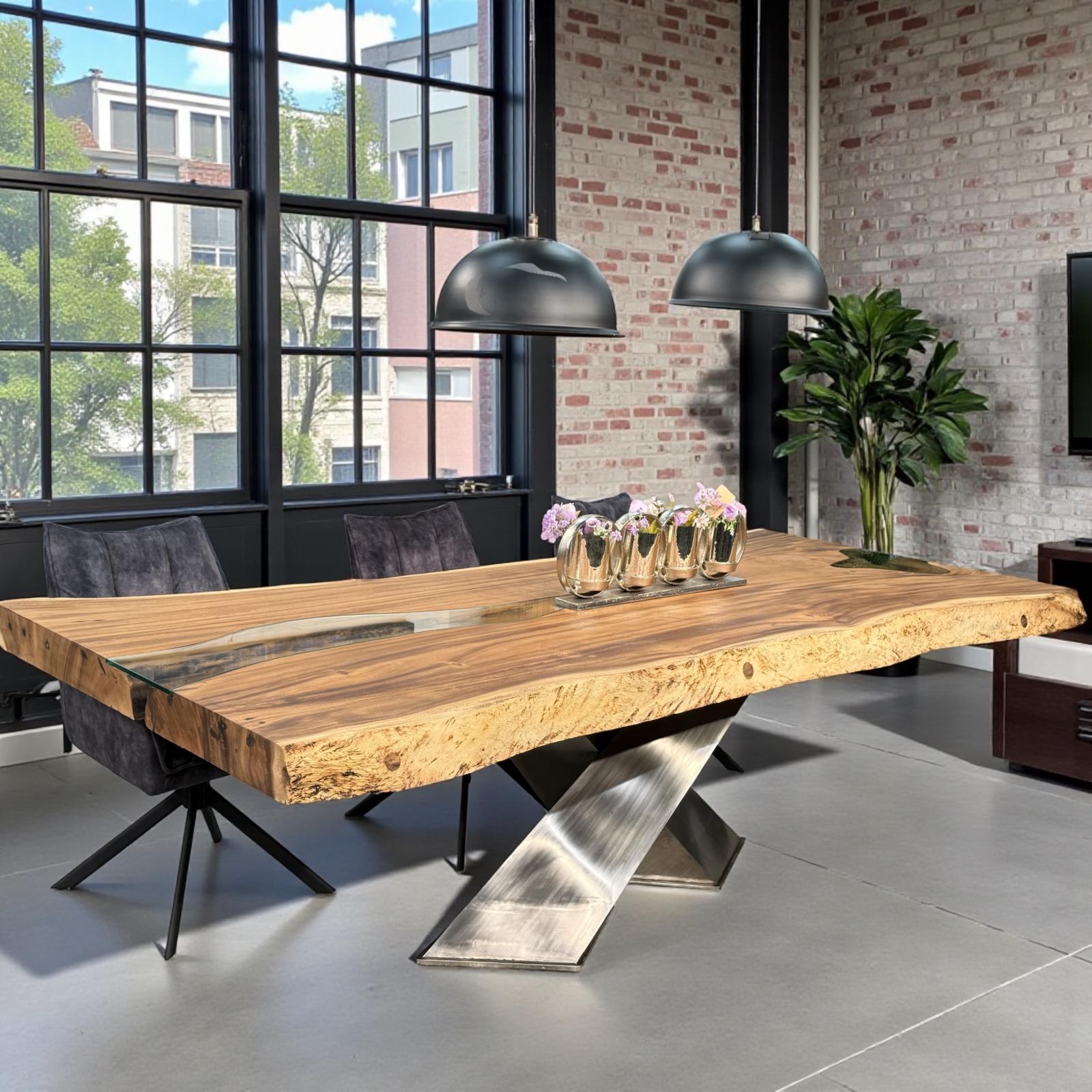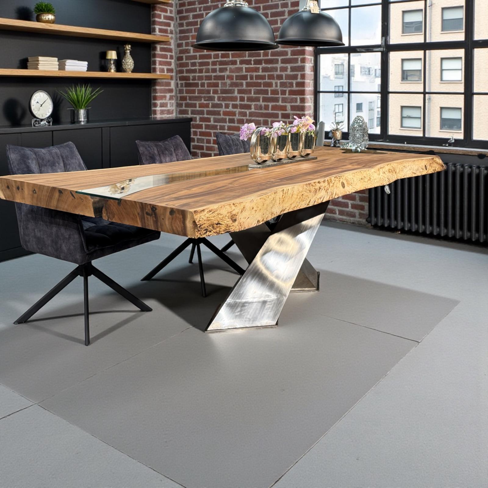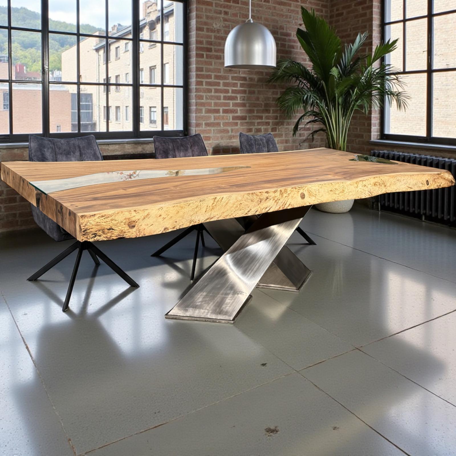 Dieser außergewöhnliche Esstisch / Besprechungstisch / Präsentationstisch aus massivem Suar-Baumstamm ist ein echtes Statement-Piece und verbindet natürliche Eleganz mit modernem Design.Zwei harmonisch integrierte Glaseinlagen öffnen den Blick auf die faszinierenden Strukturen des Holzes und verleihen dem Tisch eine besondere Leichtigkeit. Das imposante, dreidimensional gearbeitete Kreuzgestell aus gebürstetem Edelstahl unterstreicht die moderne Formsprache und sorgt gleichzeitig für höchste Stabilität. Die massive, plastische Gestaltung des Gestells macht es zu einem wahren Blickfang, der den außergewöhnlichen Charakter dieses Möbelstücks vollendet.