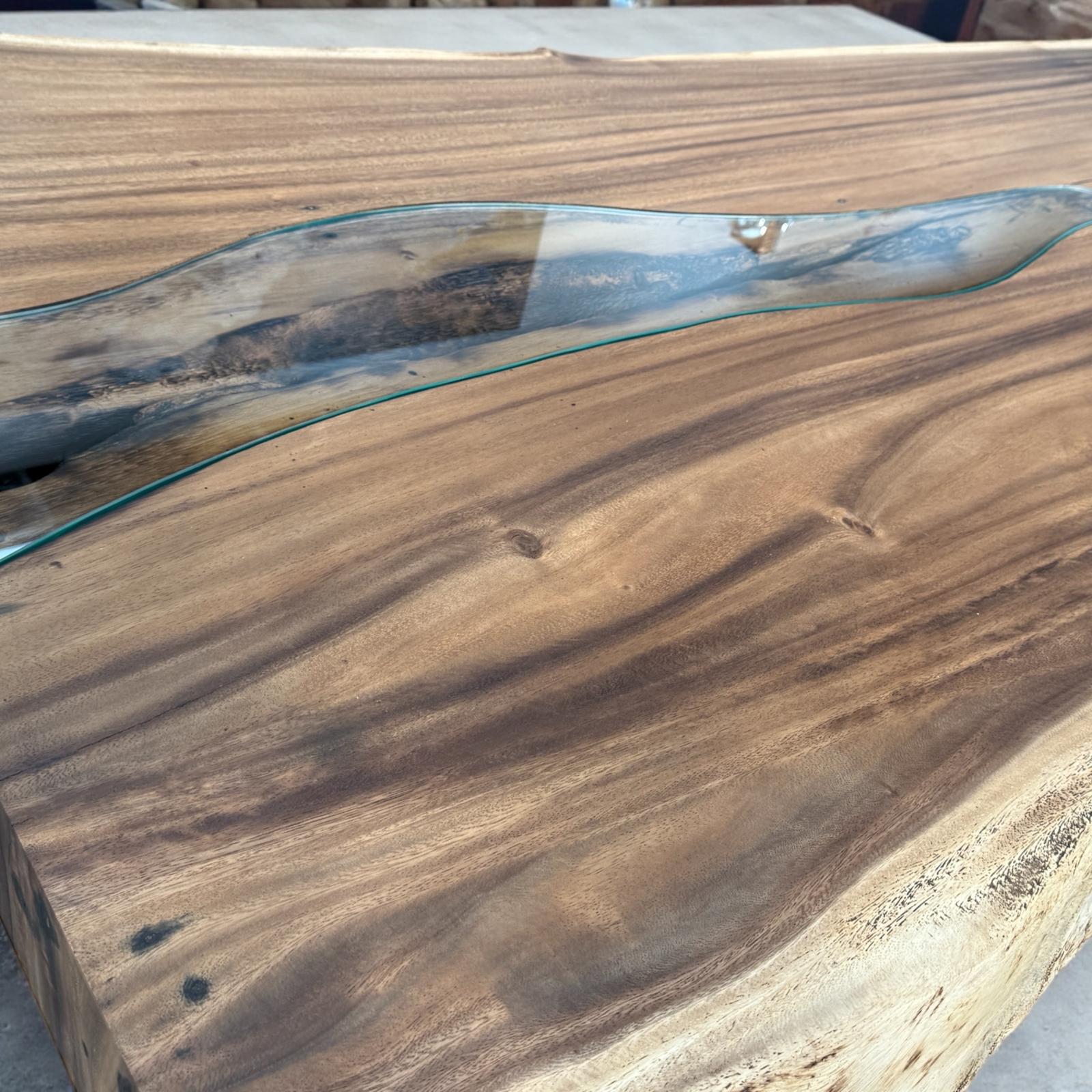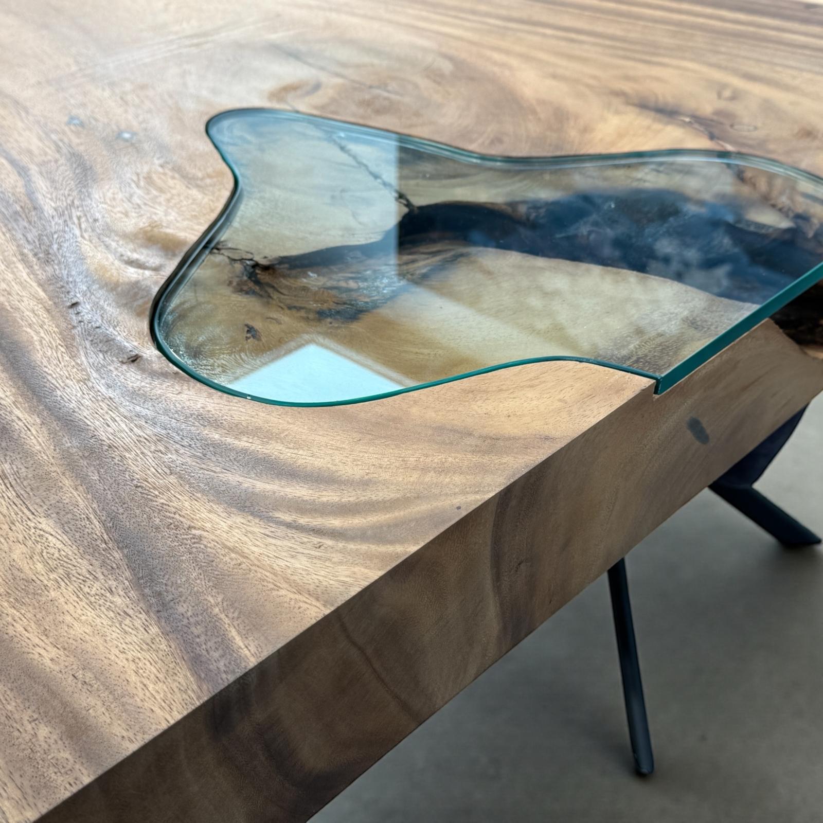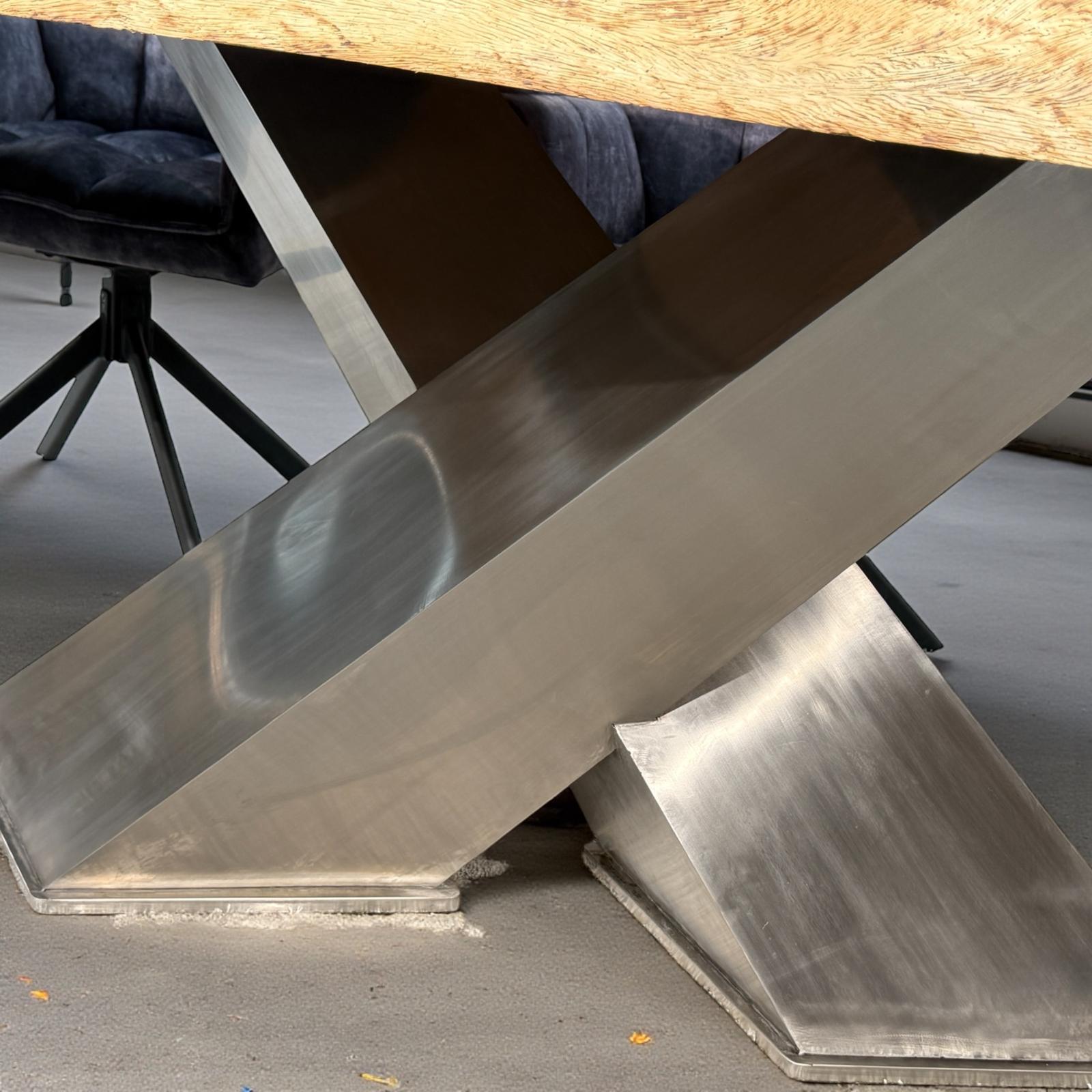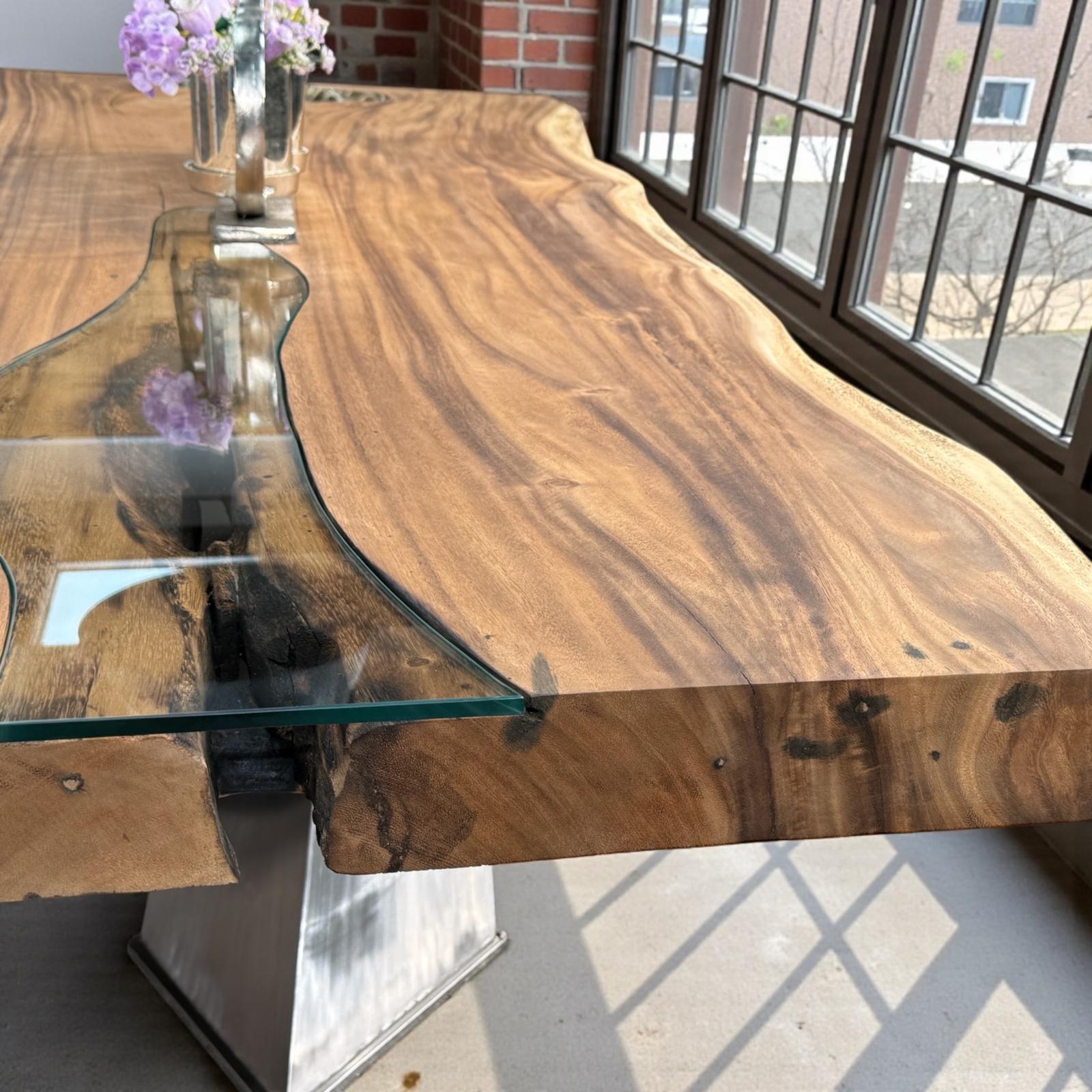 Dieser außergewöhnliche Esstisch / Besprechungstisch / Präsentationstisch aus massivem Suar-Baumstamm ist ein echtes Statement-Piece und verbindet natürliche Eleganz mit modernem Design.Zwei harmonisch integrierte Glaseinlagen öffnen den Blick auf die faszinierenden Strukturen des Holzes und verleihen dem Tisch eine besondere Leichtigkeit. Das imposante, dreidimensional gearbeitete Kreuzgestell aus gebürstetem Edelstahl unterstreicht die moderne Formsprache und sorgt gleichzeitig für höchste Stabilität. Die massive, plastische Gestaltung des Gestells macht es zu einem wahren Blickfang, der den außergewöhnlichen Charakter dieses Möbelstücks vollendet.