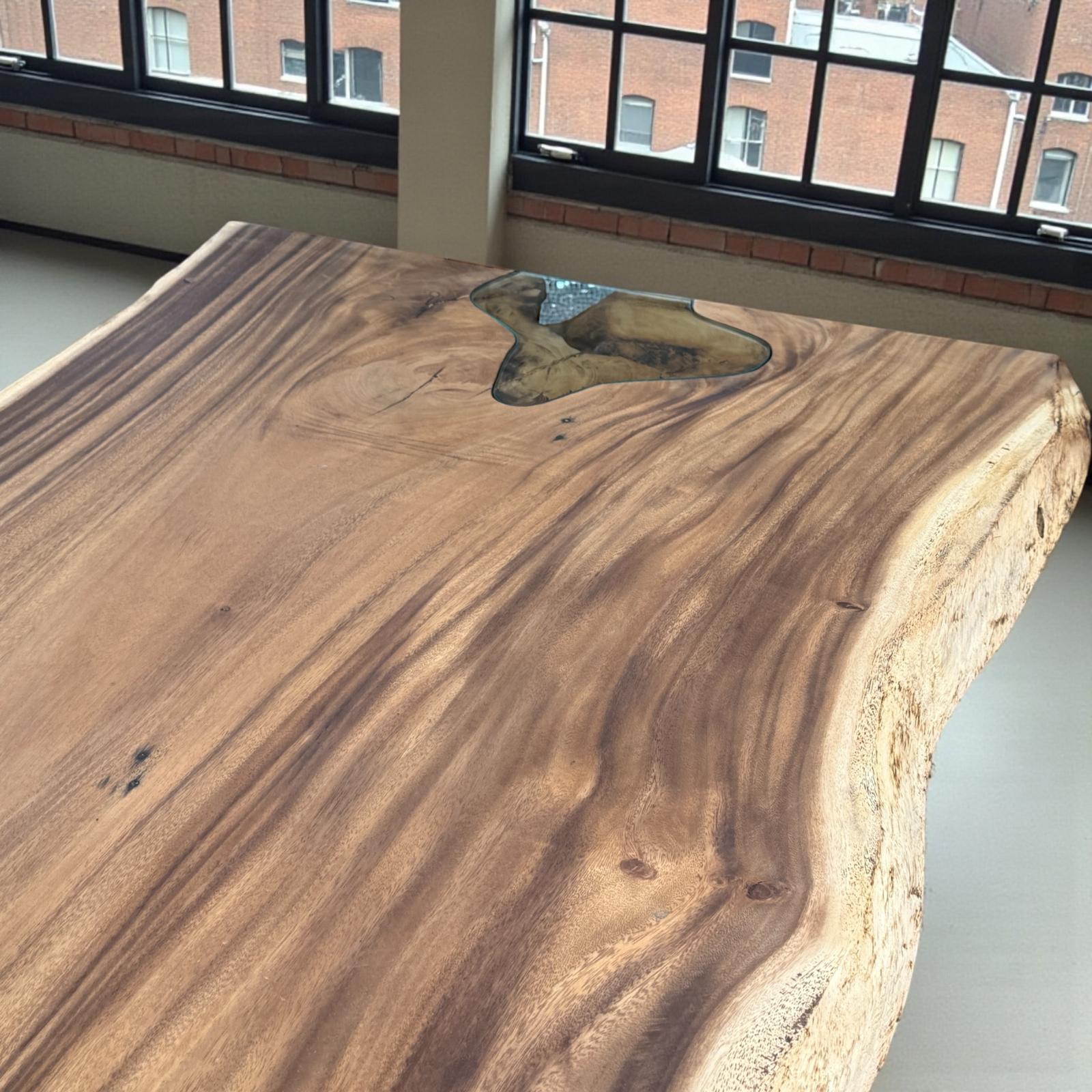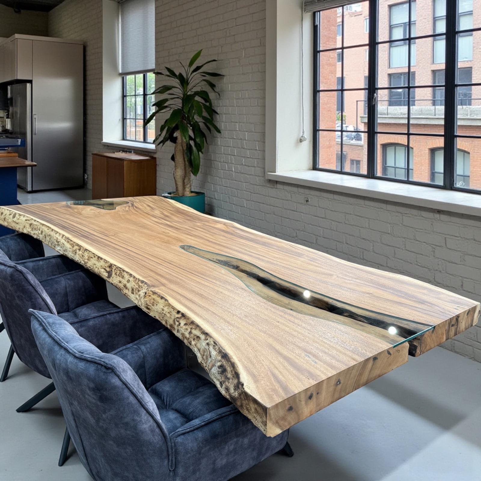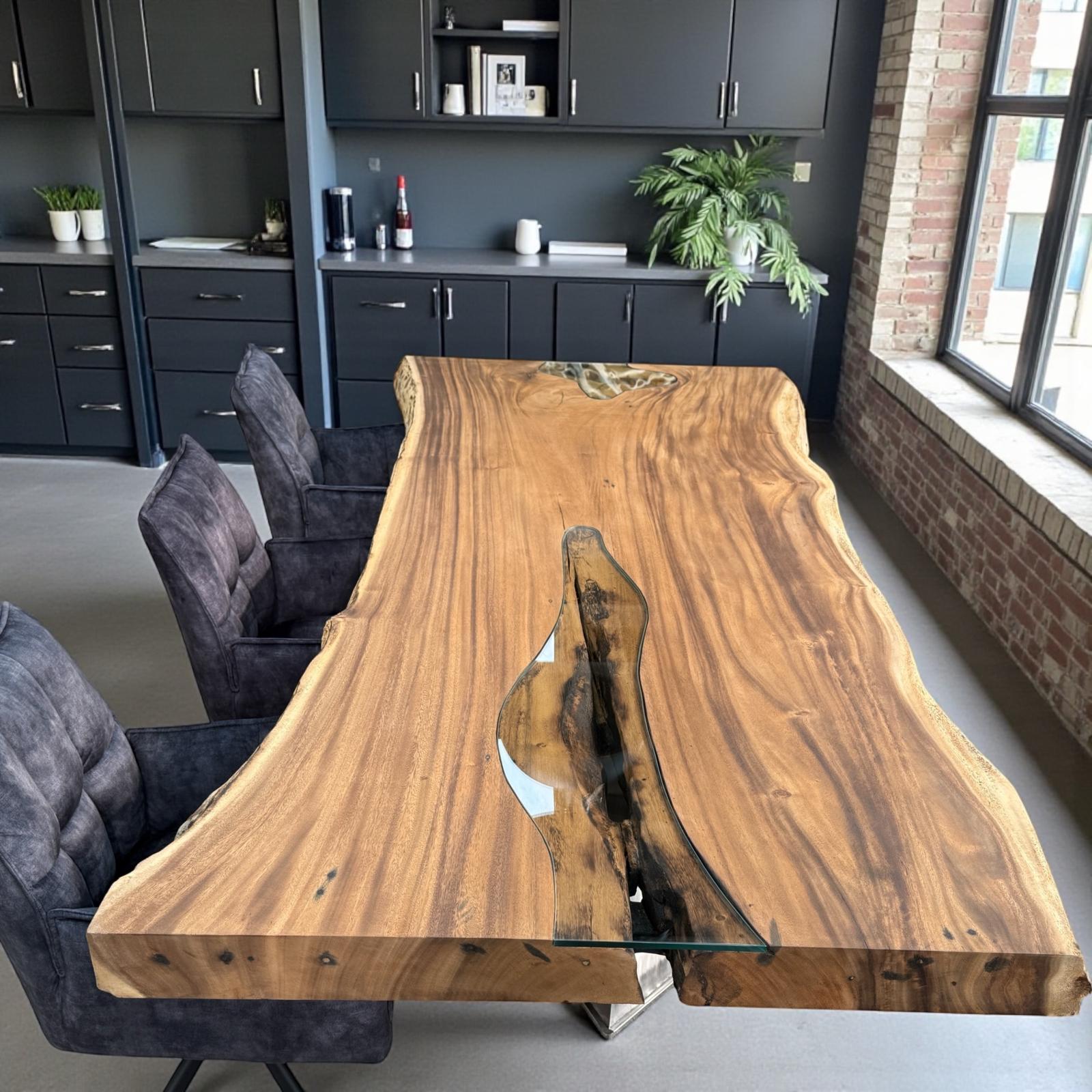 Dieser Designtisch ist nicht nur funktional, sondern ein echtes It-Piece, das jede Umgebung – ob Essbereich, Besprechungsraum oder Ausstellungsfläche – stilvoll aufwertet. Durch seine einzigartige Kombination aus Naturmaterial und moderner Konstruktion wird er zum Mittelpunkt jeder Einrichtung.