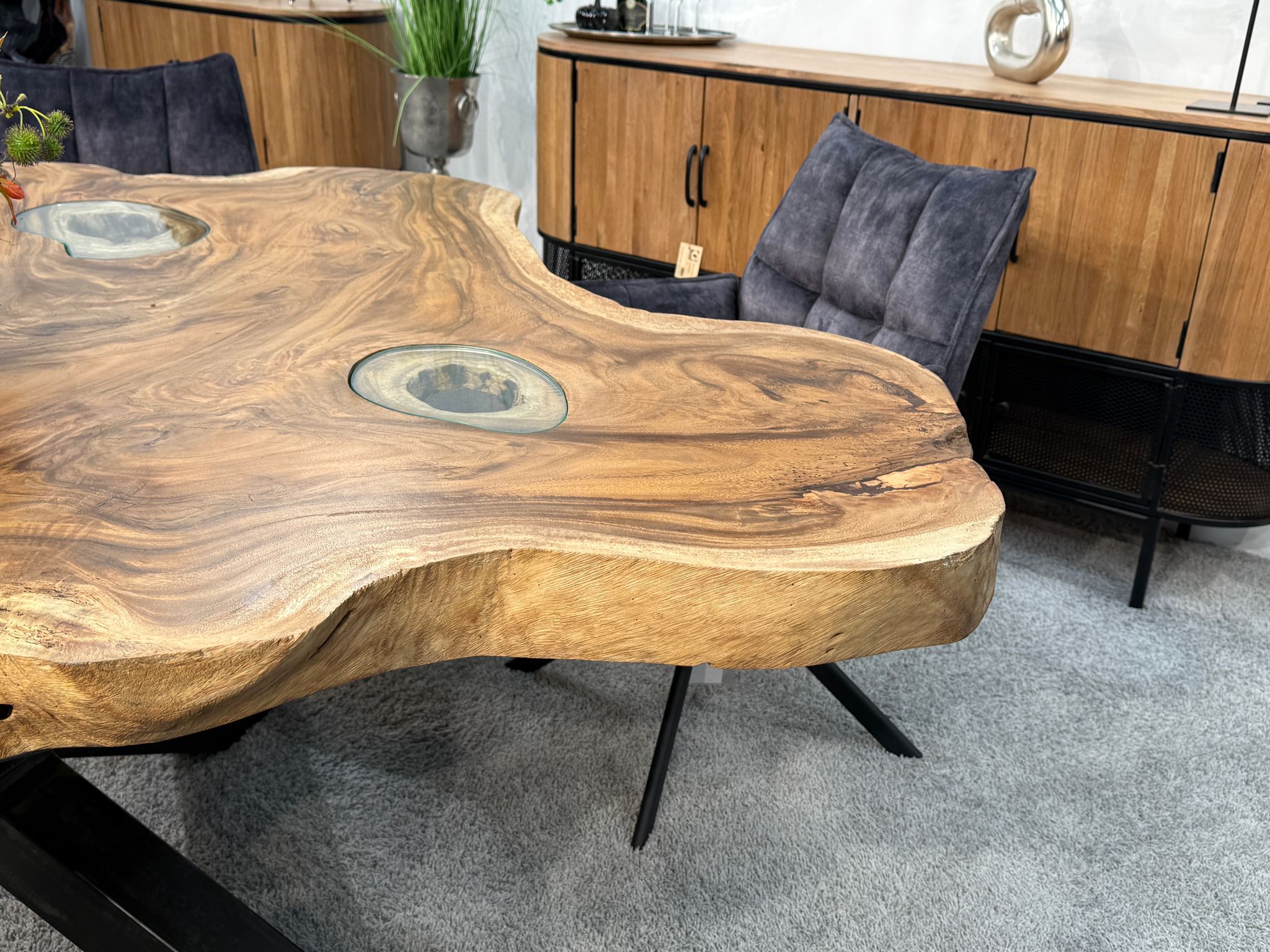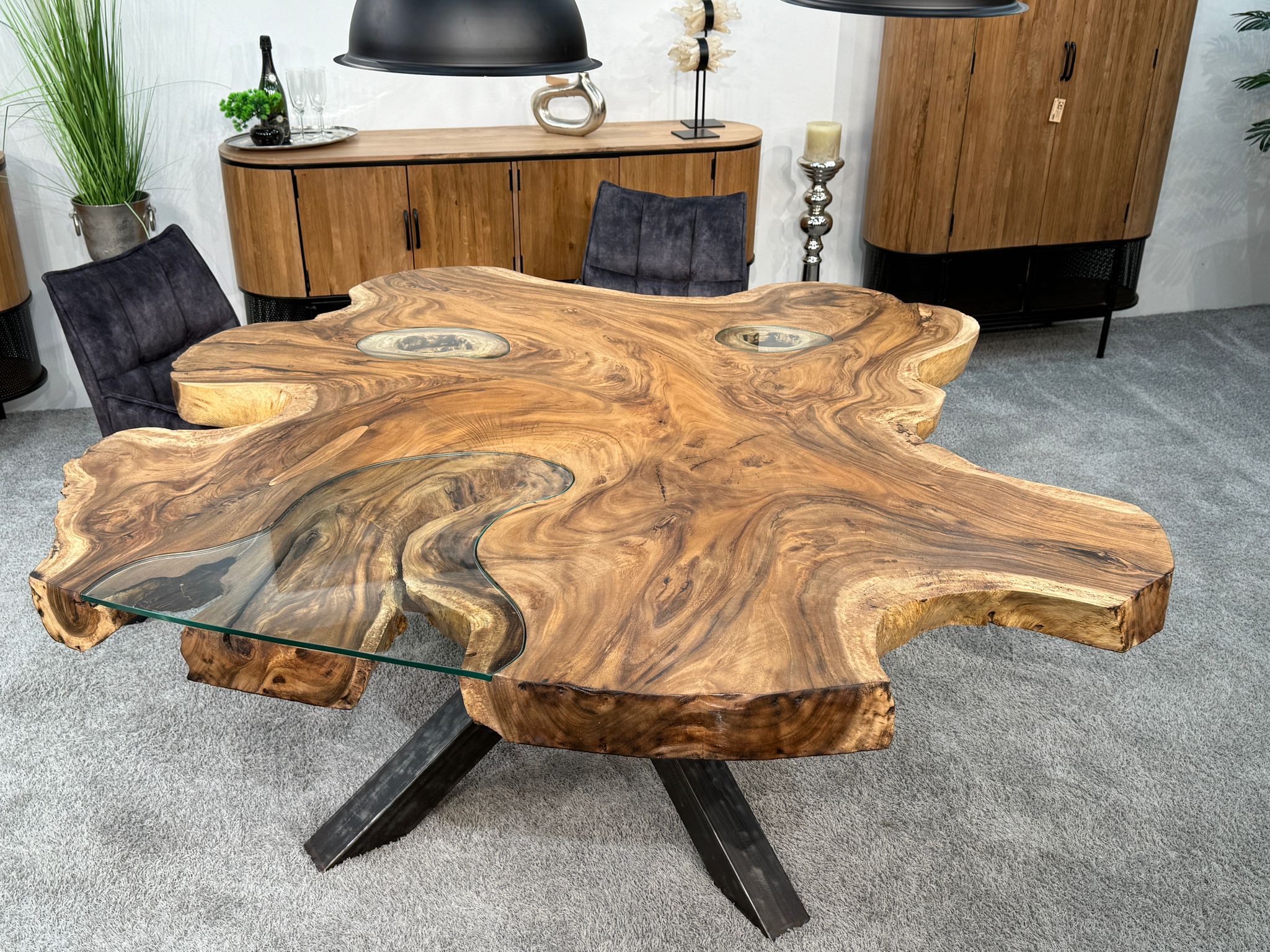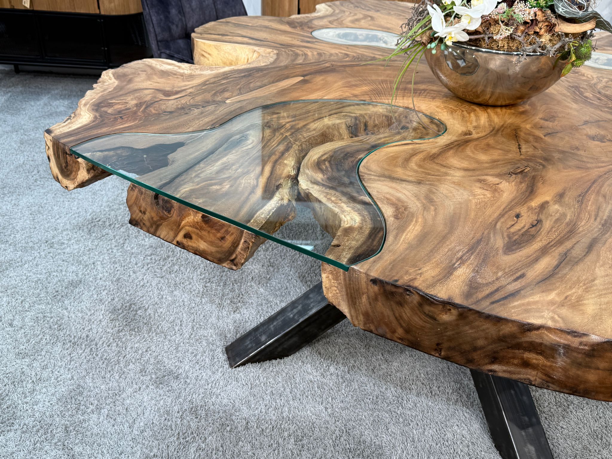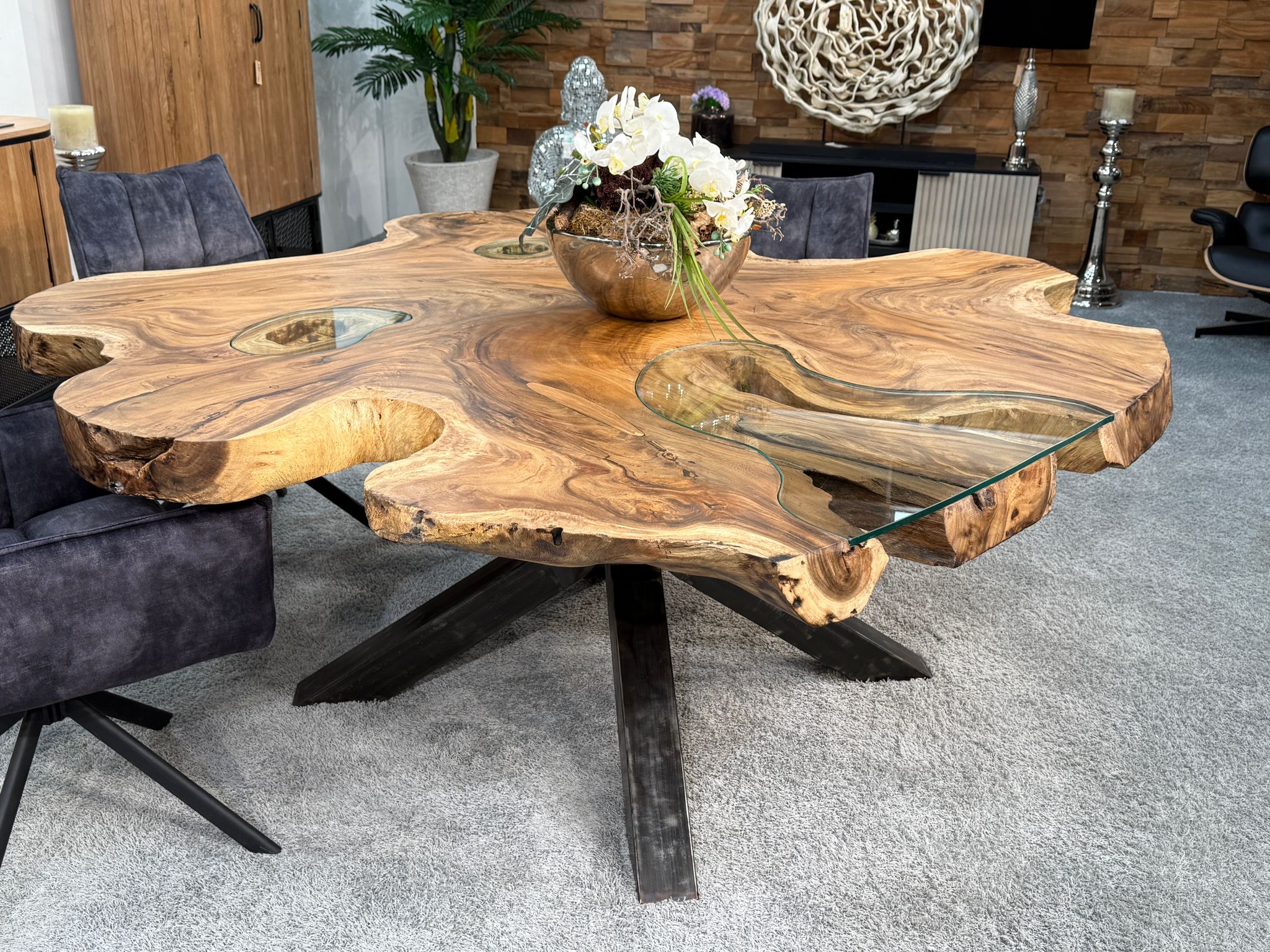 Massiver Esstisch aus einer massiven Suar-Baumscheibe mit Glaseinlage und Rohstahlgestell
