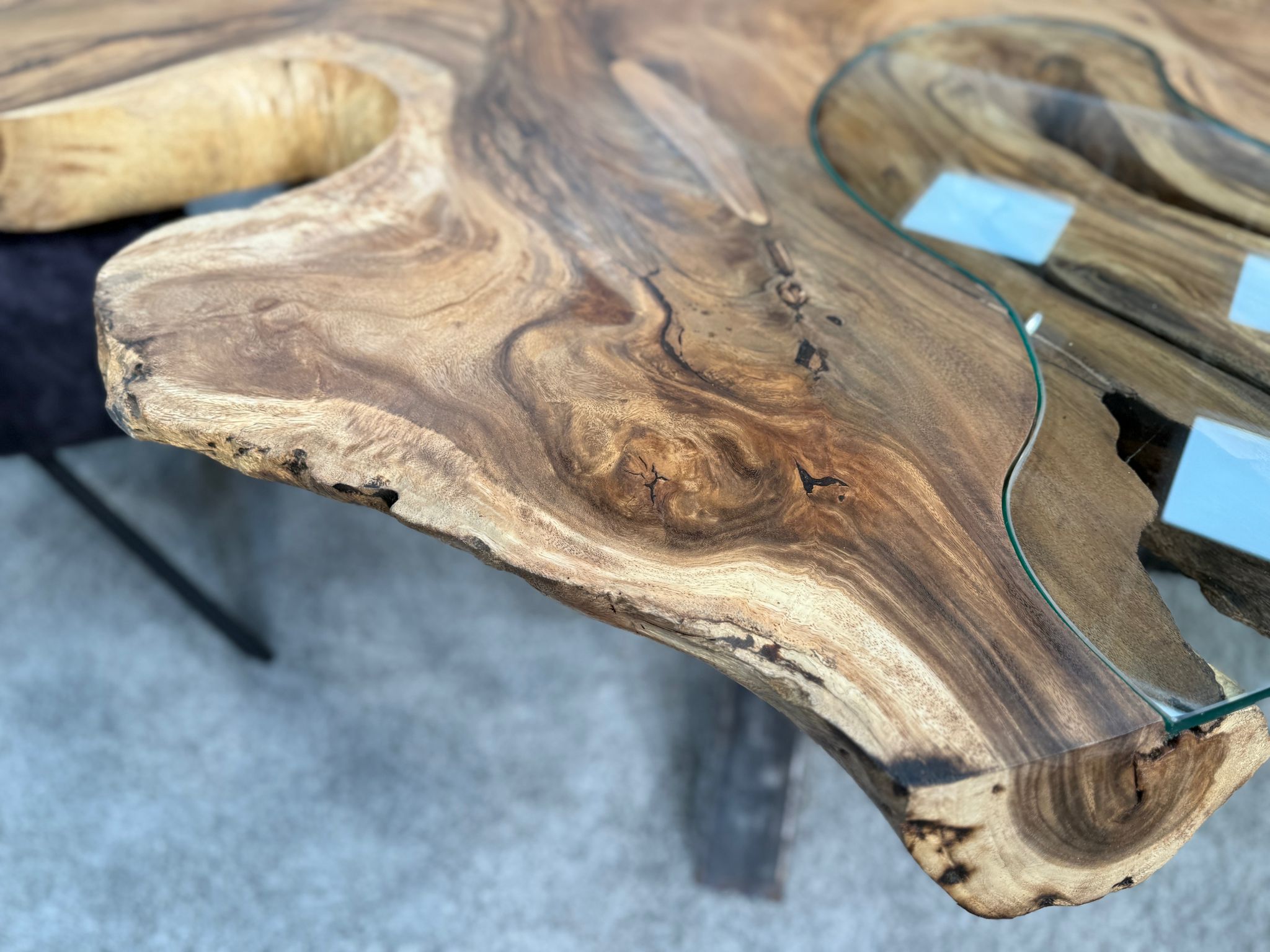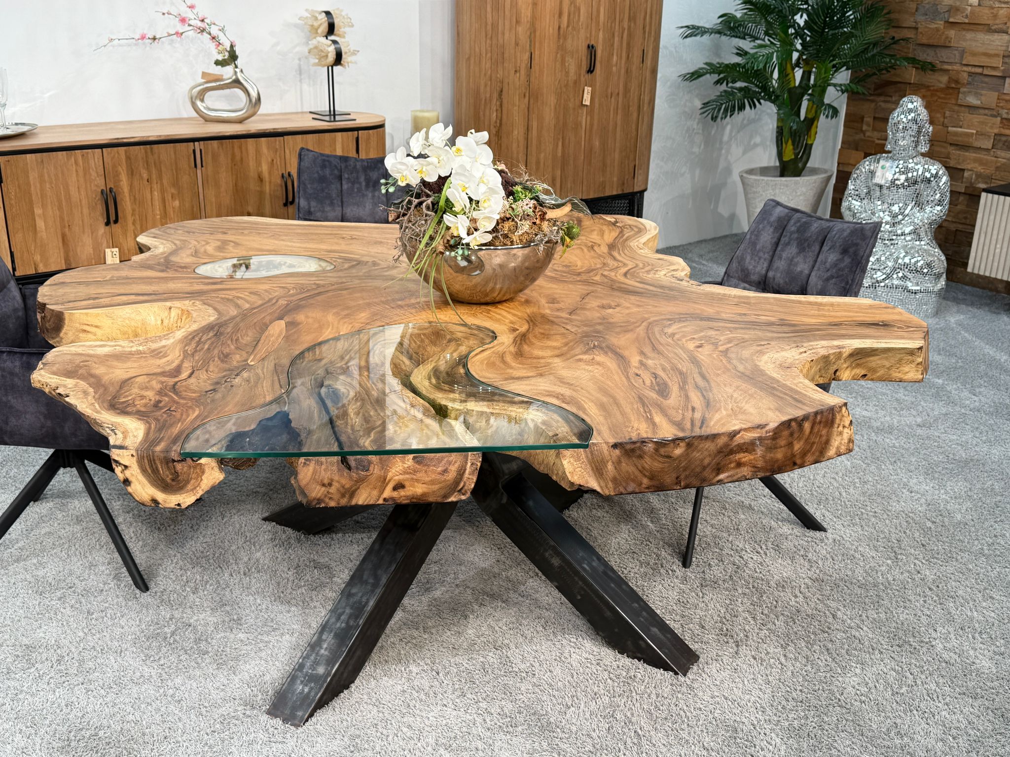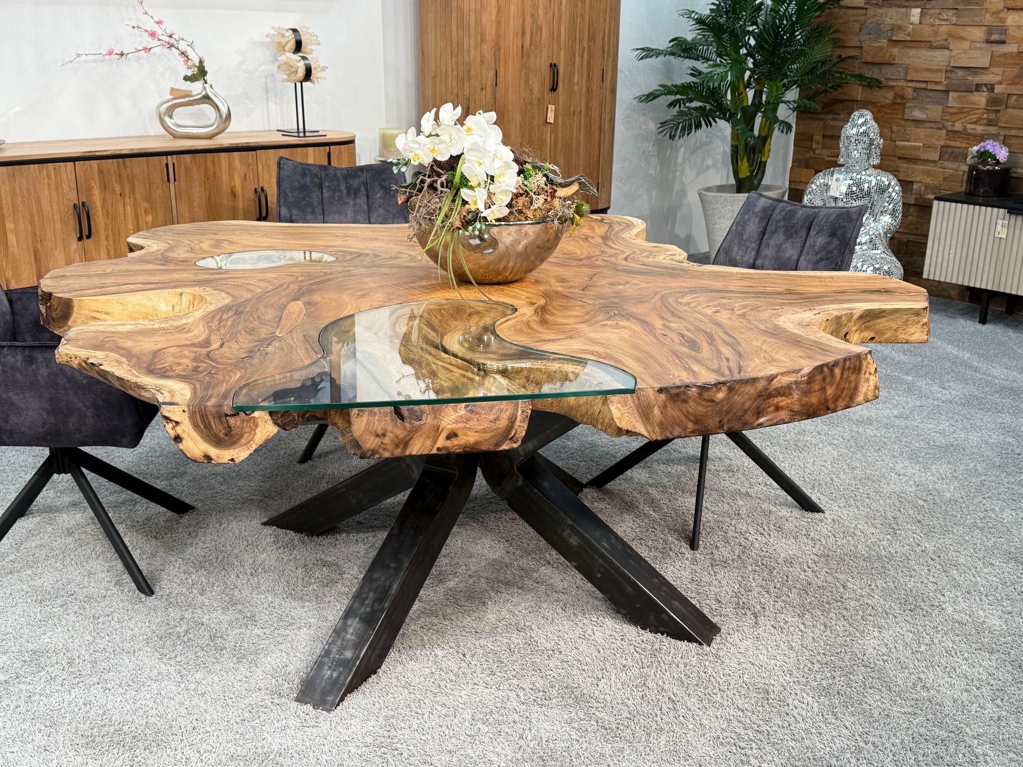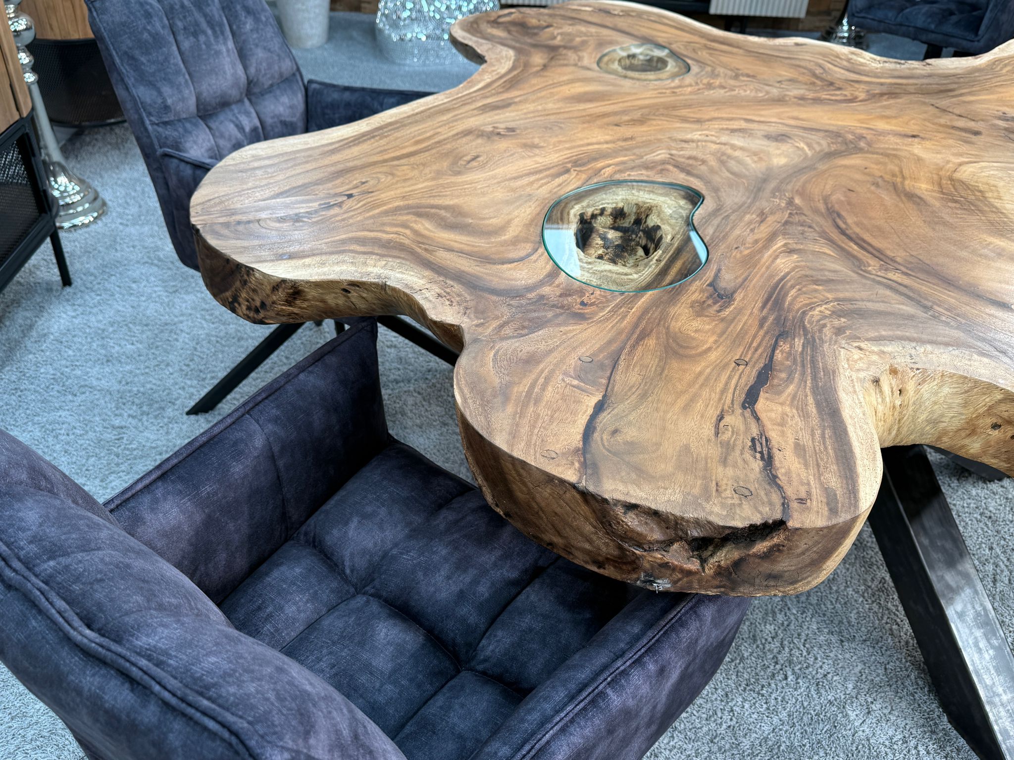 Massiver Esstisch aus einer massiven Suar-Baumscheibe mit Glaseinlage und Rohstahlgestell