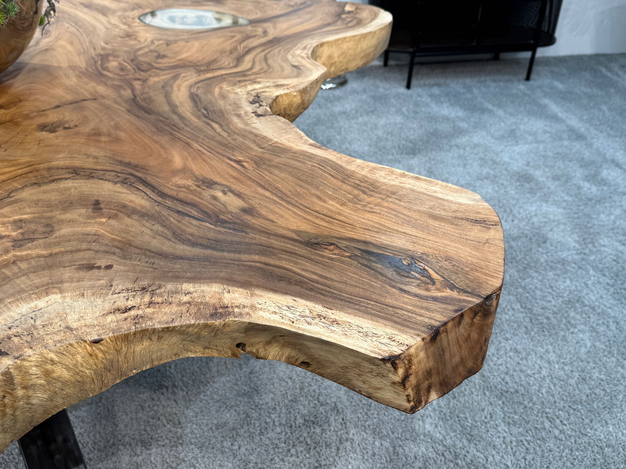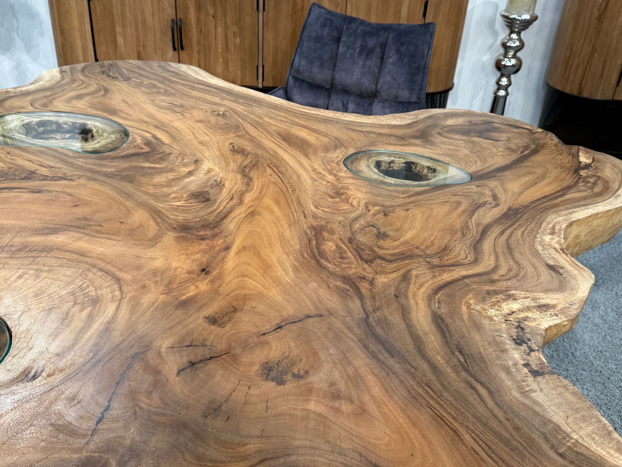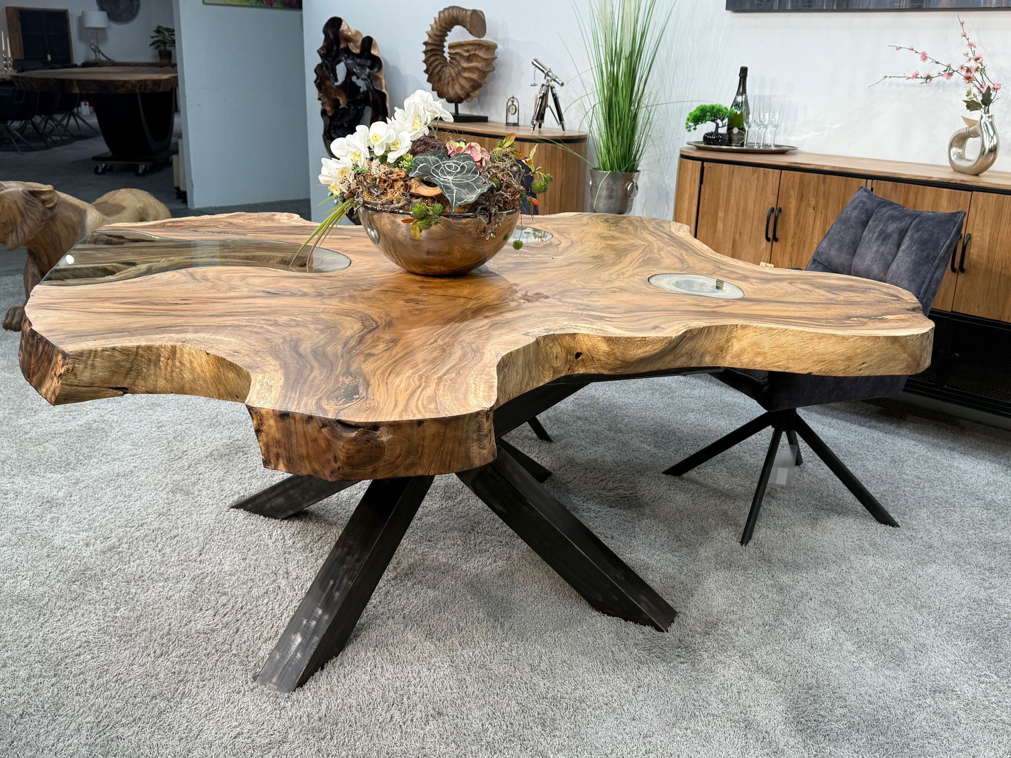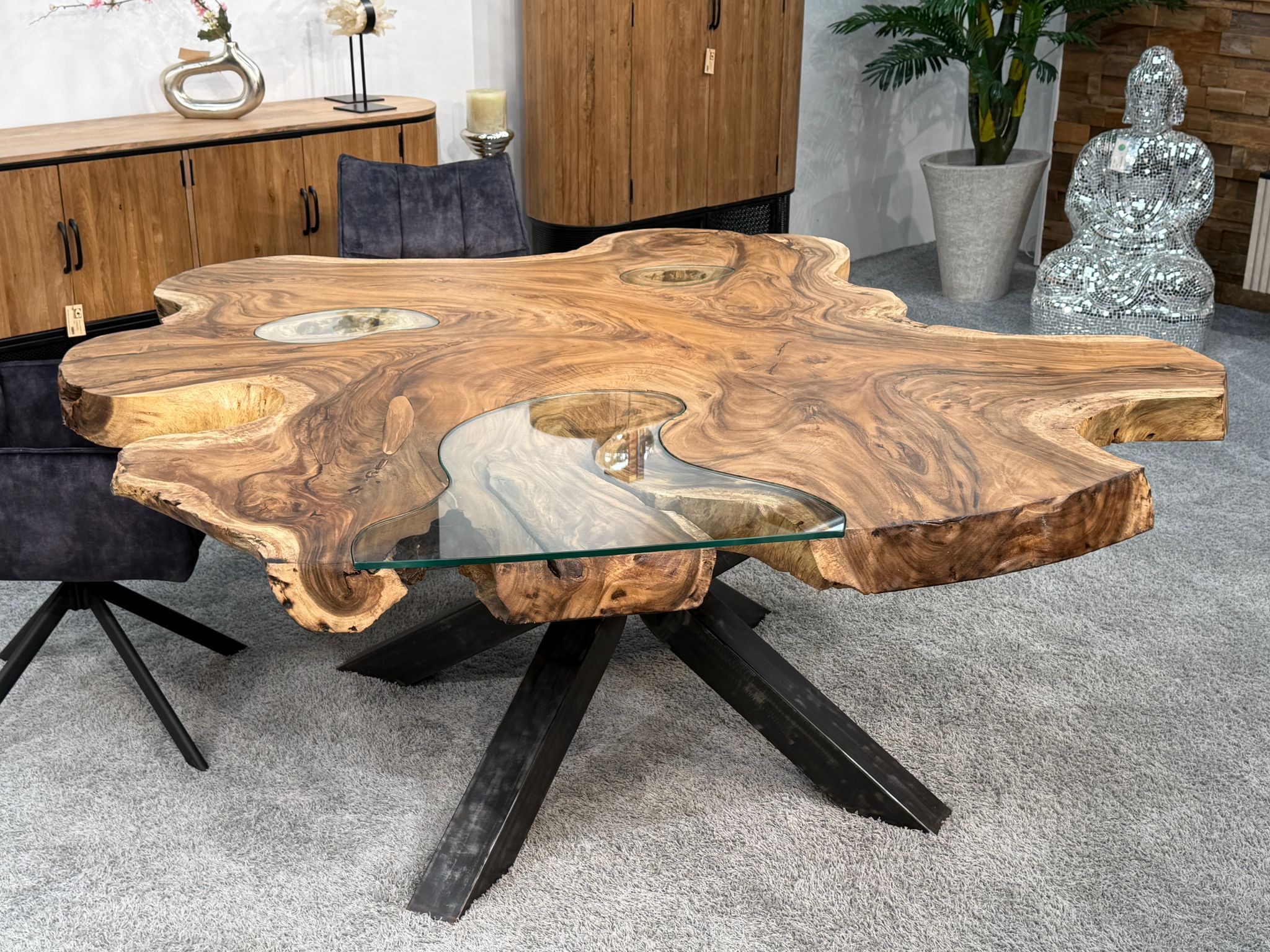 Massiver Esstisch aus einer massiven Suar-Baumscheibe mit Glaseinlage und Rohstahlgestell
