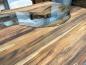 Bei diesem Esstisch aus Altholz bekommt der Begriff "Nachhaltigkeit" eine völlig neue Bedeutung. Die massive Tischplatte besteht aus verleimten Massivholzbohlen mit einer sagenhaften Stärke von 6 bis 7 cm. Die massiven Holzbohlen wurden aufwendig miteinander verleimt und von Hand geschliffen und gewachst. Die Bearbeitungsspuren der früheren Nutzung der massiven Balken wurden in Kleinarbeit mit Holzdübeln und Holzeinlegern verziert. Ein zusätzliches Designelement der Serie "Landscape" sind die mittig eingearbeiteten Glaseinleger, der den Blick in das Innere der Tischplatte ermöglichen.