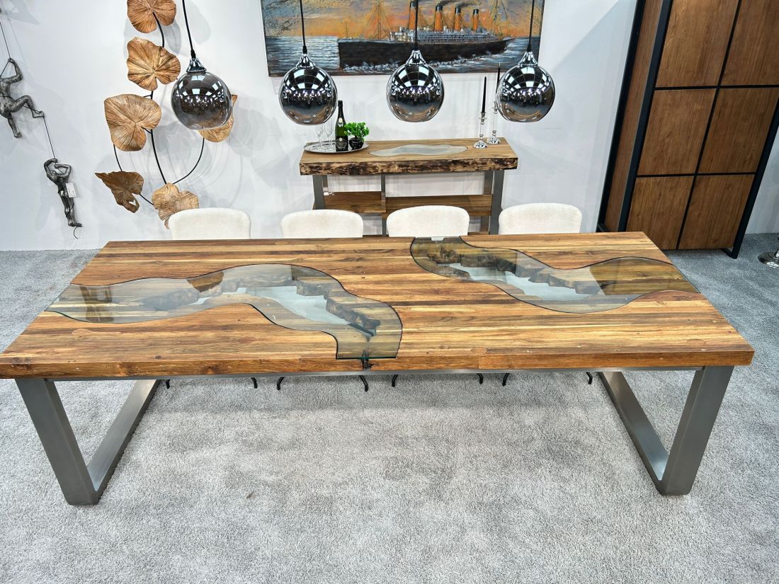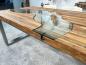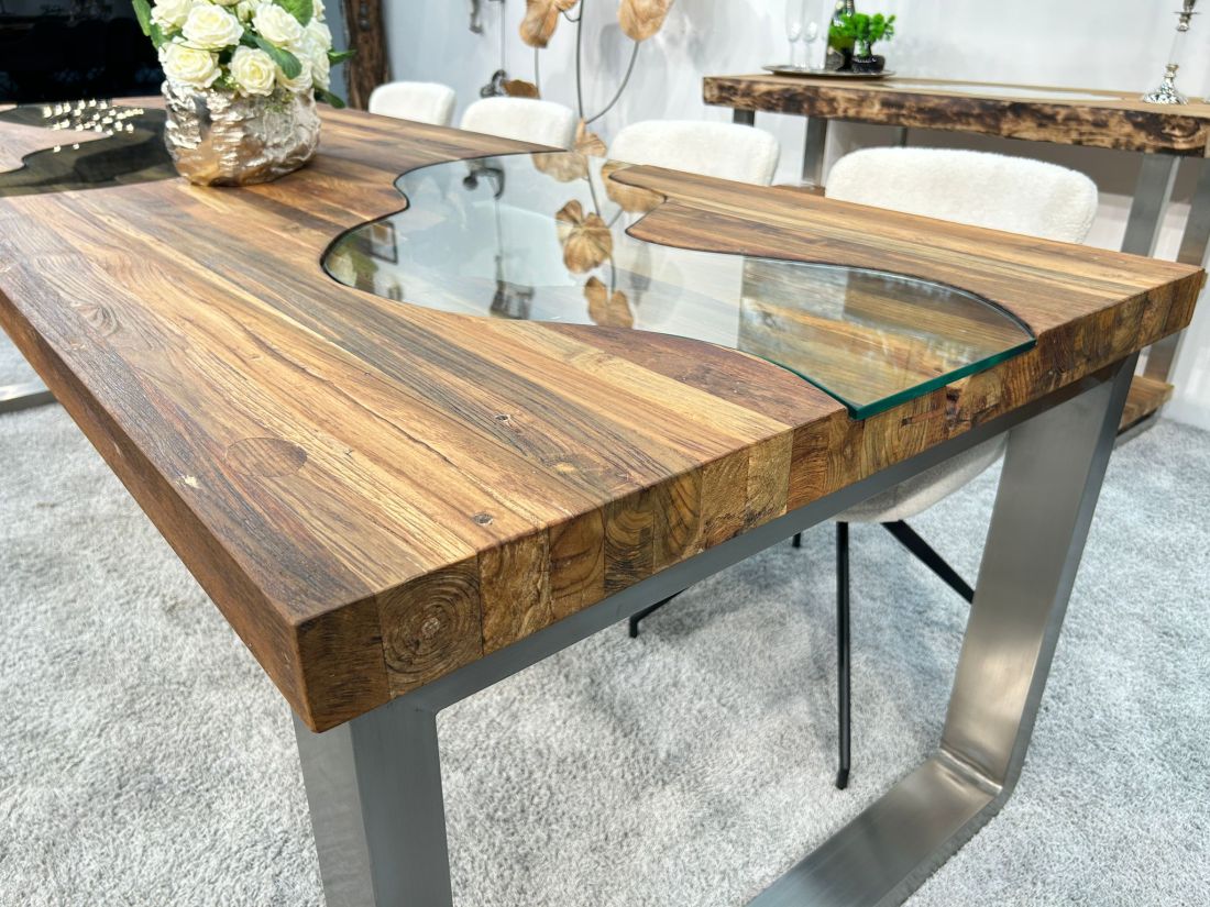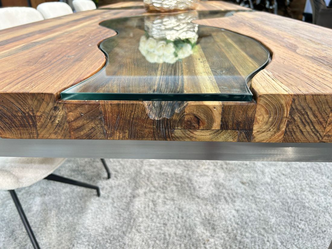Recyceltes Teakholz, Tischgestell aus Edelstahl und zwei eingearbeiteten Glaseinlegern