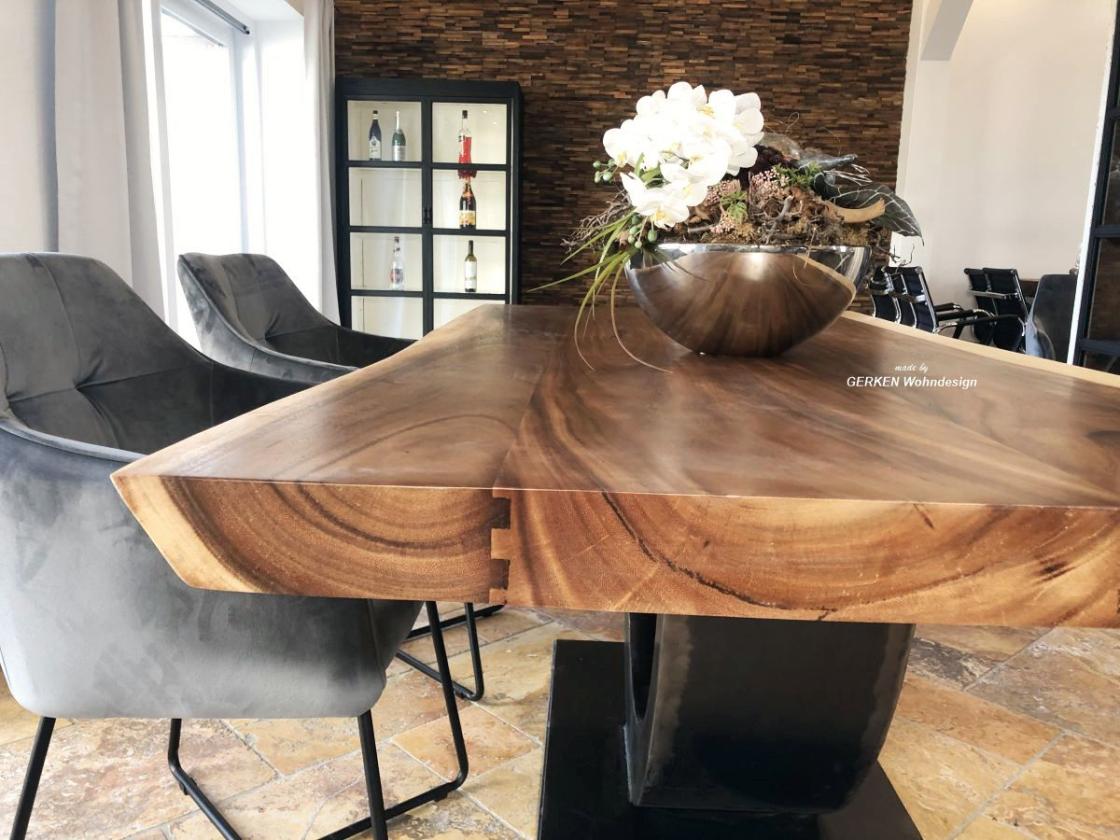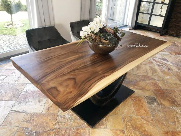 Modell: Esstisch "Meridian" Format: Länge 200 cm, Breite 100 cm, Höhe ca. 76 cm, Stärke der massiven Tischplatte ca. 8 cm Material: Holzart "Suar", Tischplatte aus massiven Holzbohlen (verleimt),