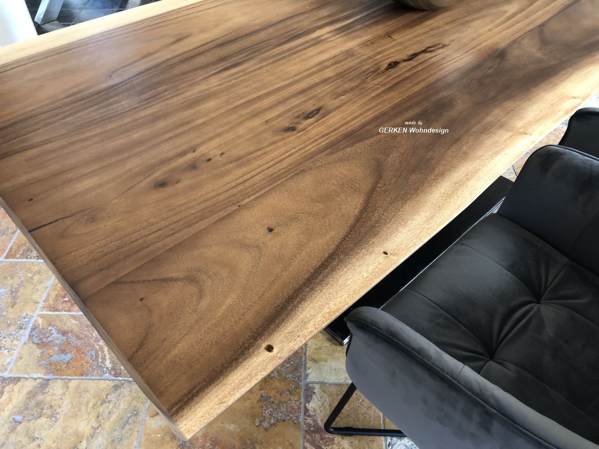 Durch die Verwendung von Kernholz erhält die Tischplatte einen einzigartigen Charakter mit einer wunderbar betonten Holzstruktur, die aufgrund der aufwendigen Verleimung, anders als eine vollstämmige Platte, weniger zu Verwindungen neigt.