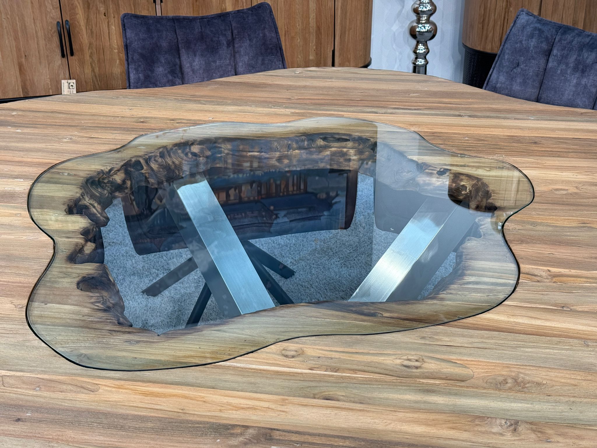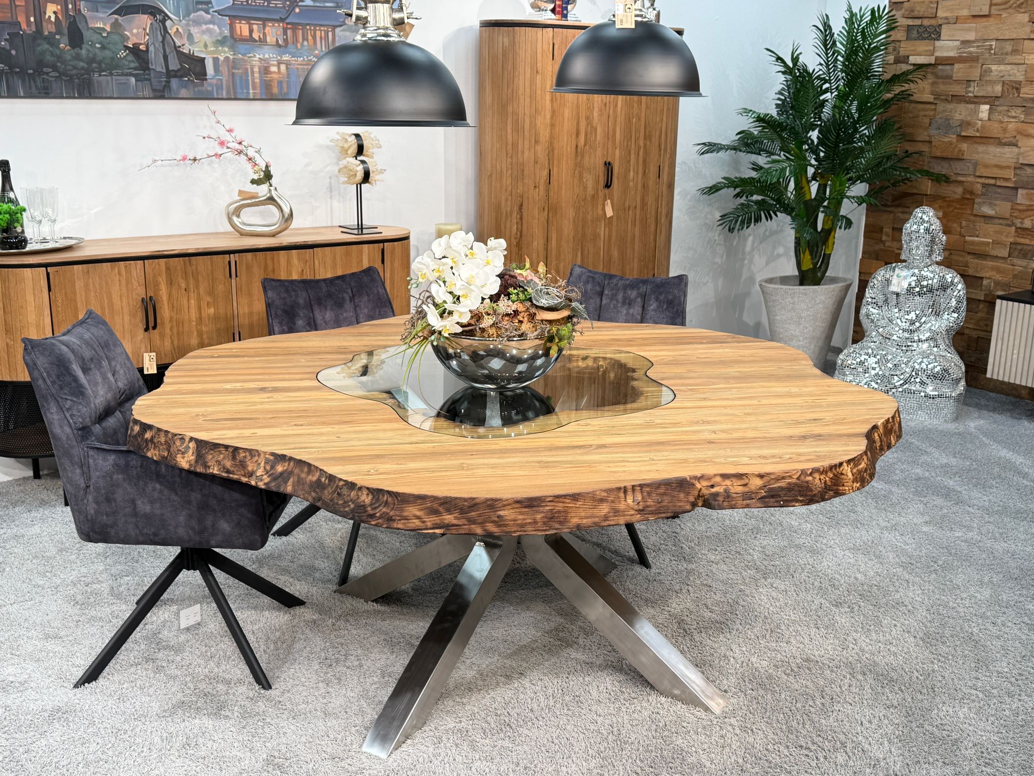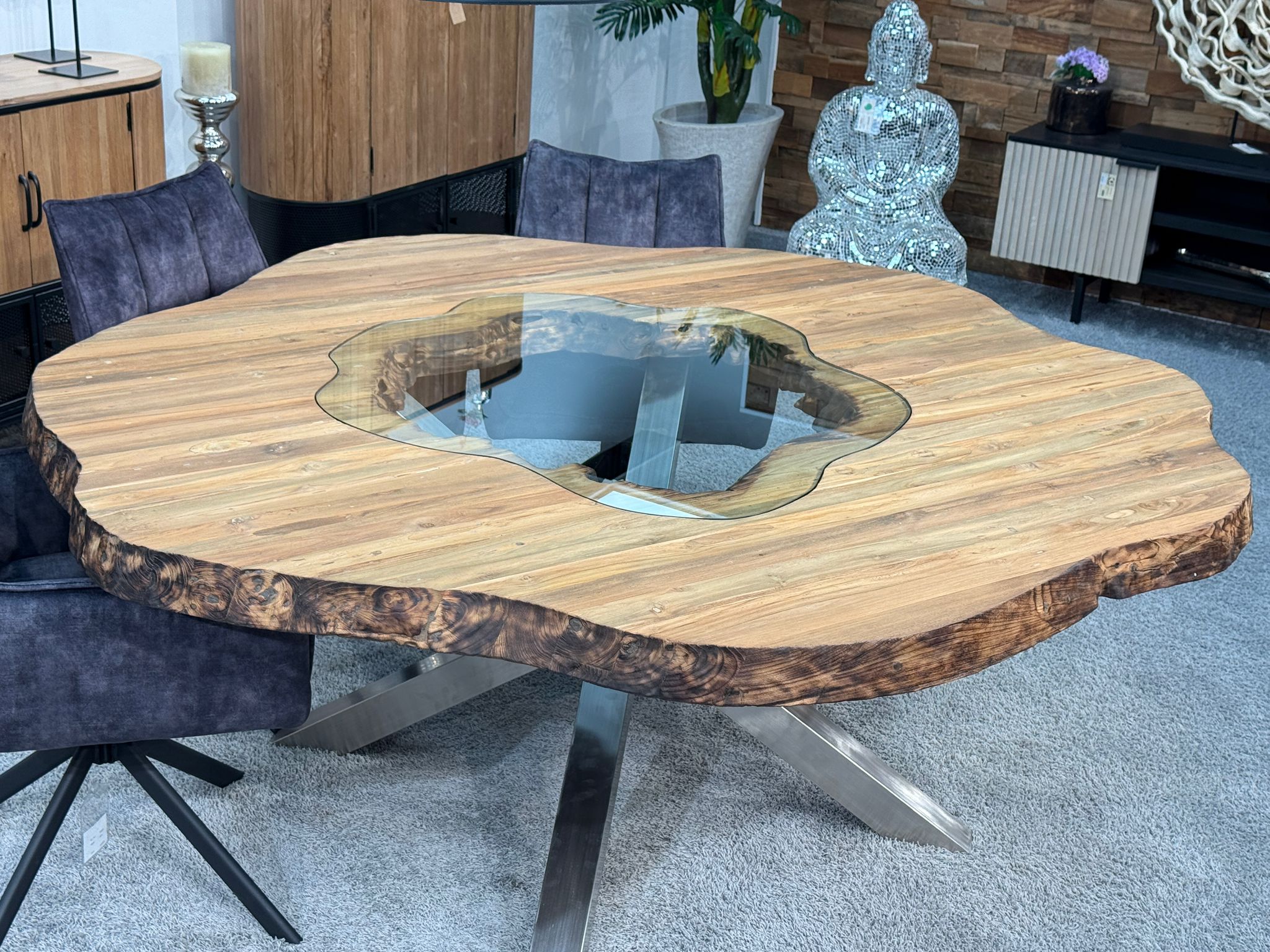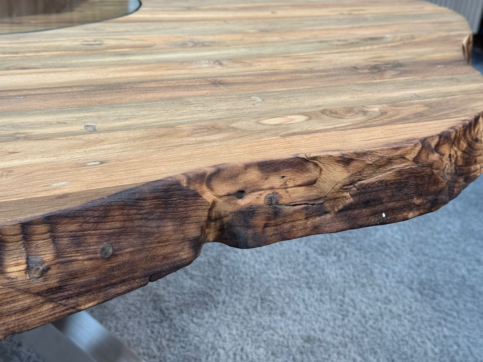 Ein besonderes Highlight bildet das eingefräste Glas-Element mit einer Stärke von 10 mm, das einen spannenden Materialmix schafft und dem Design zusätzliche Tiefe verleiht. Getragen wird die kräftige, ca. 8 cm starke Tischplatte von einem stabilen und modernen Edelstahlgestell, das einen stilvollen Kontrast zum warmen Altholz bildet und dem Tisch seine elegante, zeitlose Ausstrahlung verleiht.