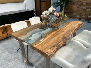 Wer einen eckigen Massivholztisch sucht, der natürliche Baumkanten mit edlem Design-Handwerk verbindet, wird beim Old Elements fündig. Hier treffen massives, recyceltes Teakholz und optional eine eingelassene Glaseinlage auf ein stabiles, gebürstetes Edelstahlgestell. Das Ergebnis: Ein stilvoller Hingucker für Esszimmer, Küche oder moderne Lofts. Die ca. 60-80 mm starke Tischplatte bringt die lebendige Maserung perfekt zur Geltung, während die Naturkante jedes Stück zum Unikat macht.