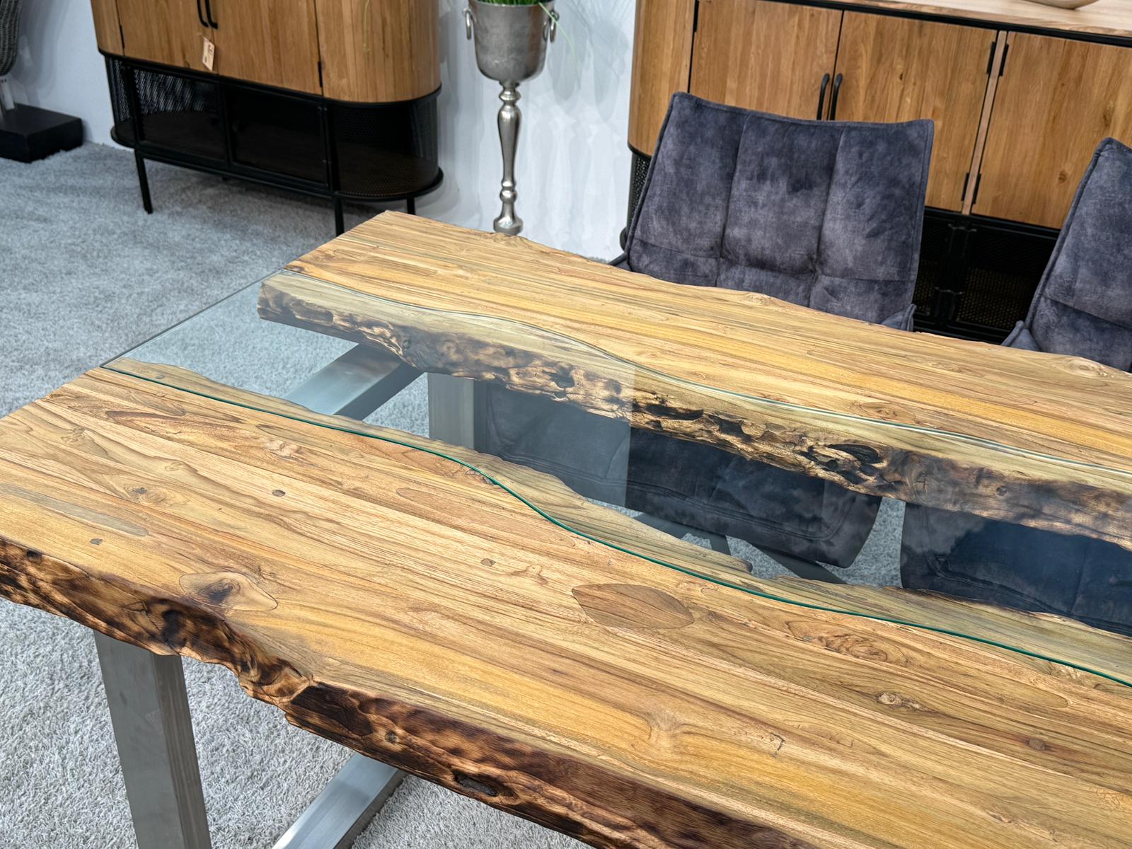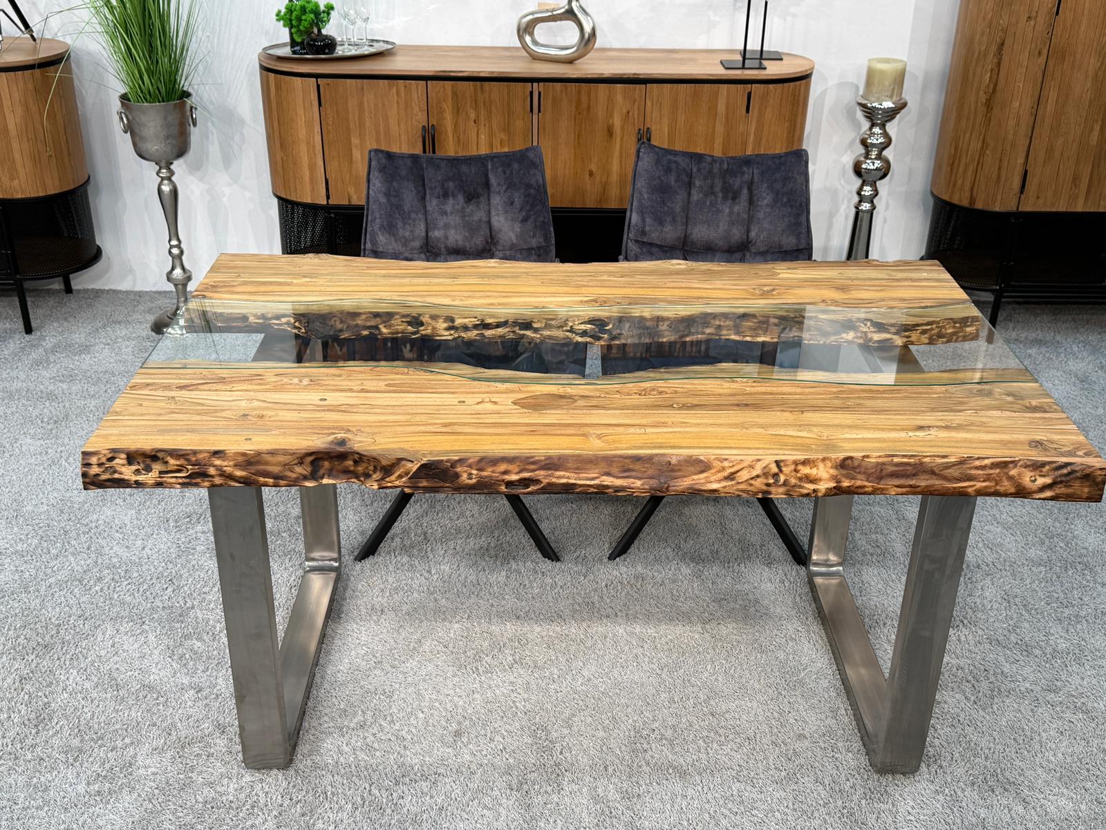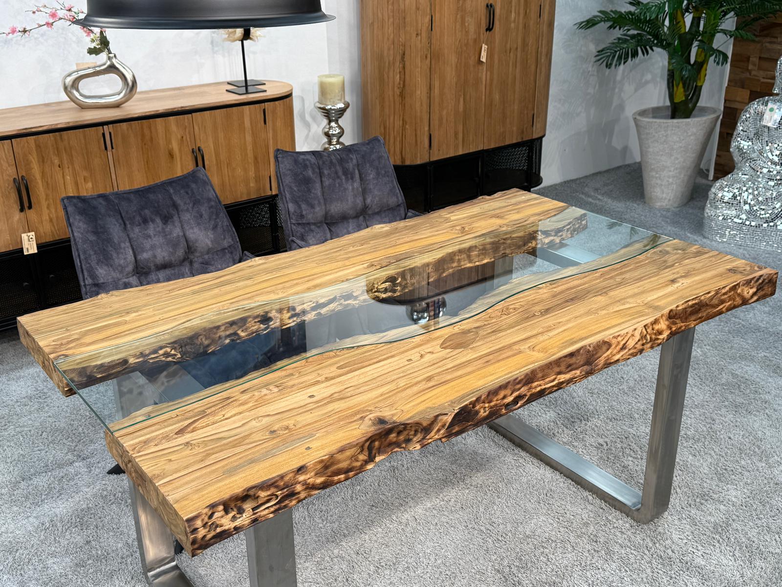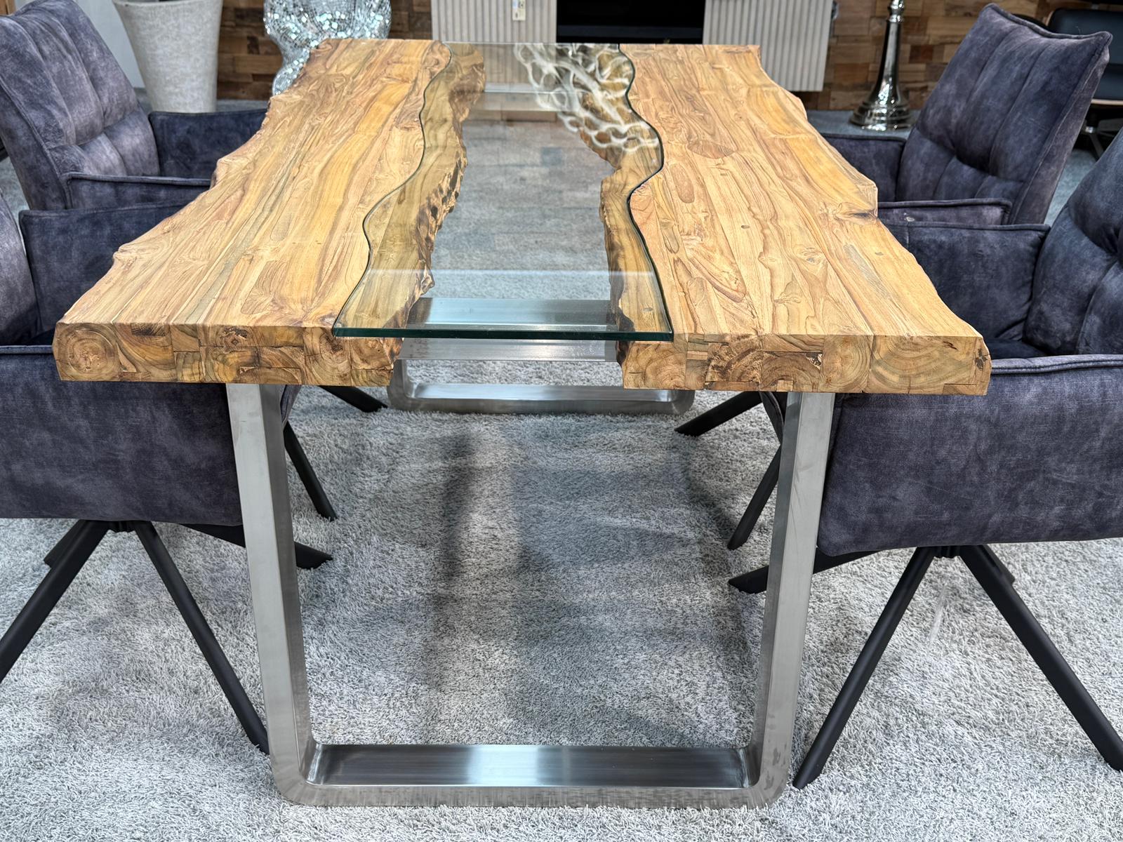 Bei diesem Esstisch handelt es sich um eine interessante Kombination aus den Rohstoffen Altholz, Glas und Edelstahl. Verwendet wurden verleimte Altholzbohlen aus Teak. Durch die Verwendung von Altholz erhält dieser Esstisch seine ganz besondere Optik. Die von Hand zusammengefügte Tischplatte liegt auf zwei eigens angefertigten Tischkufen aus gebürstetem Edelstahl.