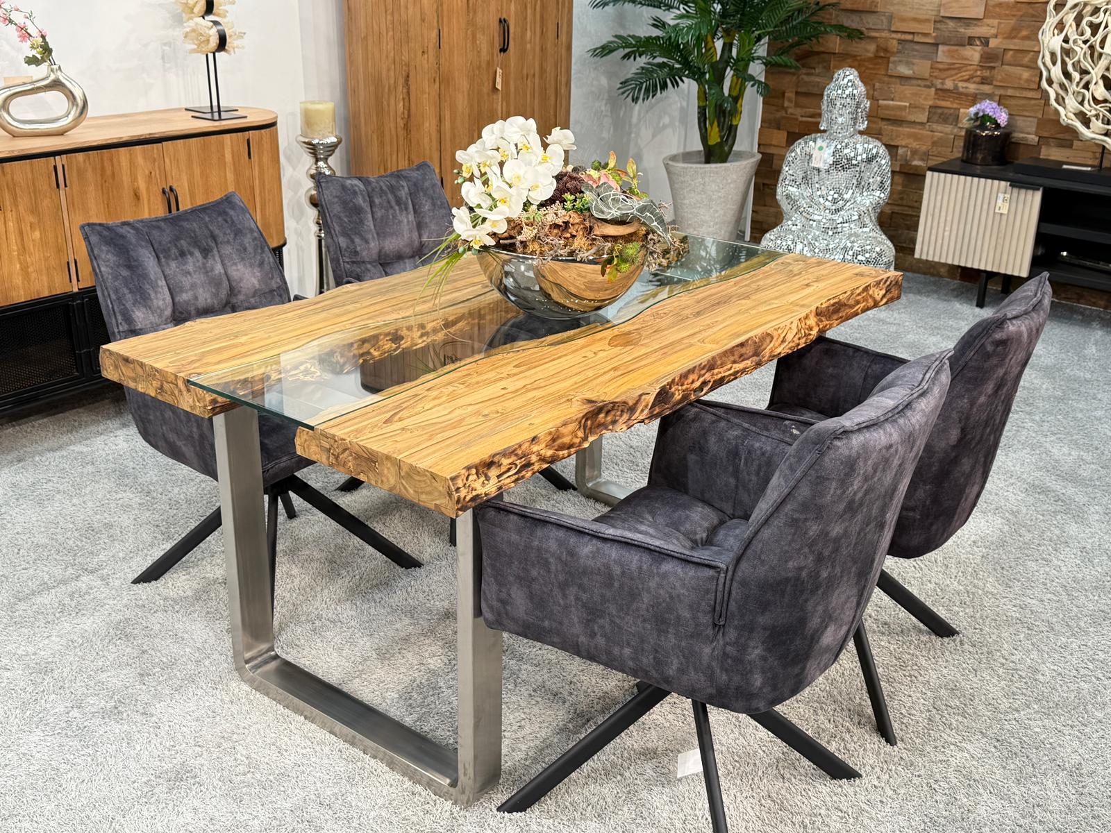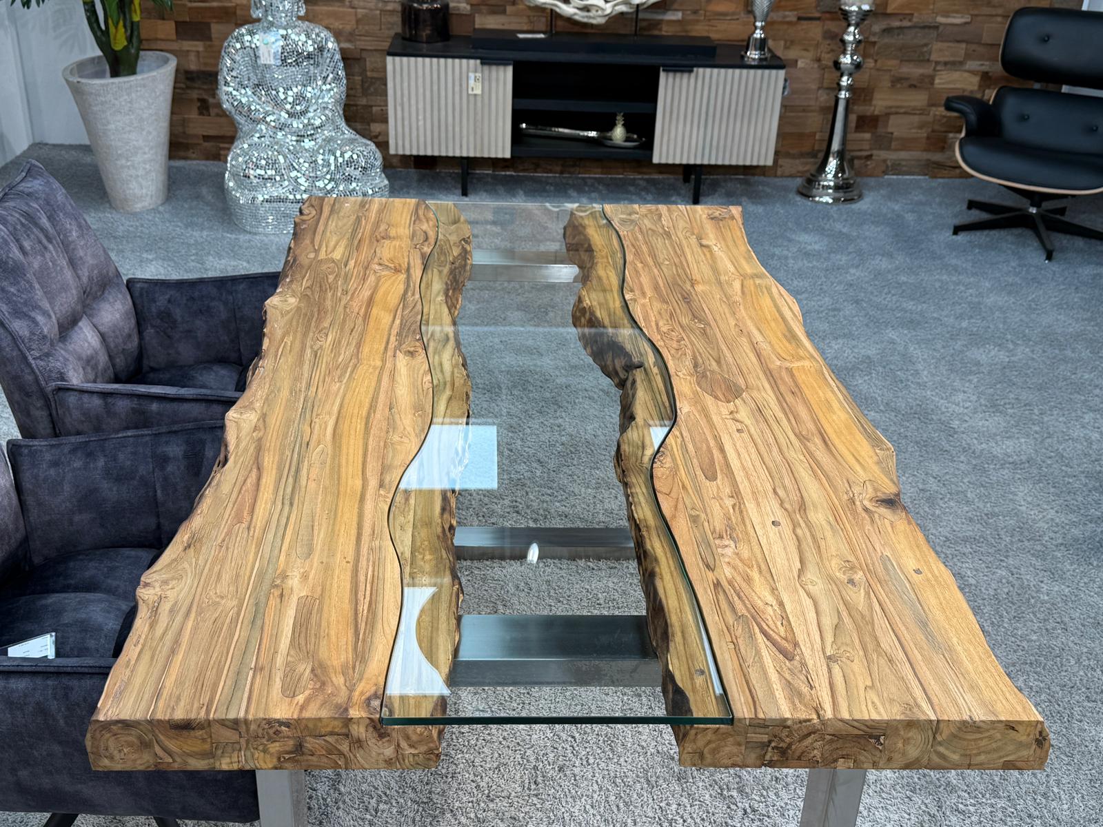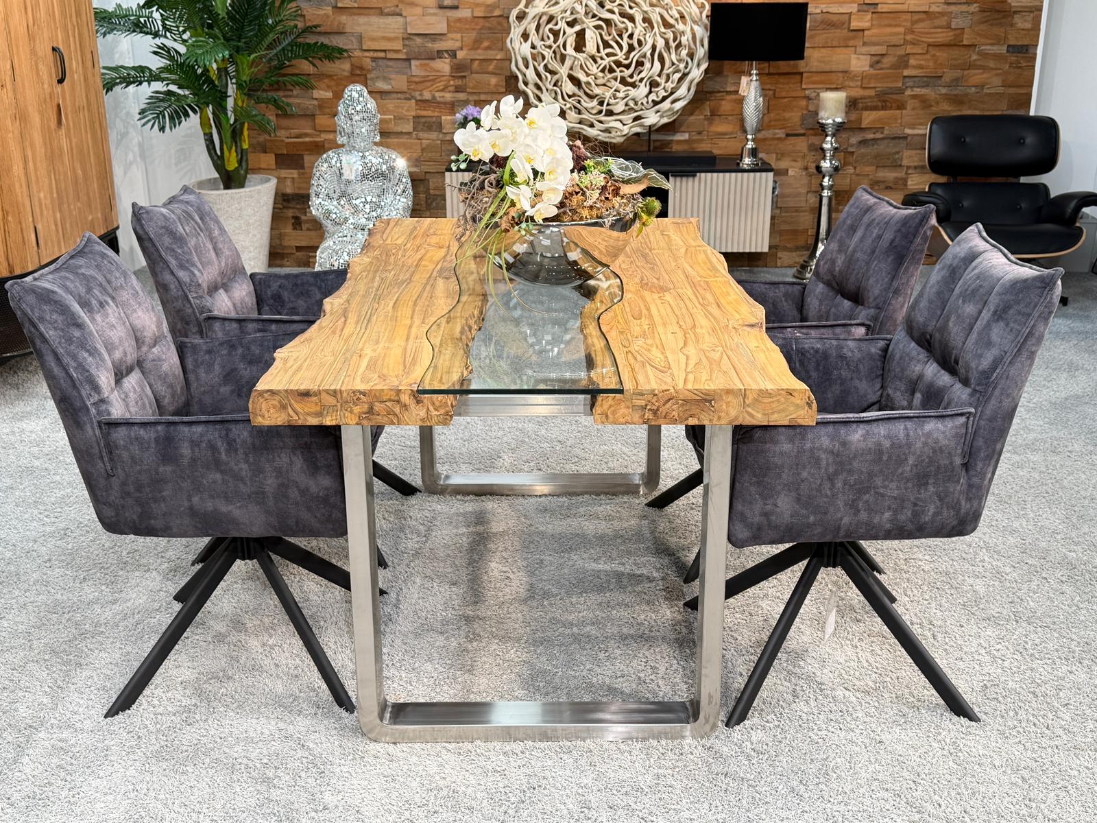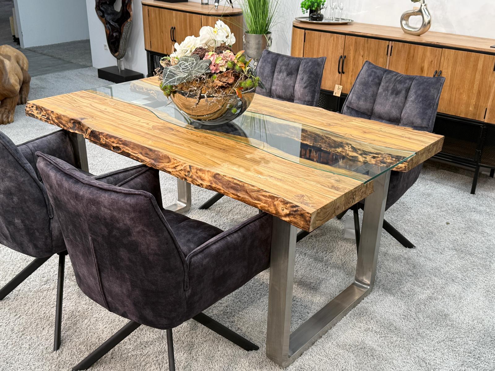Bei diesem Esstisch handelt es sich um eine interessante Kombination aus den Rohstoffen Altholz, Glas und Edelstahl. Verwendet wurden verleimte Altholzbohlen aus Teak. Durch die Verwendung von Altholz erhält dieser Esstisch seine ganz besondere Optik. Die von Hand zusammengefügte Tischplatte liegt auf zwei eigens angefertigten Tischkufen aus gebürstetem Edelstahl.
