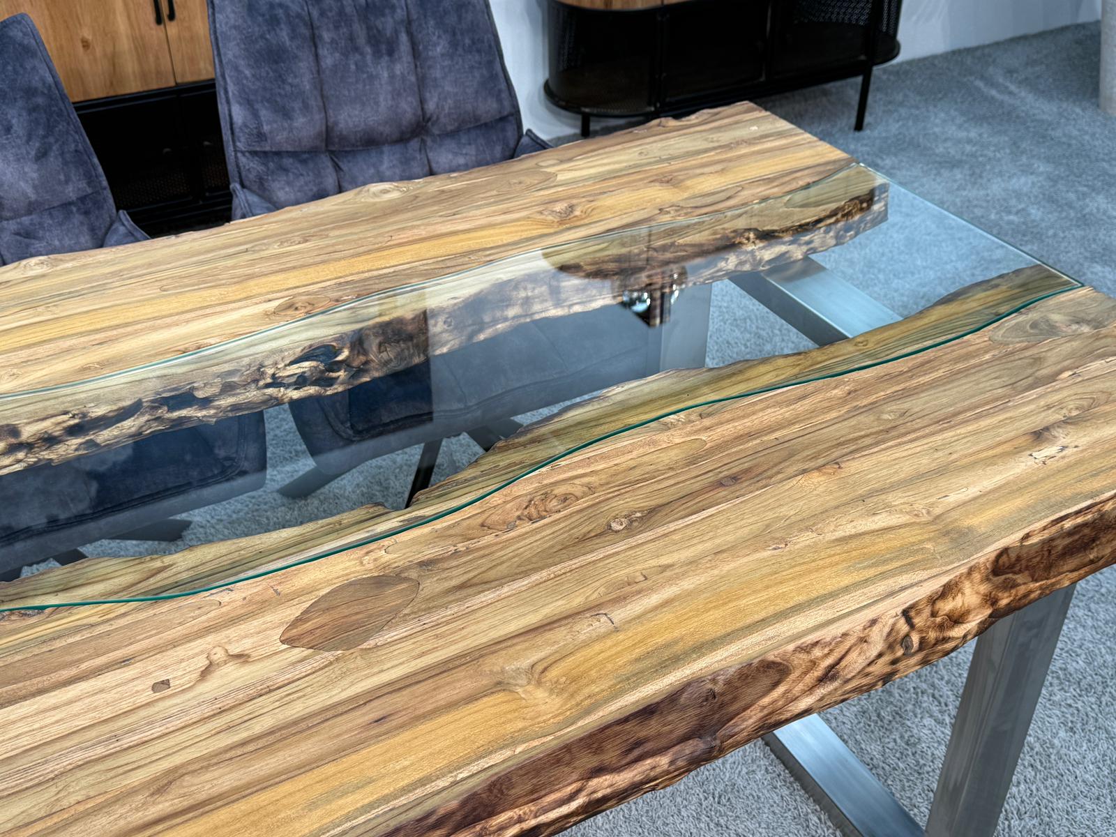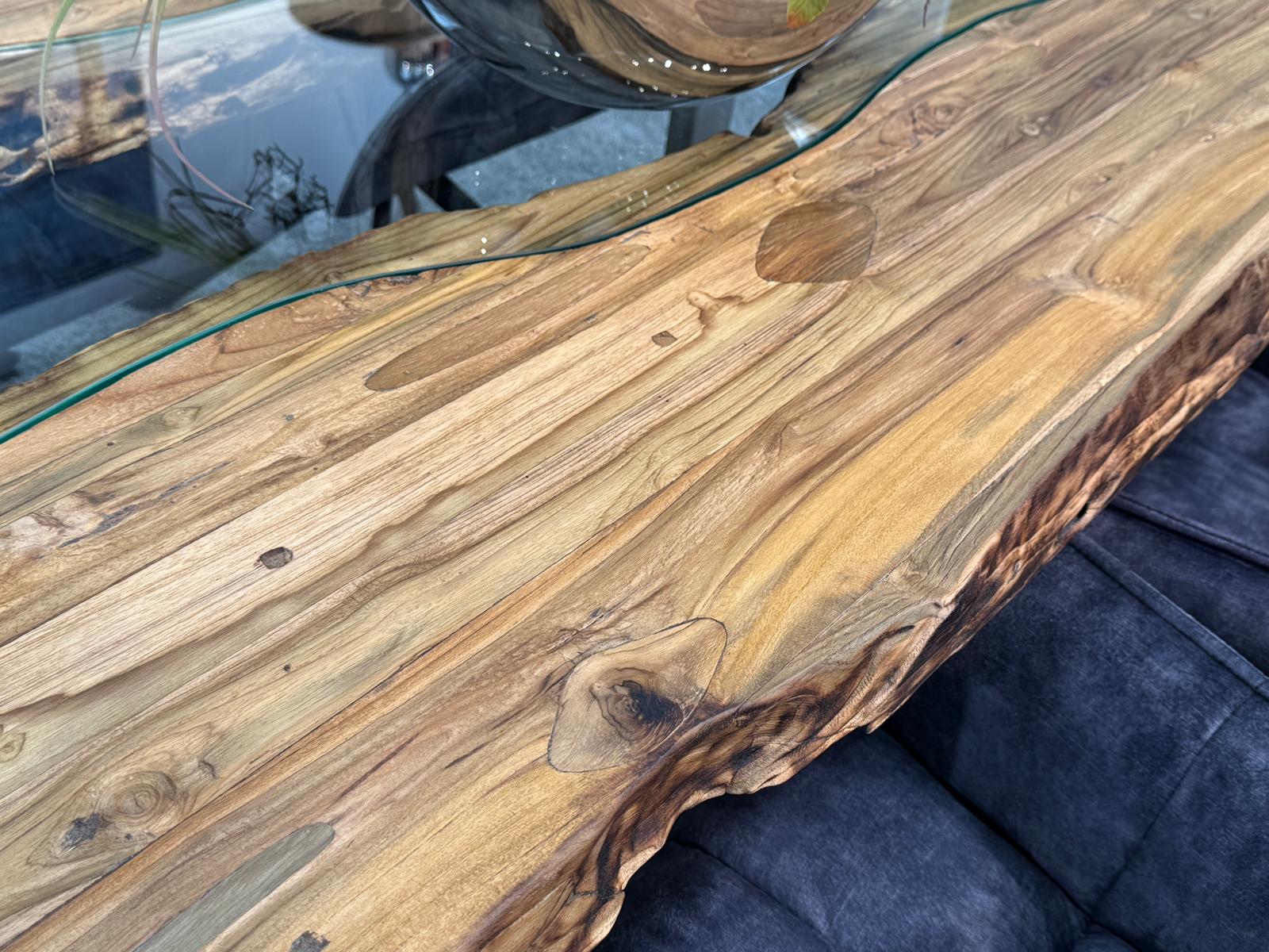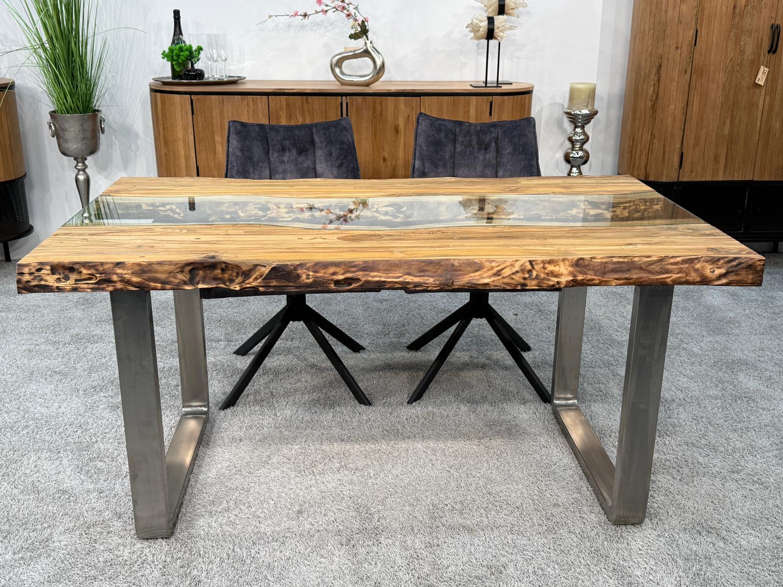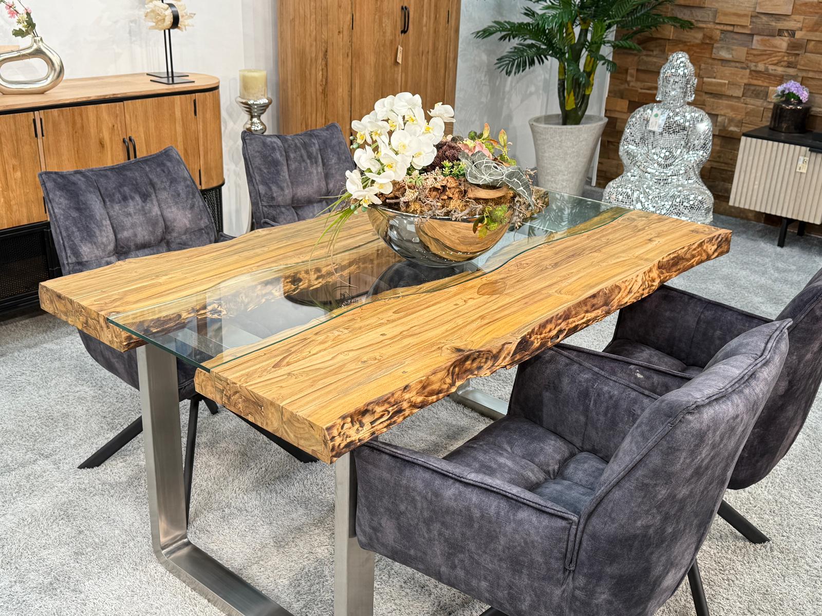 Bei diesem Esstisch handelt es sich um eine interessante Kombination aus den Rohstoffen Altholz, Glas und Edelstahl. Verwendet wurden verleimte Altholzbohlen aus Teak. Durch die Verwendung von Altholz erhält dieser Esstisch seine ganz besondere Optik. Die von Hand zusammengefügte Tischplatte liegt auf zwei eigens angefertigten Tischkufen aus gebürstetem Edelstahl.
