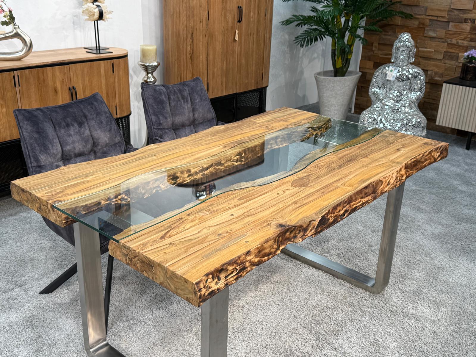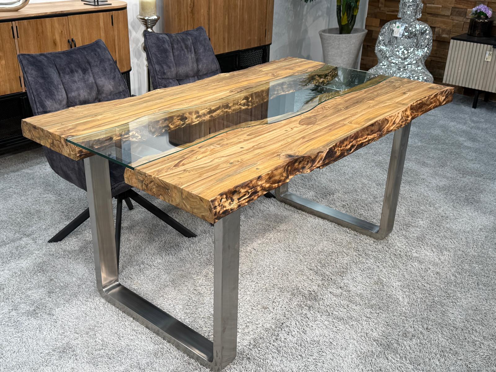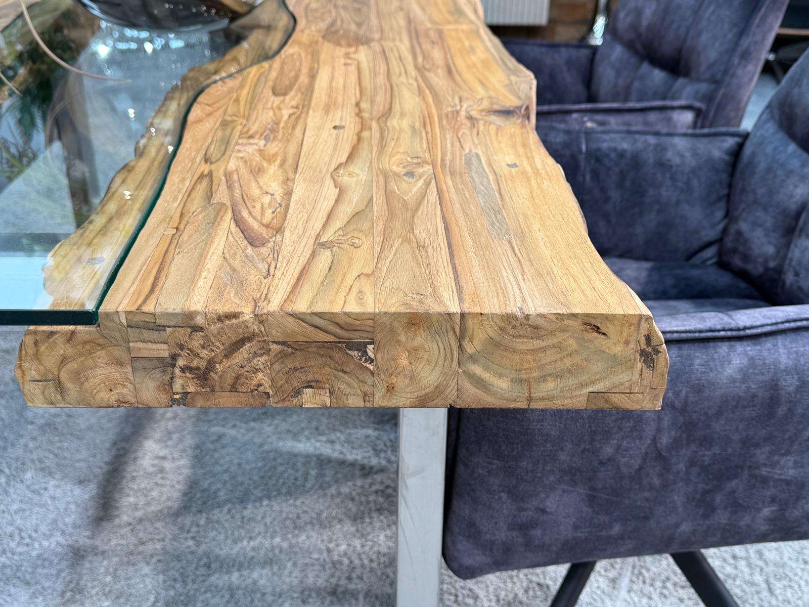 Esstisch "Old Elements" mit Glaseinlage ca. 160 x 90 x 78 cm aus recycelten Teakholzbohlen und Edelstahlgestell