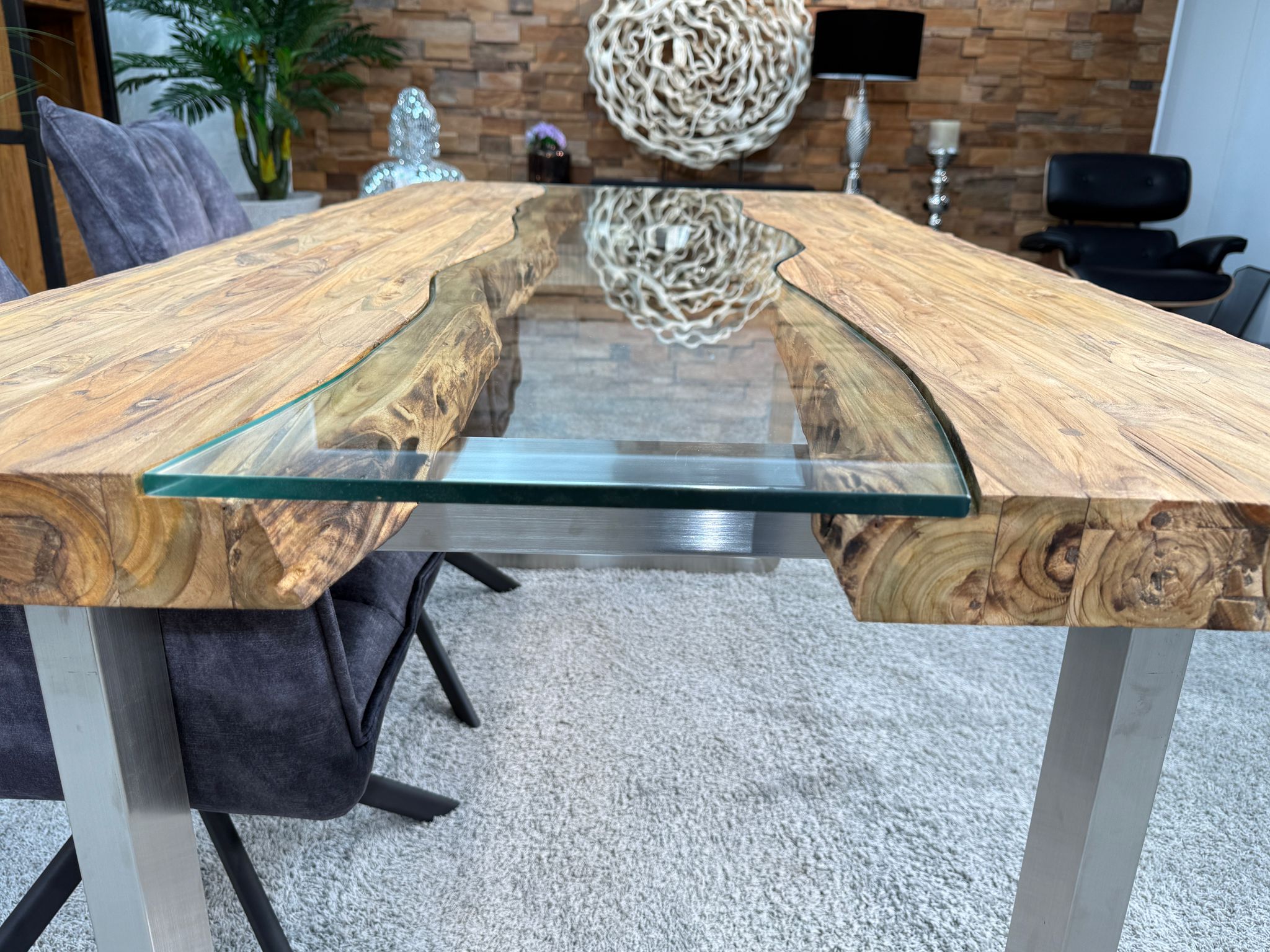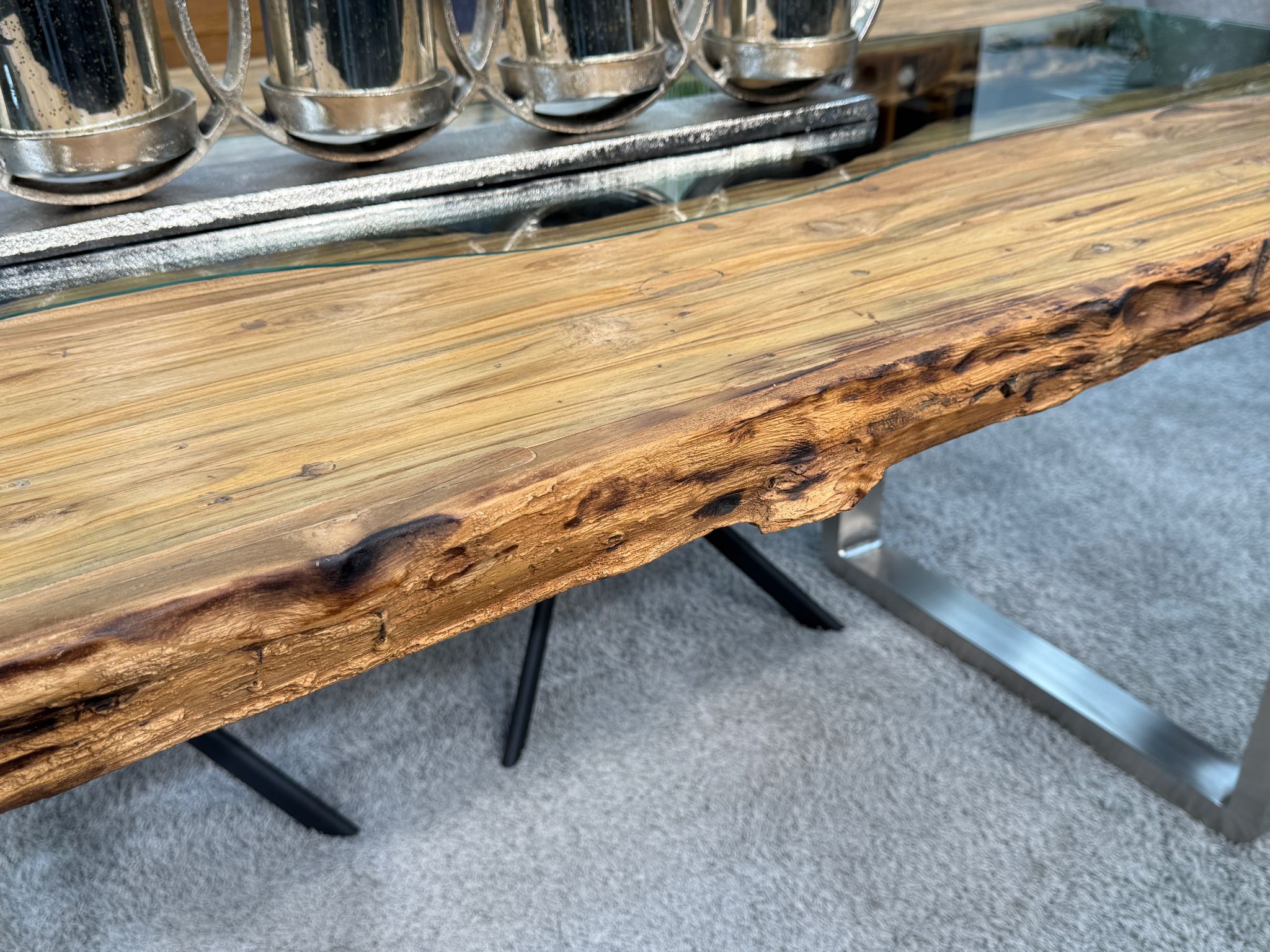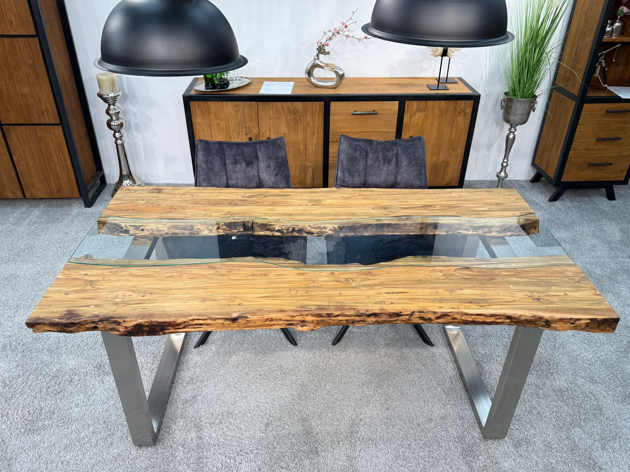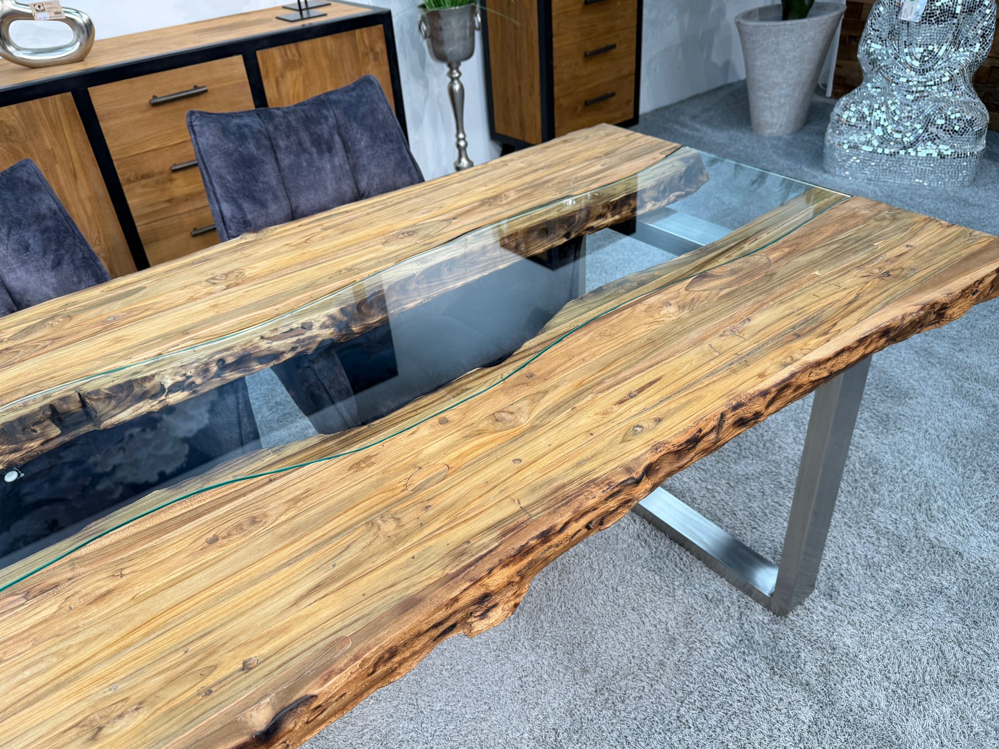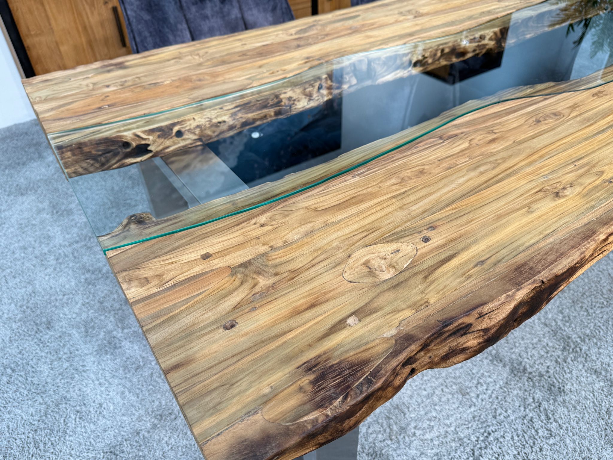 Ein besonderes Highlight ist die mittig eingearbeitete Glasplatte, die die Struktur eines Flusslaufs nachbildet. Dieses Detail hebt die natürliche Maserung des Holzes hervor und schafft eine gelungene Verbindung zwischen rustikalem Charme und modernem Design.