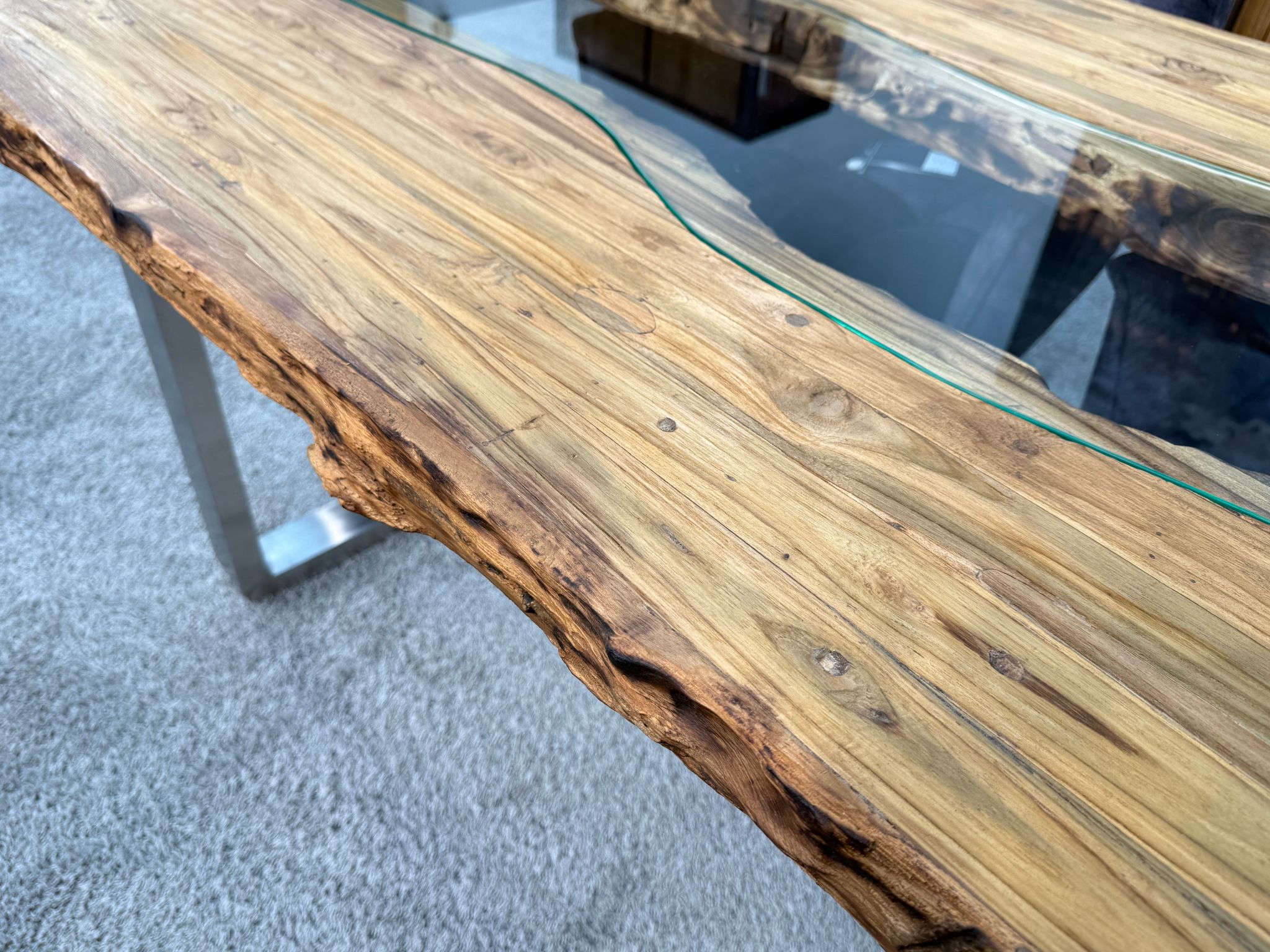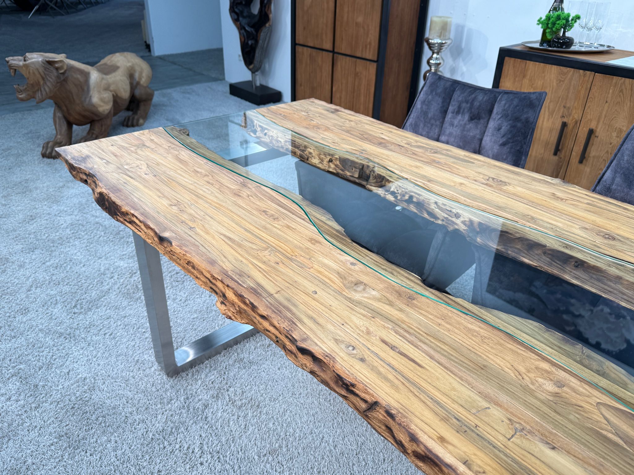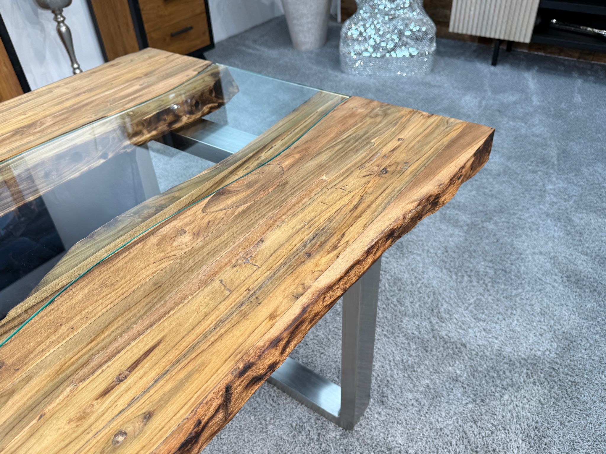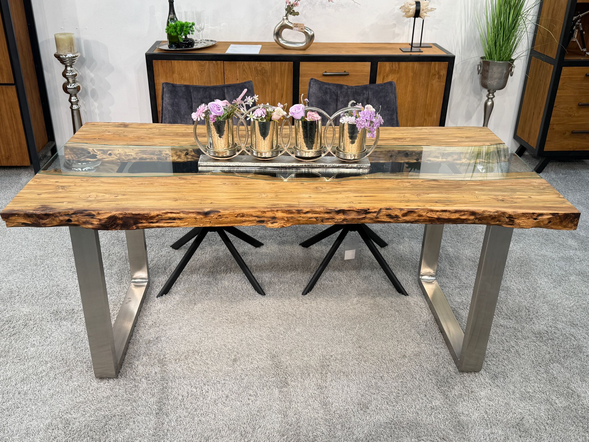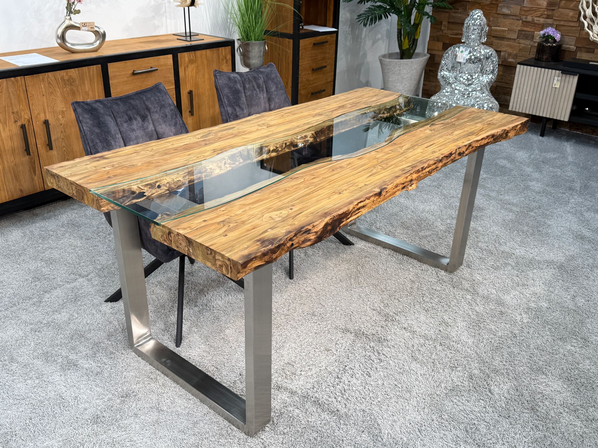 Ein besonderes Highlight ist die mittig eingearbeitete Glasplatte, die die Struktur eines Flusslaufs nachbildet. Dieses Detail hebt die natürliche Maserung des Holzes hervor und schafft eine gelungene Verbindung zwischen rustikalem Charme und modernem Design.