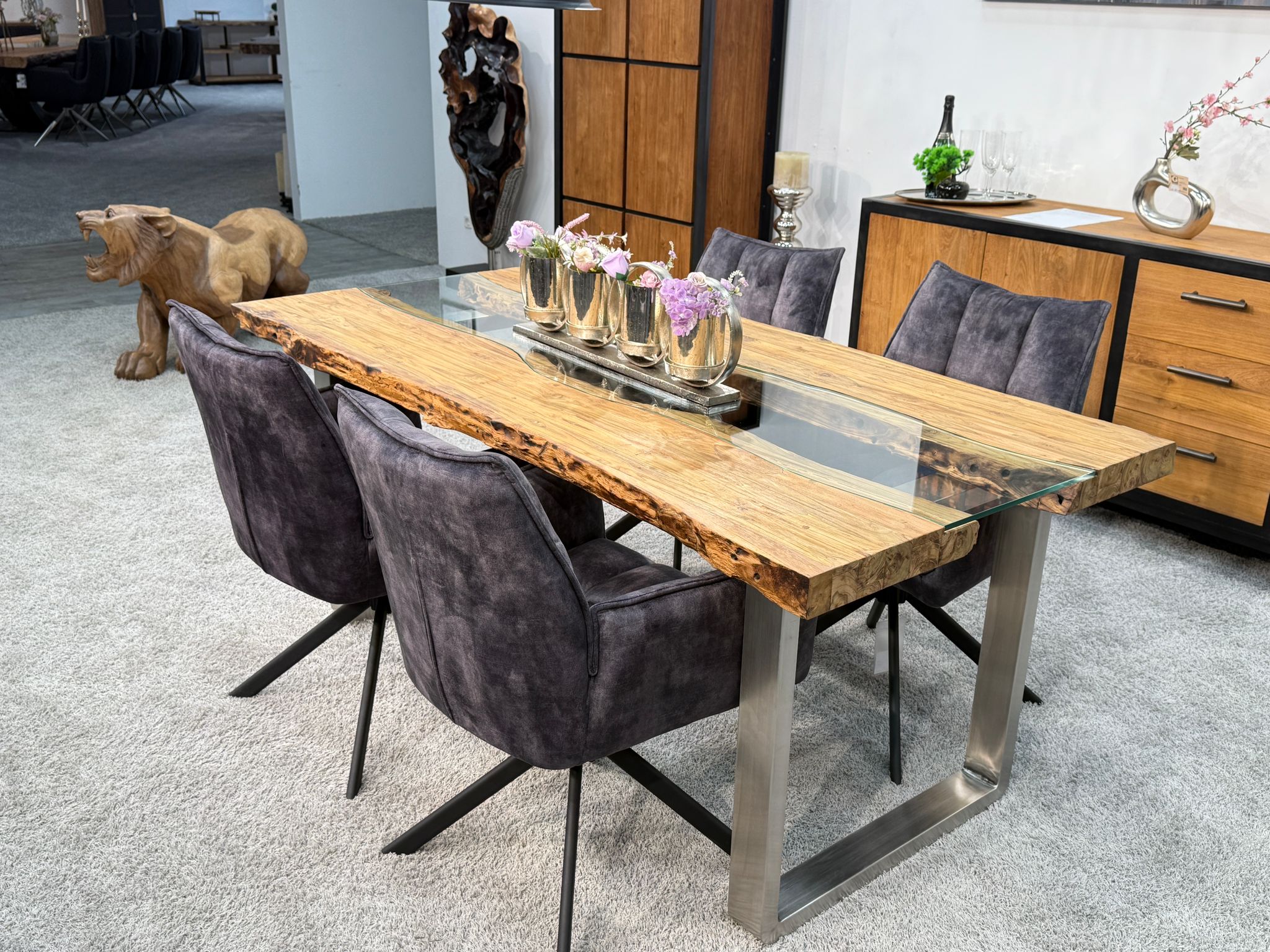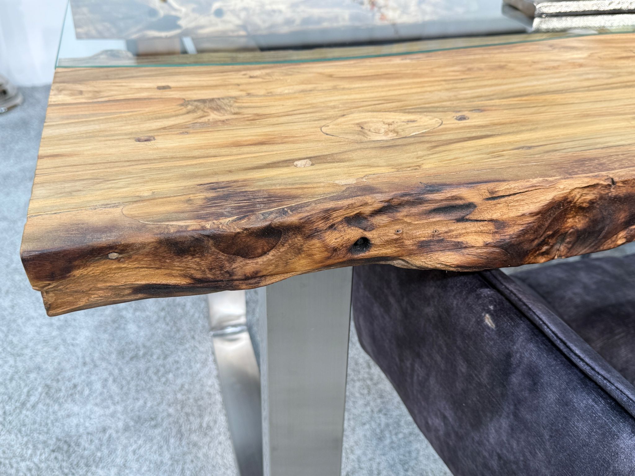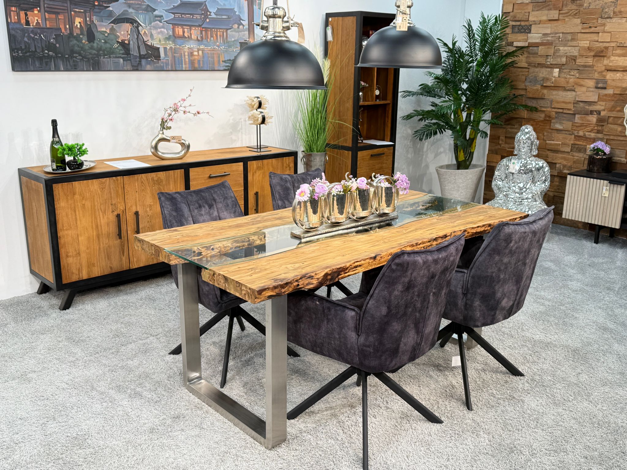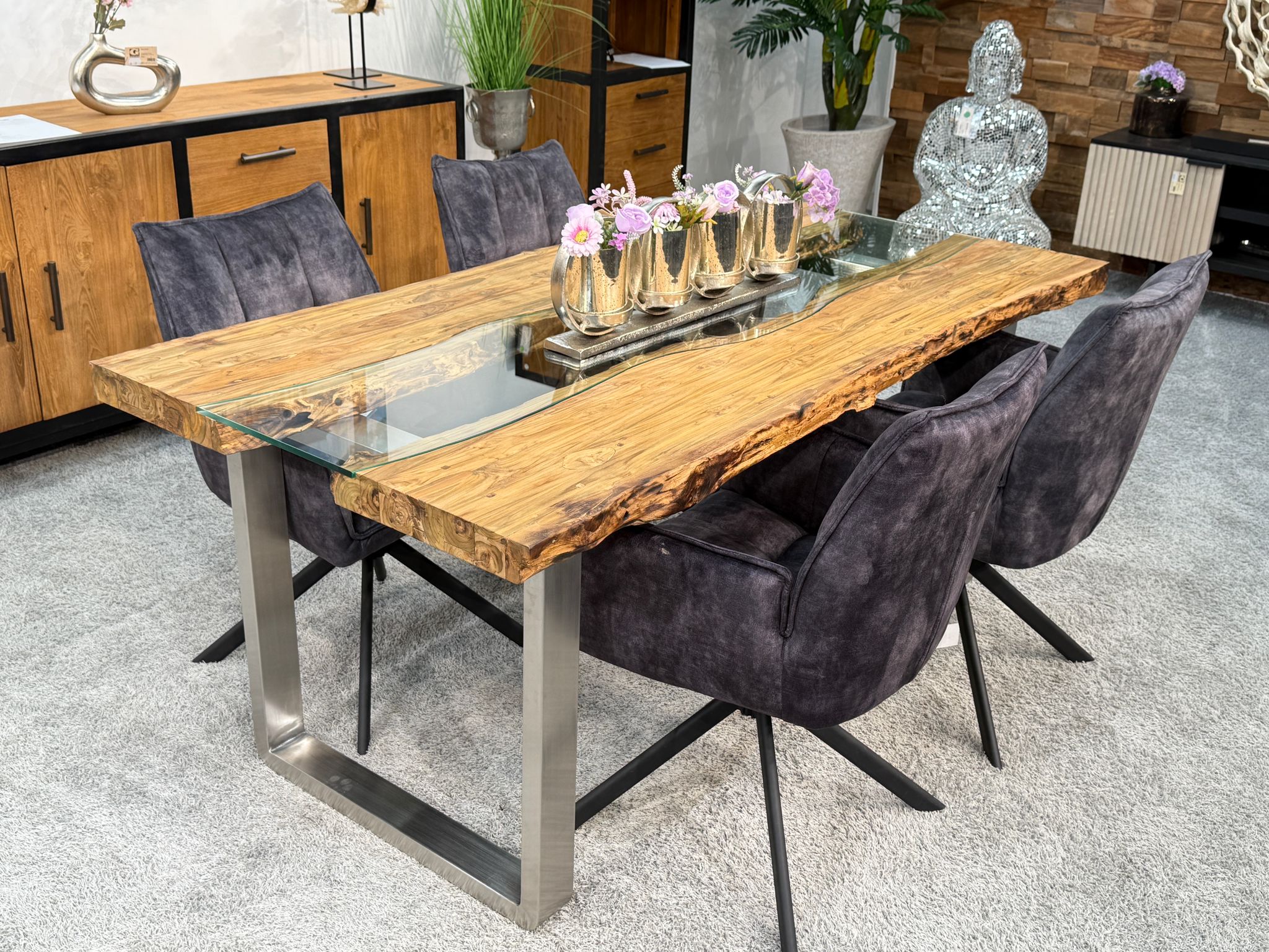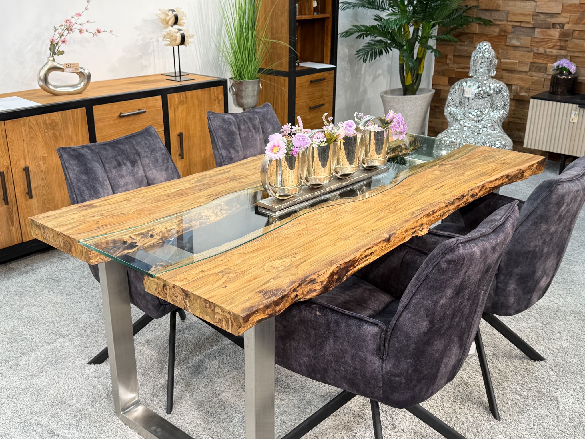 Ein besonderes Highlight ist die mittig eingearbeitete Glasplatte, die die Struktur eines Flusslaufs nachbildet. Dieses Detail hebt die natürliche Maserung des Holzes hervor und schafft eine gelungene Verbindung zwischen rustikalem Charme und modernem Design.