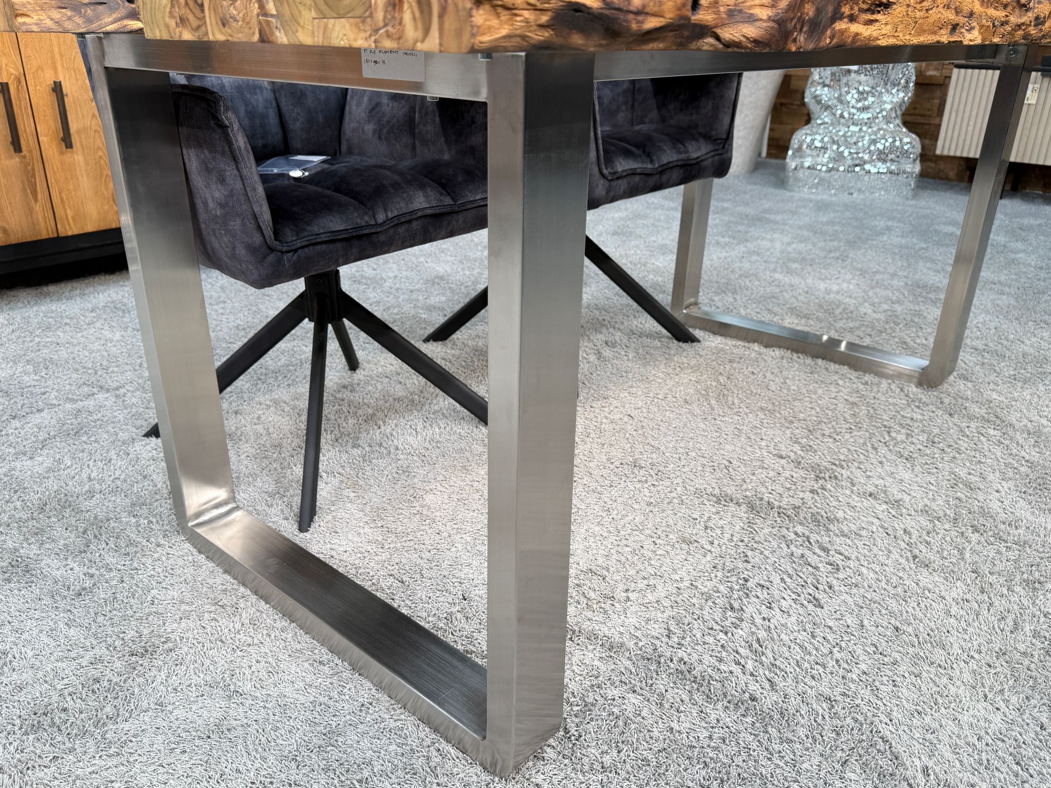 Der Echtholz-Esstisch „Old Elements“ steht auf zwei Tischkufen aus gebürstetem Edelstahl, die für eine moderne Optik und hohe Stabilität sorgen. Die Kombination aus Edelstahl und Massivholz macht diesen Tisch besonders vielseitig und lässt ihn sowohl in modernen als auch rustikalen Einrichtungen perfekt zur Geltung kommen.